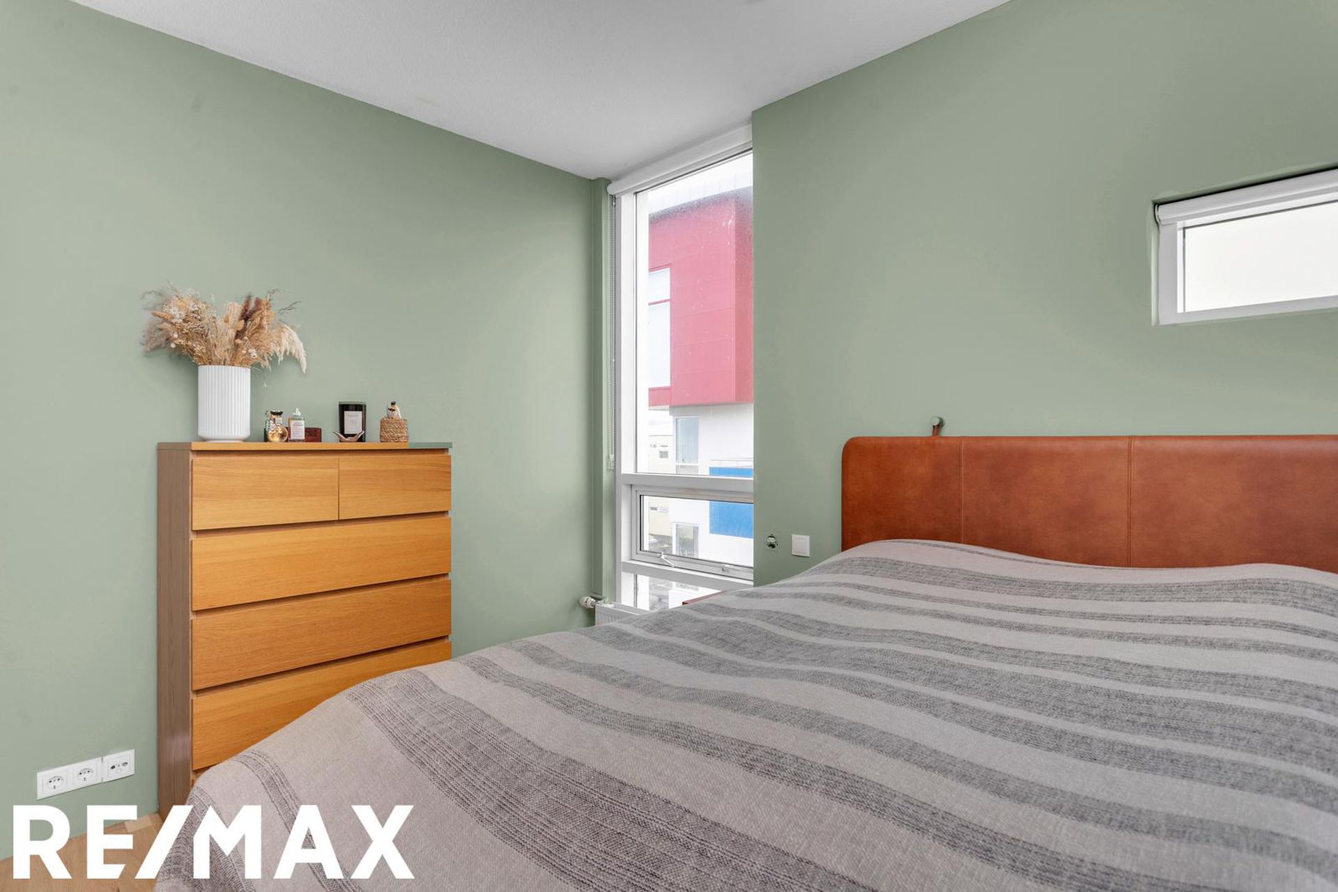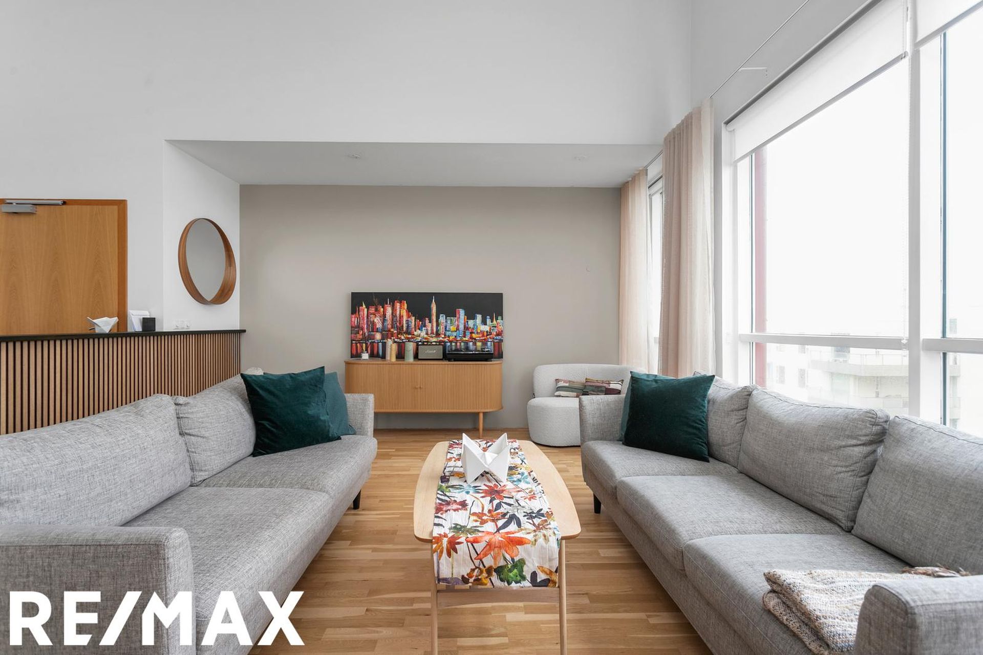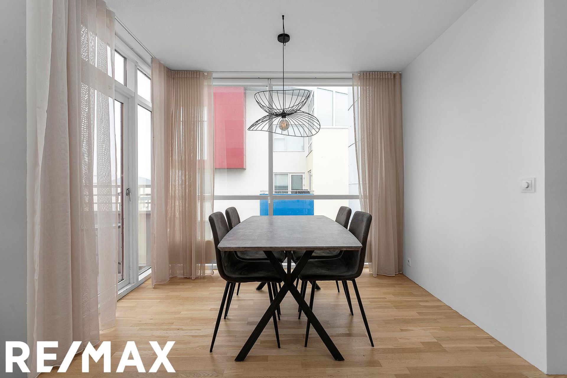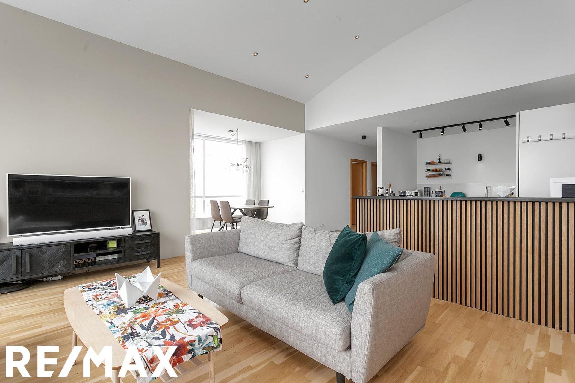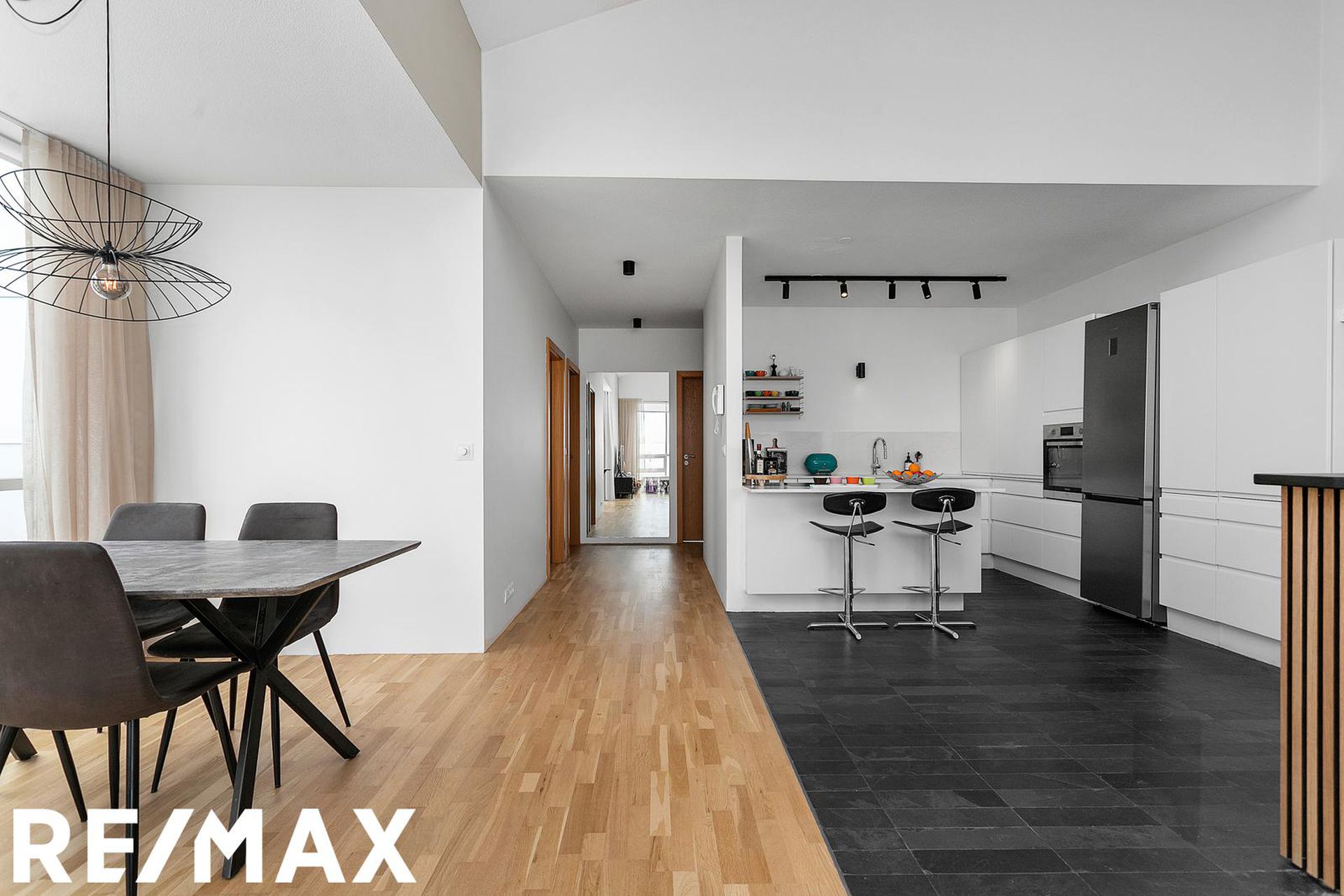 Eldhús, stofa og borðstofa eru í opnu alrými með gólfsíðum gluggum á tvo vegu, mót norðri og vestri. Gengið er út á svalir frá borðstofunni en þær snúa í vestur og sér út á sjó frá þeim.