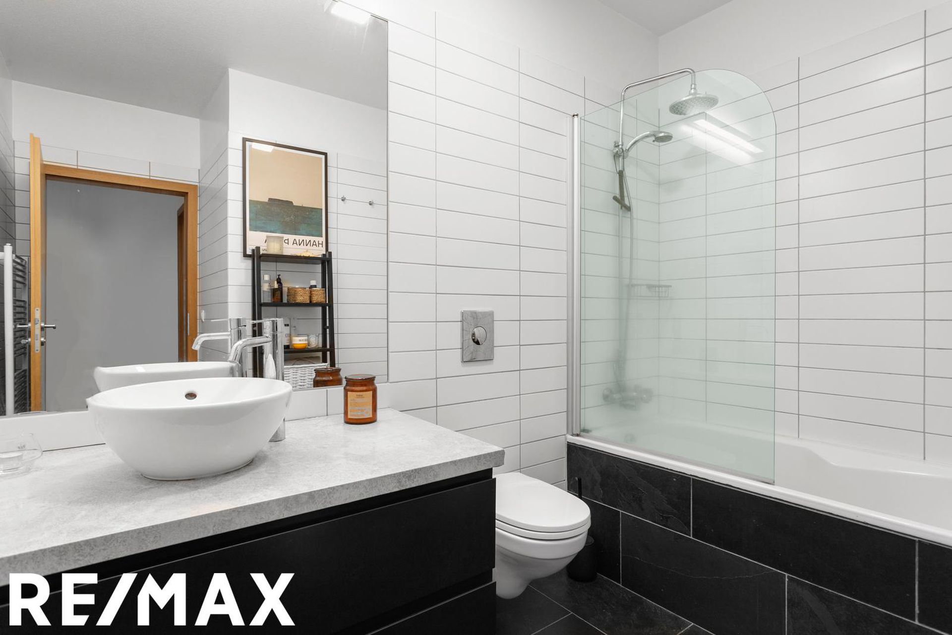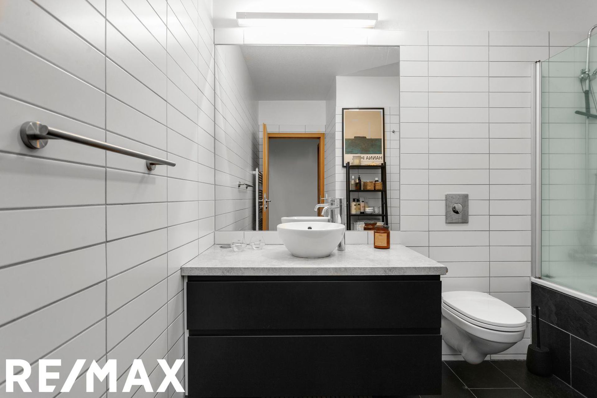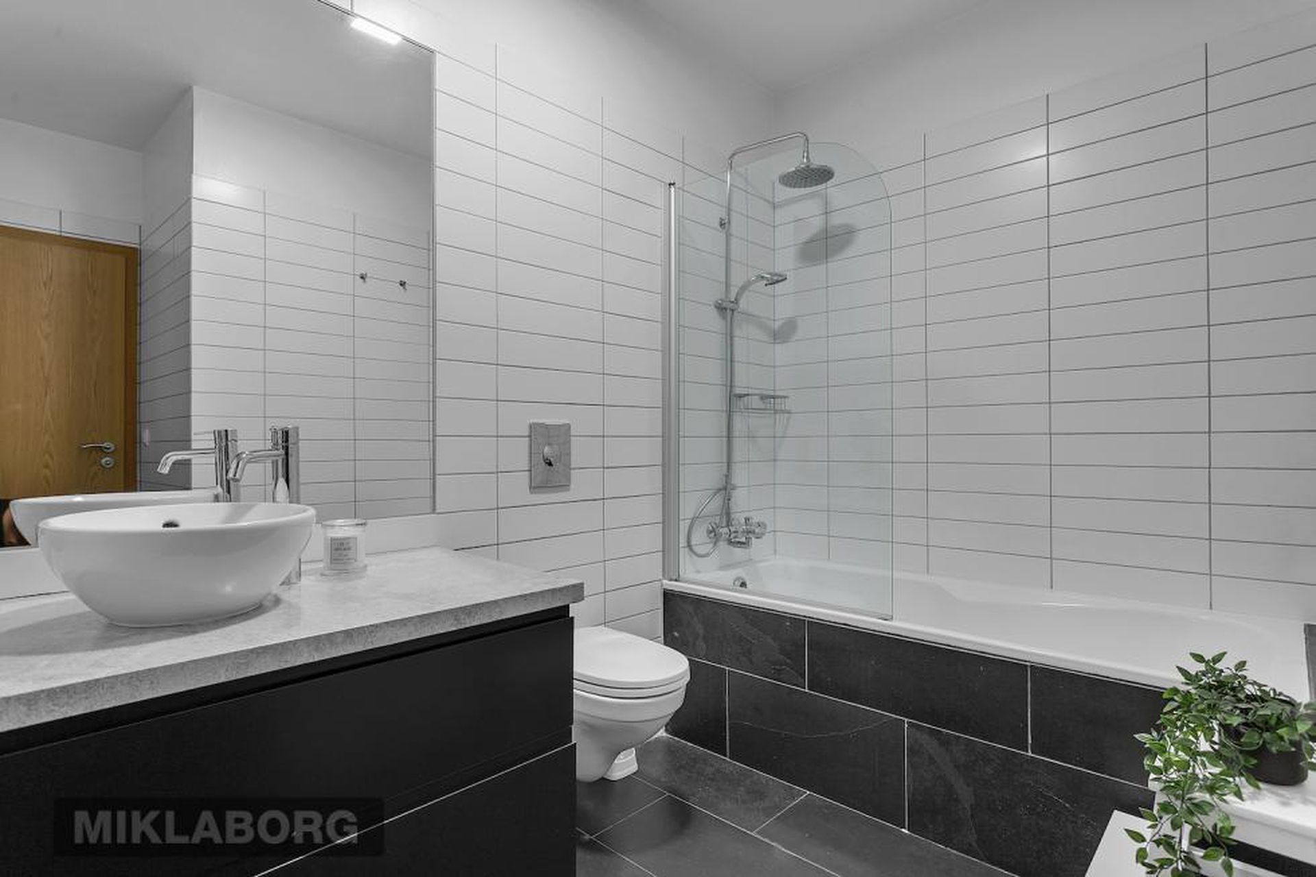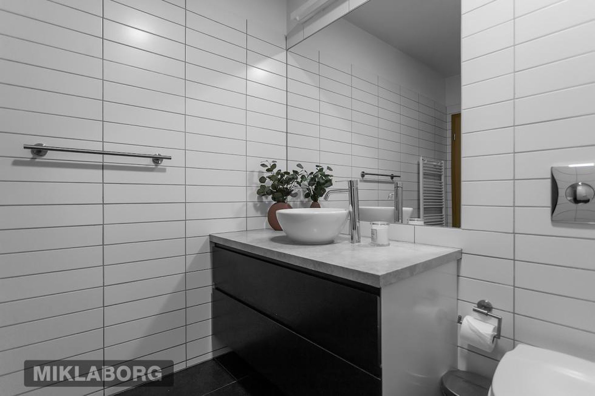 Baðherbergi er mjög rúmgott með stórri innréttingu með góðu skúffuplássi og rúmgóðum endaskáp. Granít er á borðplötum. Upphengt salerni, handklæðaofn og baðkar með sturtuaðstöðu.