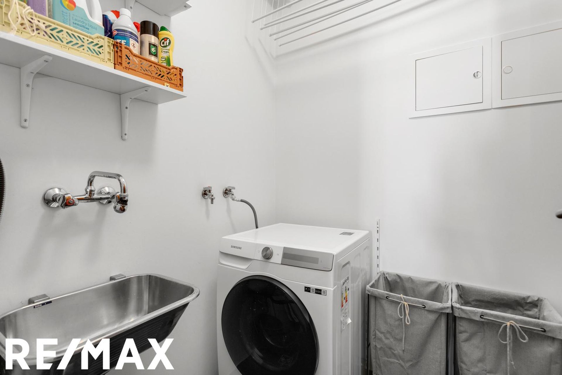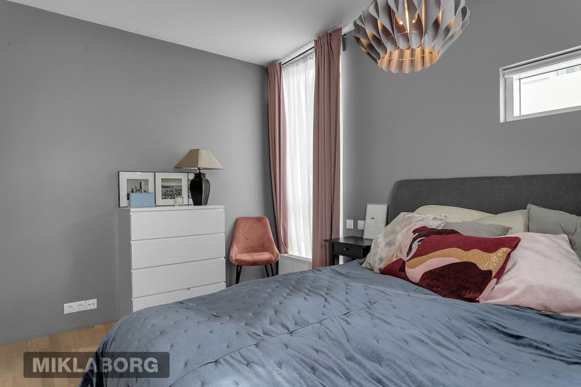 Hjónaherbergi er rúmgott með gangi/holi með fataskápum. Inn af því er flísalagt þvottahús með tengi fyrir þvottavél og þurrkara, auk þess sem lagt er fyrir vask og blöndunartæki.