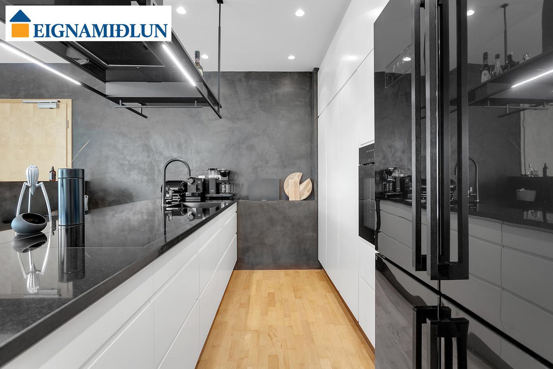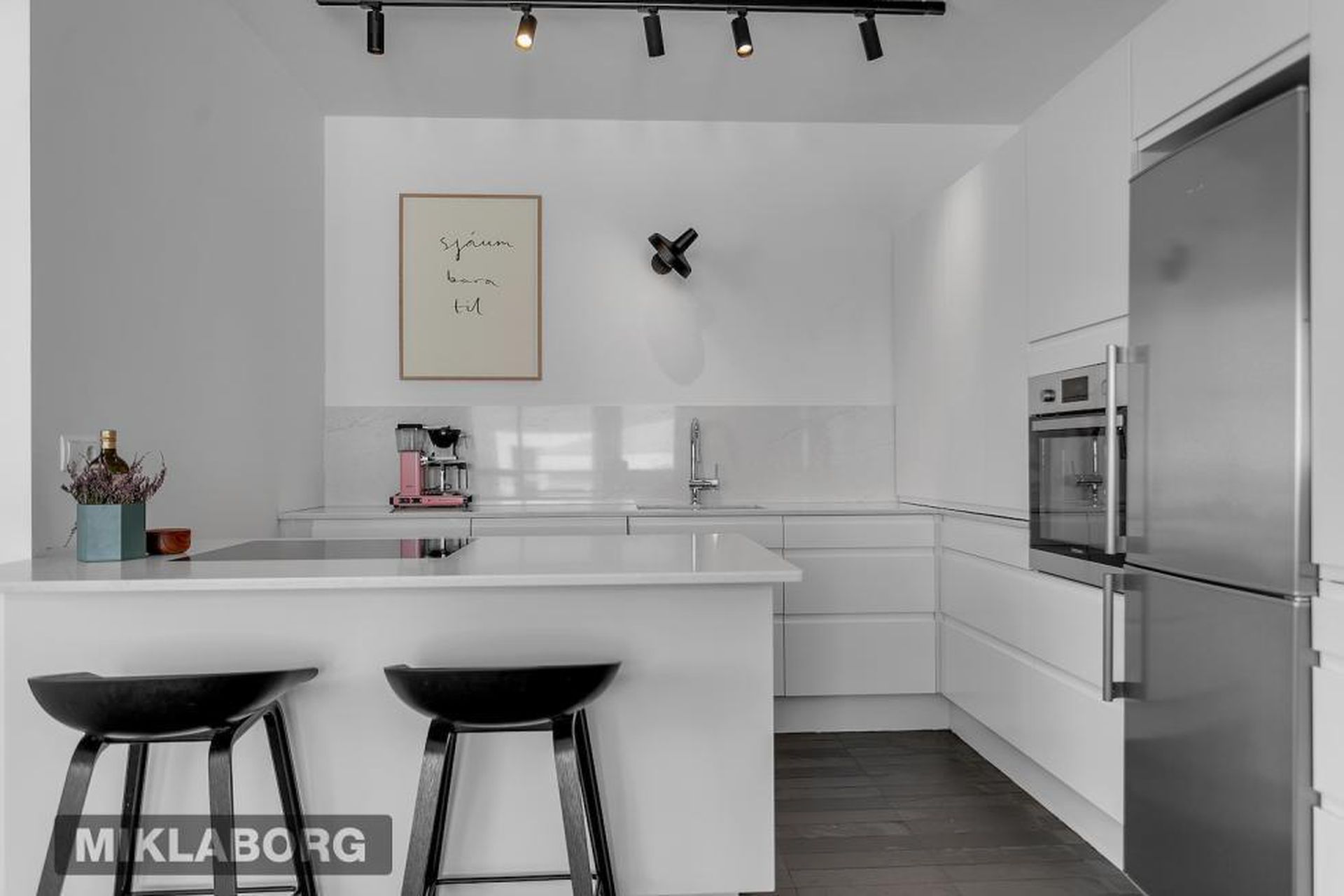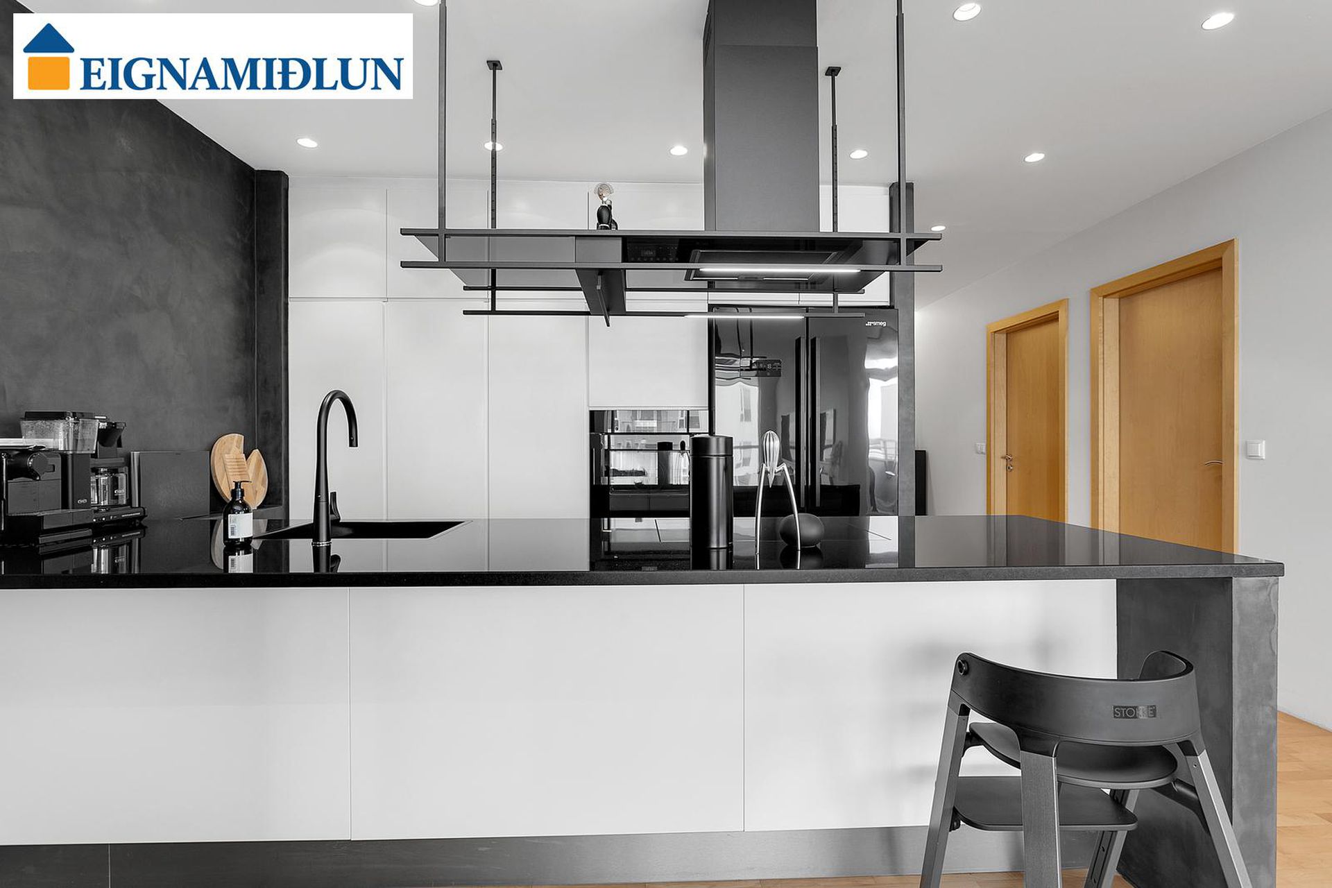 Eldhúsið er með vandraðri Brúnás innréttingu með nýlegum, vönduðum eldhústækjum frá Miele, granít bekkplötur og góðu skápaplássi. Áföst stór eyja sem nýtist vel sem vinnuborð og góð tenging við alrými eldhúss,stofu og borðstofu.
