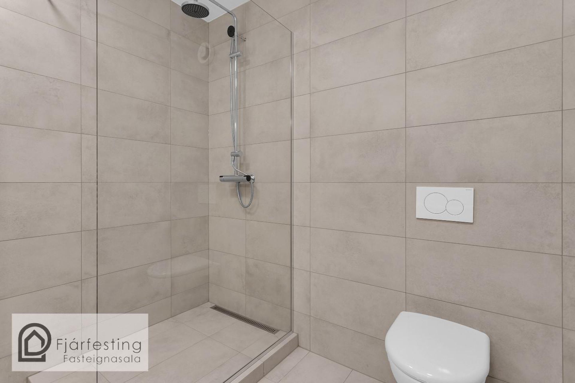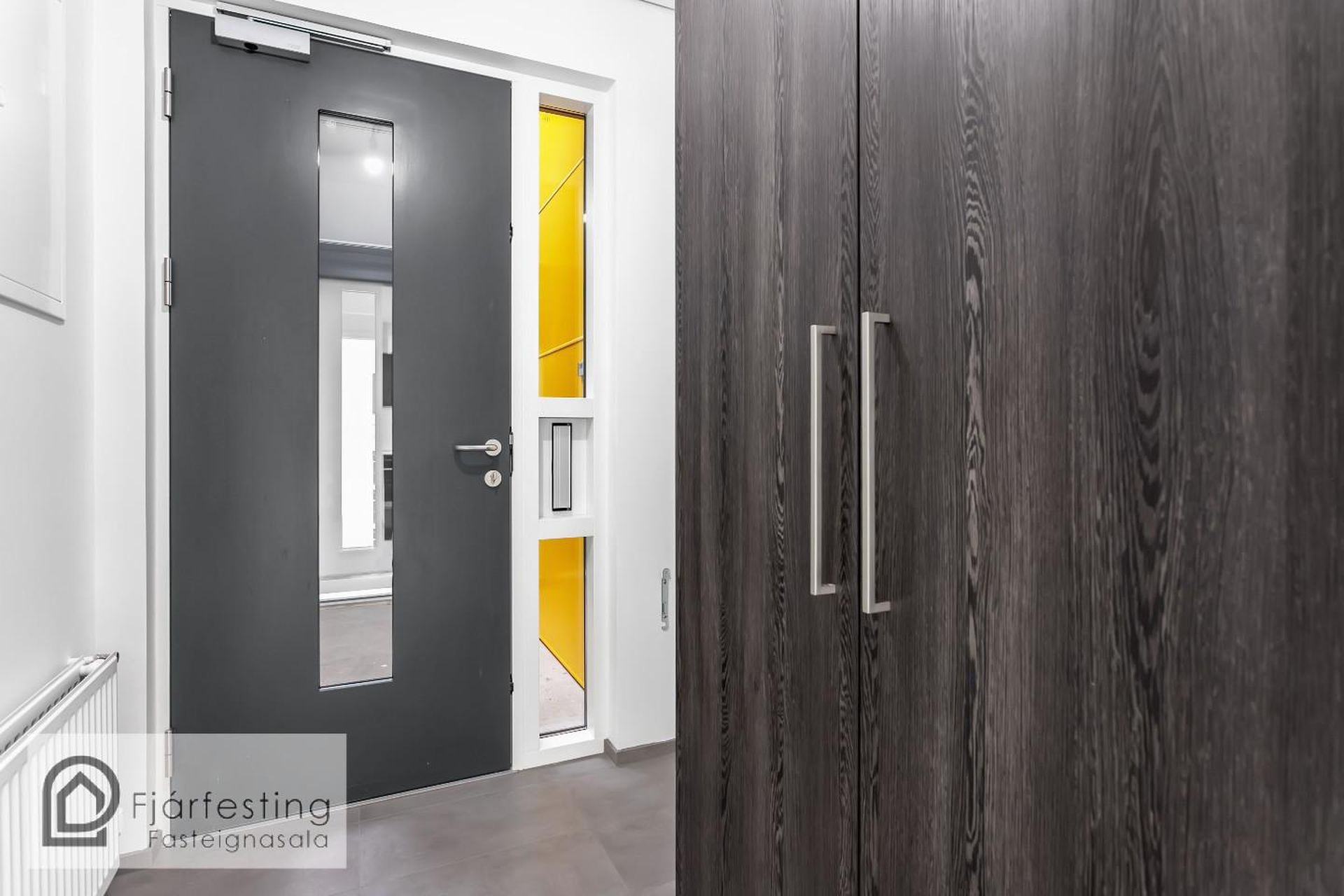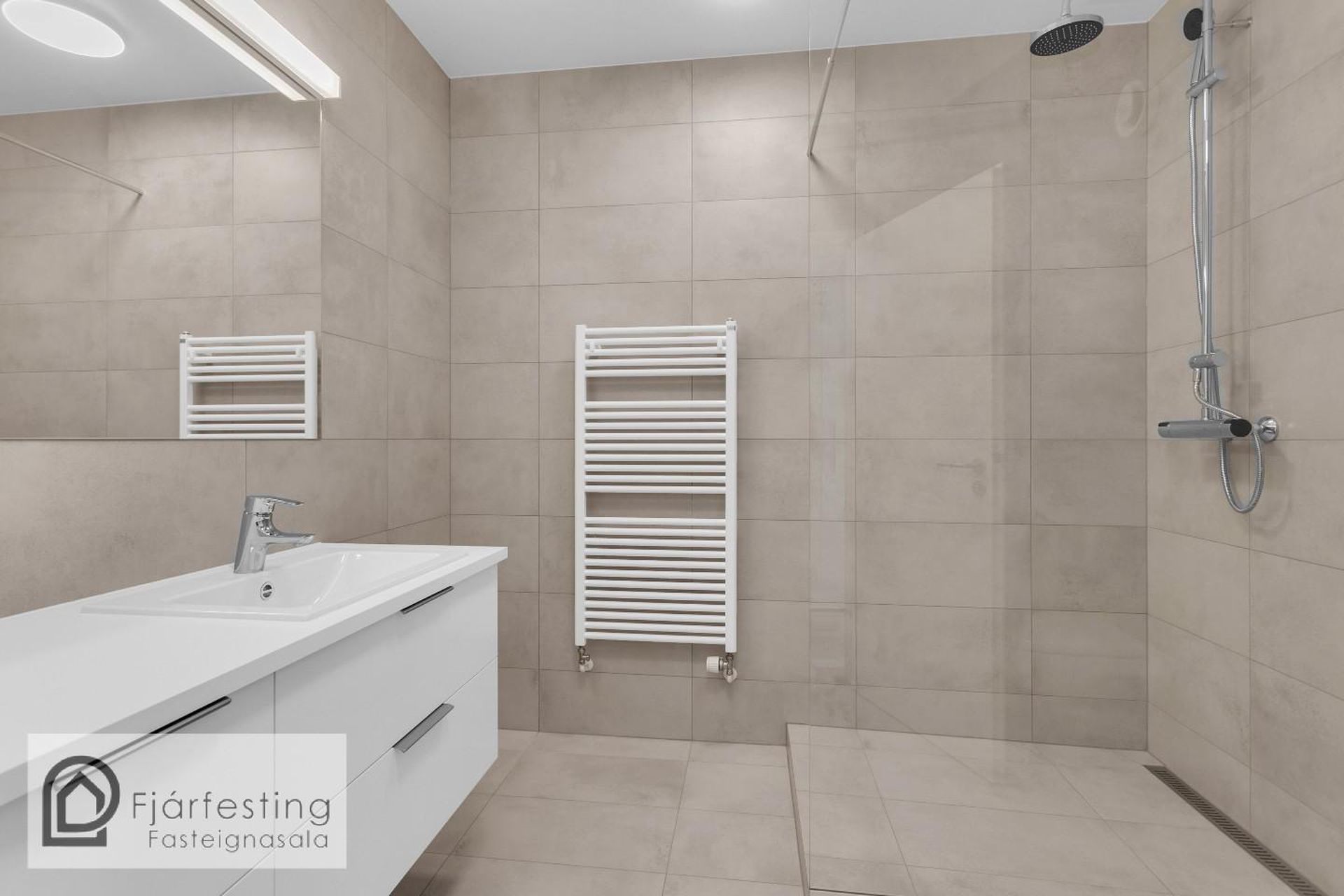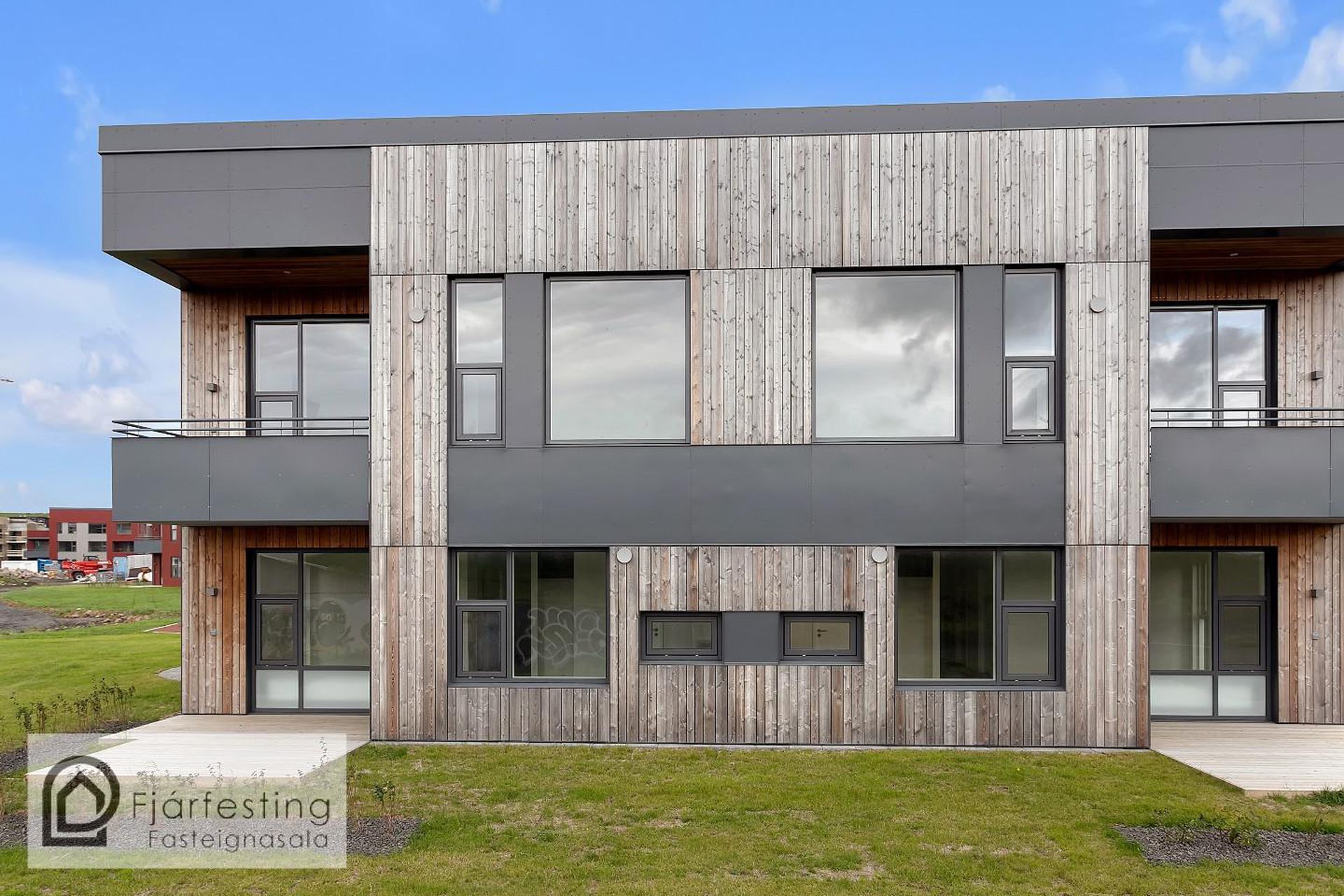 FJÁRFESTING FASTEIGNASALA, SÍMI 562-4250, ER MEÐ TIL SÖLU GLÆSILEGAR ÍBÚÐIR Í SKARÐSHLÍÐARHVERFINU Í HAFNARFIRÐI. Vandaðar 3ja - 4ra herbergja íbúðir að Skarðshlíð 1-7 í Hafnarfirði. Fjölbýlishús með sérinngangi. Glæsilegar innréttingar og fataskápar frá Brúnás.Skarðshlíð 1-7 eru ný 2ja hæða fjölbýlishús í Skarðshlíðarhverfinu í Hafnarfirði.Nánari upplýsingar hjá Óskari í síma 822-8750 Nánari lýsing:Um er að ræða 4ra herbergja íbúð, 94,4 fm. á 2. hæð, merkt 0202 að Skarðshlíð 1 í Hafnarfirði. Íbúðinni fylgja svalir og bílastæði á lóð.SKILALÝSING:STUÐLASKARÐ 1, 3, 5 OG 7 - SKILALÝSING1 Frágangur innanhúss1.1 Gólfefni Íbúðin sjálf verður afhent að mestu án gólfefna. Gólf á baðherbergi, þvottahúsi og anddyri eru flísalögð með 300*600 mm flísum. Flísar eru frá Álfaborg1.2 Veggir Útveggir íbúða eru ýmist einangraðir og pússaðir eða slípaðir og síðan sandsparslaðir. Léttir innveggir eru hlaðnir úr vikur- eða gjallplötum, grófpússaðir og sandsparslaðir. Eftir það eru allir veggir grunnaðir og málaðir með tveimur yfirferðum af plastmálningu, gljástig 7% eða sambærilegt. Veggir á snyrtingu eru flísalagðir með 300*600 mm flísum. Flísar eru frá Álfaborg1.3 Loft Steypt loft eru slípuð, sandspörsluð, grunnuð og máluð með tveimur yfirferðum af plastmálningu, gljástig 2 eða sambærilegt. Loft og veggir á baðherbergjum og þvottahúsum eru máluð með viðurkenndri votrýmismálningu.1.4 Gluggar og gler Gluggar eru ál-trégluggar, framleiðandi Börkur hf. Gler í öllum gluggum er tvöfalt hefðbundið verksmiðjuframleitt K-gler. Framleiðandi glers er Samverk og er ábyrgð glers samkvæmt þeirra skilmálum sem glerframleiðanda. Við kaup íbúðar yfirtekur kaupandi/kaupendur ábyrgð framleiðanda.1.5 Sólbekkir Sólbekkir, þar sem þeir koma eru úr plastlögðum spónaplötum.1.6 Hurðar Útihurðar eru ýmist með brunaþol E30C eða ekki, framleiðandi Börkur hf. Hurðarpumpur á E30C útihurðum eru af tegundinni GEZE TS3000V með sleða. Svalahurðar eru ál/tré með gleri í álfalsramma, framleiðandi Börkur. Innihurðar eru yfirfelldar, sléttar og sprautulakkaðar hvítar. Innihurðar eru frá Parka.1.7 Fataskápar og geymsluskápar Fataskápar eru í forstofu og svefnherbergjum. Innréttingar eru frá Brúnás. Innmatur er úr ljósgráum plasthúðuðum spónaplötum en sýnilegar hliðar og hurðar eru úr dökku melamin. Geymsluskápar á göngum eru ýmist hefðbundnir skápar eða með lausum hillum í hillukerfi. Hurðar geymsluskápa eru sprautulakkaðar hvítar.1.8 Eldhús Eldhúsinnrétting er að innan úr ljósgráum plasthúðuðum spónaplötum. Neðri skápar og háir skápar eru úr dökku melamin þ.e. hurðar og sýnilegar úthliðar. Yfirskápar eru sprautulakkaðir hvítir þ.e. hurðar og úthliðar. Yfir borðplötu að efri skápum er litað hvítt gler. Borðplötur eru 30 mm þykkar með 0,8 mm gegnheilu plasti. Ekki er ráðlagt að leggja heita hluti beint á plöturnar, nota skal hitaplatta eða sambærilegt.Vaskur er af gerðinni Intra Frame FR520 og blöndunartæki af gerðinni Mora Cera K7, hvoru tveggja frá Tengi. Í innréttingu er AEG spanhelluborð að gerðinni IKB64431XB, AEG veggofn með blæstri af gerðinni BCK456220M, AEG veggháfur af gerðinni F80 BK 60CM S og innbyggð AEG uppþvottavél af gerðinni FSE63607P. Öll tæki eru frá Bræðrunum Ormsson.1.9 Baðherbergi Á baðherbergi er gólf flísalagt ásamt sturtu og veggir flísalagðir að lofti. Innrétting frá Brúnás er að innan úr ljósgráum plasthúðuðum spónaplötum en sýnilegar hliðar og hurðar eru sprautulakkaðar hvítar. Borðplötur eru úr hvítu plasti. Spegill er yfir vaski. Handlaug er af gerðinni Alape EB.R585H, blöndunartæki af gerðinni Mora Cera B5, handklæðaofn, innbyggður vatnskassi og upphengt Geberit Selnova salerni með hæglokandi setu og Mora MMIX blöndunartæki í sturtu. Öll hreinlætistæki verða frá Tengi. Gler er ýmist fyrir allri sturtunni eða með annarri hlið hennar. Tvö niðurföll eru1.10 Þvottahús Gólf í þvottahúsi er flísalagt. Innrétting frá Brúnás er að innan úr ljósgráum plasthúðuðum spónaplötum og sýnilegar hliðar og hurðir úr ljósgráu melamin. Borðplata er harðplastlögð með plastkanti. Í borðplötu er vaskur af gerðinni Intra K400 og blöndunartæki af gerðinni FMMattsson ECO. Niðurfall er í gólfi og tengingar fyrir þvottavél og þurrkara. Gert er ráð fyrir barkalausum þurrkara.1.11 Sérgeymsla Allt geymslurými er innan hverrar íbúðar.1.12 Hitakerfi Íbúðirnar eru upphitaðar með hefðbundinni ofnalögn.1.13 Loftræsti-, vatns- og þrifalagnir Loftræsti-, vatns, - og þrifalagnir fylgja frágengnar skv. teikningum. Forhitari er á heitu neysluvatni.1.14 Rafmagns- og sjónvarpslagnir Rafmagns- og sjónvarpslögn fylgja frágengnir og hefðbundin dyrabjalla er í hverri íbúð. Loftnets- og tölvutengill verður í alrými. Tölvutenglar verða í herbergjum. Ljósleiðari verður í húsinu. Innfelld lýsing með dimmum er í hluta af alrými þ.e. stofu og eldhúsi þar sem það á við. Fer eftir gerð lofta í íbúðum. 2. Frágangur sameignar 2.1 Hjóla- og vagnageymslur Steyptir innveggir í hjóla- og vagnageymslu eru hreinsaðir slípaðir og málaðir. Gólf eru slípuð og lögð epoxy.2.2 Sorp Sameiginleg hellulögð sorpsvæði eru fyrir hver tvö hús. Á hverju sorpsvæði eru 6 stk steypt sorptunnuskýli frá BM Vallá með timburklæddum lokunum þ.e. hurðum að framan og hlera að ofan. Pumpa er á hlerum og seglar í keðju sem festast á gámalokin og auðvelda opnun sorpgáma. Í hvert skýli er gert ráð fyrir að komi sorpgámur á hjólum, hver um 660 l að stærð.3. Frágangur utanhúss3.1 Klæðning og einangrun Útveggir eru einangraðir ýmist að utan- eða innanverðu ef