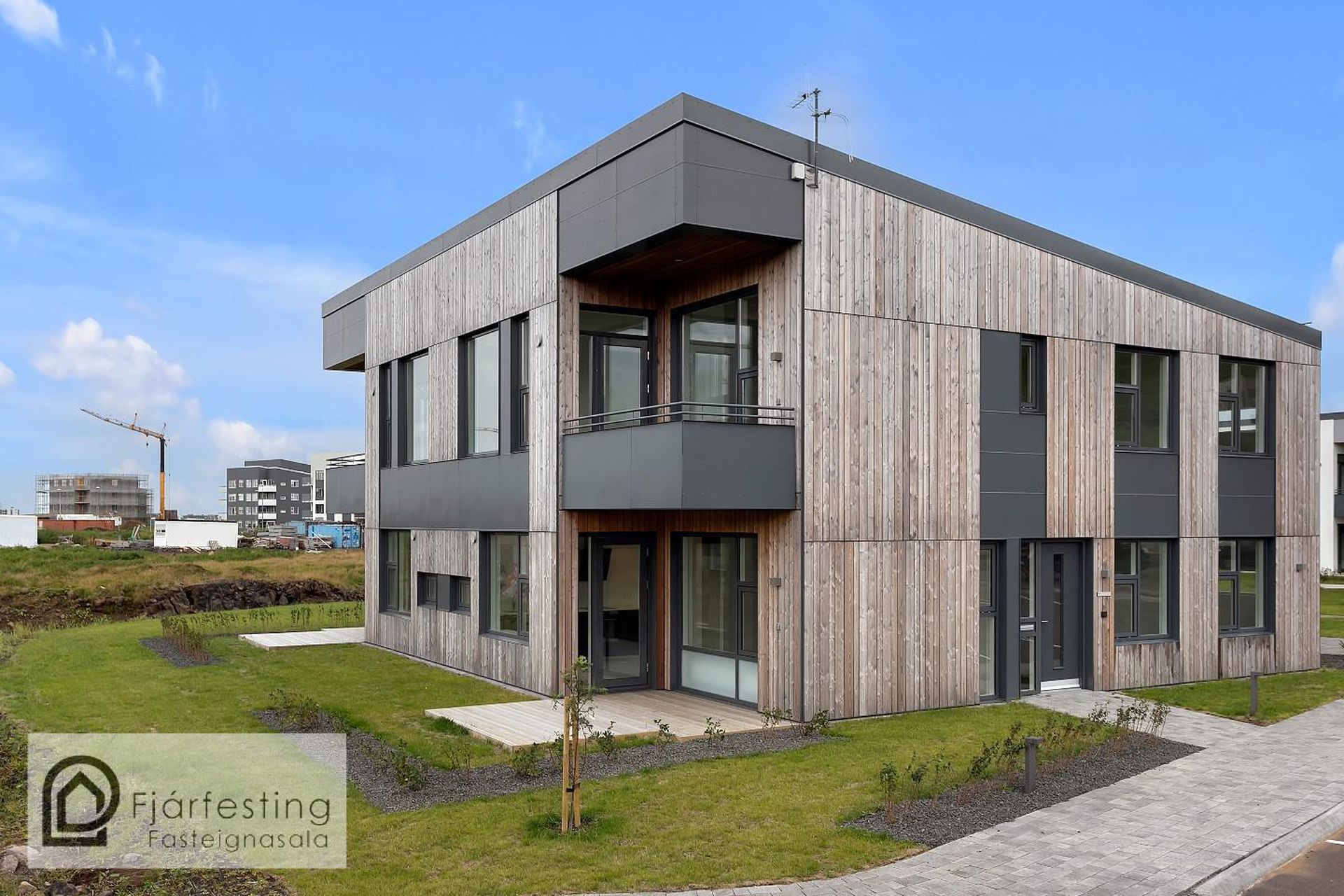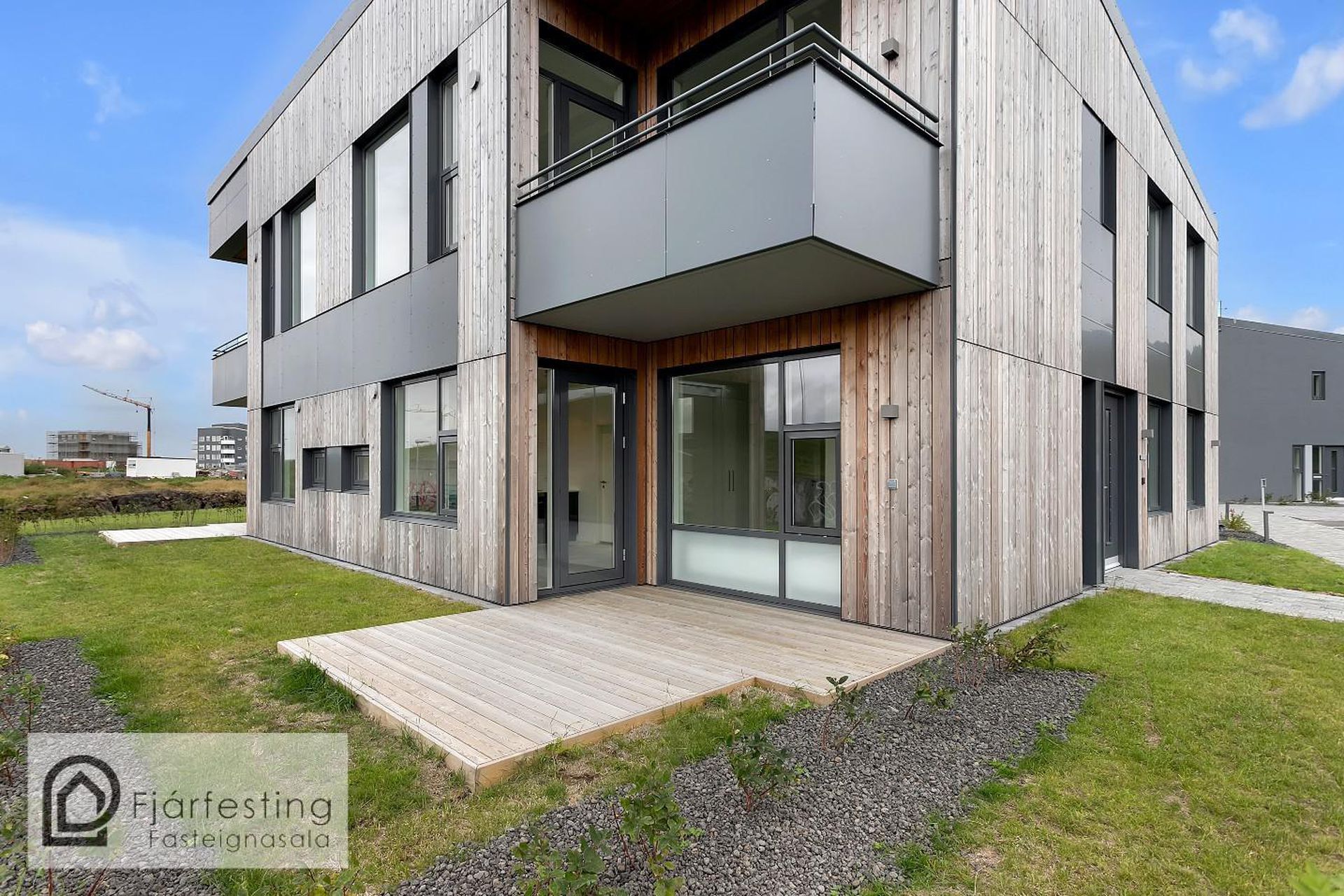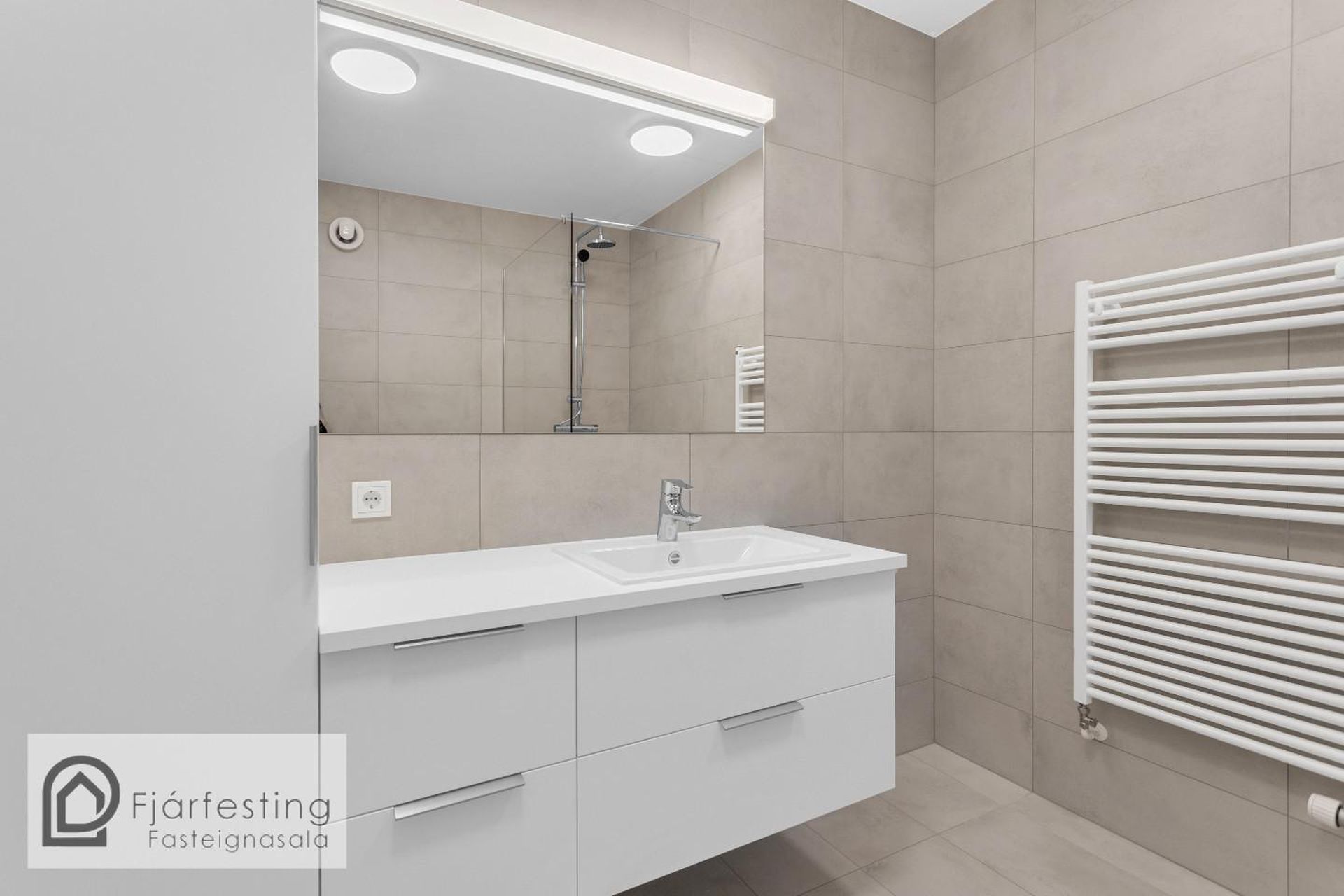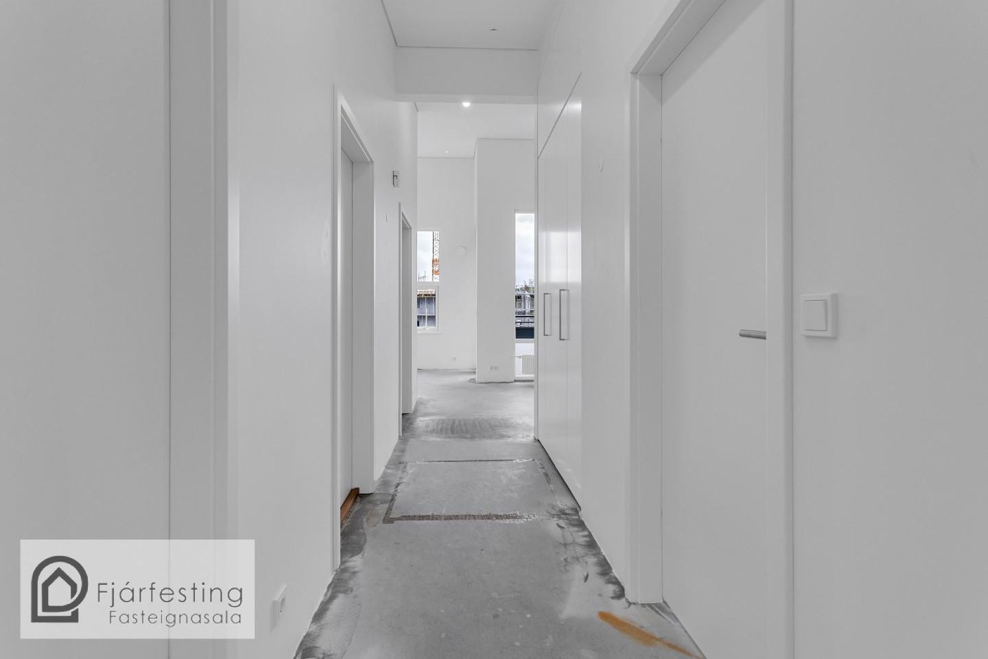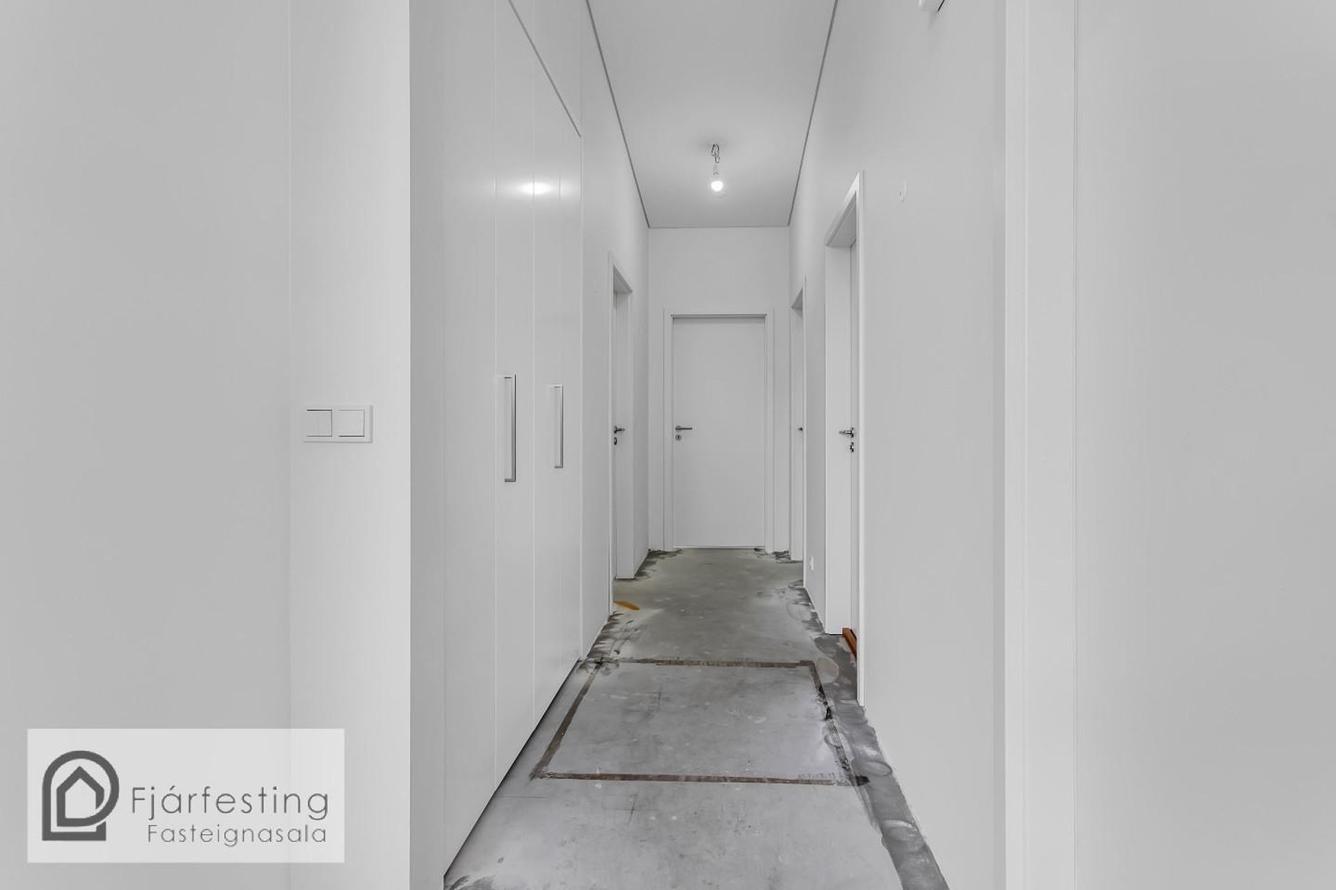 FJÁRFESTING FASTEIGNASALA, SÍMI 562-4250, ER MEÐ TIL SÖLU GLÆSILEGAR ÍBÚÐIR Í SKARÐSHLÍÐARHVERFINU Í HAFNARFIRÐI. Vandaðar 3ja - 4ra herbergja íbúðir að Skarðshlíð 1-7 í Hafnarfirði. Fjölbýlishús með sérinngangi. Glæsilegar innréttingar og fataskápar frá Brúnás.Skarðshlíð 1-7 eru ný 2ja hæða fjölbýlishús í Skarðshlíðarhverfinu í Hafnarfirði.Nánari upplýsingar hjá Óskari í síma 822-8750 Nánari lýsing:Um er að ræða 4ra herbergja íbúð, 94,4 fm. á 2. hæð, merkt 0202 að Skarðshlíð 1 í Hafnarfirði. Íbúðinni fylgja svalir og bílastæði á lóð.SKILALÝSING:STUÐLASKARÐ 1, 3, 5 OG 7 - SKILALÝSING1 Frágangur innanhúss1.1 Gólfefni Íbúðin sjálf verður afhent að mestu án gólfefna. Gólf á baðherbergi, þvottahúsi og anddyri eru flísalögð með 300*600 mm flísum. Flísar eru frá Álfaborg1.2 Veggir Útveggir íbúða eru ýmist einangraðir og pússaðir eða slípaðir og síðan sandsparslaðir. Léttir innveggir eru hlaðnir úr vikur- eða gjallplötum, grófpússaðir og sandsparslaðir. Eftir það eru allir veggir grunnaðir og málaðir með tveimur yfirferðum af plastmálningu, gljástig 7% eða sambærilegt. Veggir á snyrtingu eru flísalagðir með 300*600 mm flísum. Flísar eru frá Álfaborg1.3 Loft Steypt loft eru slípuð, sandspörsluð, grunnuð og máluð með tveimur yfirferðum af plastmálningu, gljástig 2 eða sambærilegt. Loft og veggir á baðherbergjum og þvottahúsum eru máluð með viðurkenndri votrýmismálningu.1.4 Gluggar og gler Gluggar eru ál-trégluggar, framleiðandi Börkur hf. Gler í öllum gluggum er tvöfalt hefðbundið verksmiðjuframleitt K-gler. Framleiðandi glers er Samverk og er ábyrgð glers samkvæmt þeirra skilmálum sem glerframleiðanda. Við kaup íbúðar yfirtekur kaupandi/kaupendur ábyrgð framleiðanda.1.5 Sólbekkir Sólbekkir, þar sem þeir koma eru úr plastlögðum spónaplötum.1.6 Hurðar Útihurðar eru ýmist með brunaþol E30C eða ekki, framleiðandi Börkur hf. Hurðarpumpur á E30C útihurðum eru af tegundinni GEZE TS3000V með sleða. Svalahurðar eru ál/tré með gleri í álfalsramma, framleiðandi Börkur. Innihurðar eru yfirfelldar, sléttar og sprautulakkaðar hvítar. Innihurðar eru frá Parka.1.7 Fataskápar og geymsluskápar Fataskápar eru í forstofu og svefnherbergjum. Innréttingar eru frá Brúnás. Innmatur er úr ljósgráum plasthúðuðum spónaplötum en sýnilegar hliðar og hurðar eru úr dökku melamin. Geymsluskápar á göngum eru ýmist hefðbundnir skápar eða með lausum hillum í hillukerfi. Hurðar geymsluskápa eru sprautulakkaðar hvítar.1.8 Eldhús Eldhúsinnrétting er að innan úr ljósgráum plasthúðuðum spónaplötum. Neðri skápar og háir skápar eru úr dökku melamin þ.e. hurðar og sýnilegar úthliðar. Yfirskápar eru sprautulakkaðir hvítir þ.e. hurðar og úthliðar. Yfir borðplötu að efri skápum er litað hvítt gler. Borðplötur eru 30 mm þykkar með 0,8 mm gegnheilu plasti. Ekki er ráðlagt að leggja heita hluti beint á plöturnar, nota skal hitaplatta eða sambærilegt.Vaskur er af gerðinni Intra Frame FR520 og blöndunartæki af gerðinni Mora Cera K7, hvoru tveggja frá Tengi. Í innréttingu er AEG spanhelluborð að gerðinni IKB64431XB, AEG veggofn með blæstri af gerðinni BCK456220M, AEG veggháfur af gerðinni F80 BK 60CM S og innbyggð AEG uppþvottavél af gerðinni FSE63607P. Öll tæki eru frá Bræðrunum Ormsson.1.9 Baðherbergi Á baðherbergi er gólf flísalagt ásamt sturtu og veggir flísalagðir að lofti. Innrétting frá Brúnás er að innan úr ljósgráum plasthúðuðum spónaplötum en sýnilegar hliðar og hurðar eru sprautulakkaðar hvítar. Borðplötur eru úr hvítu plasti. Spegill er yfir vaski. Handlaug er af gerðinni Alape EB.R585H, blöndunartæki af gerðinni Mora Cera B5, handklæðaofn, innbyggður vatnskassi og upphengt Geberit Selnova salerni með hæglokandi setu og Mora MMIX blöndunartæki í sturtu. Öll hreinlætistæki verða frá Tengi. Gler er ýmist fyrir allri sturtunni eða með annarri hlið hennar. Tvö niðurföll eru1.10 Þvottahús Gólf í þvottahúsi er flísalagt. Innrétting frá Brúnás er að innan úr ljósgráum plasthúðuðum spónaplötum og sýnilegar hliðar og hurðir úr ljósgráu melamin. Borðplata er harðplastlögð með plastkanti. Í borðplötu er vaskur af gerðinni Intra K400 og blöndunartæki af gerðinni FMMattsson ECO. Niðurfall er í gólfi og tengingar fyrir þvottavél og þurrkara. Gert er ráð fyrir barkalausum þurrkara.1.11 Sérgeymsla Allt geymslurými er innan hverrar íbúðar.1.12 Hitakerfi Íbúðirnar eru upphitaðar með hefðbundinni ofnalögn.1.13 Loftræsti-, vatns- og þrifalagnir Loftræsti-, vatns, - og þrifalagnir fylgja frágengnar skv. teikningum. Forhitari er á heitu neysluvatni.1.14 Rafmagns- og sjónvarpslagnir Rafmagns- og sjónvarpslögn fylgja frágengnir og hefðbundin dyrabjalla er í hverri íbúð. Loftnets- og tölvutengill verður í alrými. Tölvutenglar verða í herbergjum. Ljósleiðari verður í húsinu. Innfelld lýsing með dimmum er í hluta af alrými þ.e. stofu og eldhúsi þar sem það á við. Fer eftir gerð lofta í íbúðum. 2. Frágangur sameignar 2.1 Hjóla- og vagnageymslur Steyptir innveggir í hjóla- og vagnageymslu eru hreinsaðir slípaðir og málaðir. Gólf eru slípuð og lögð epoxy.2.2 Sorp Sameiginleg hellulögð sorpsvæði eru fyrir hver tvö hús. Á hverju sorpsvæði eru 6 stk steypt sorptunnuskýli frá BM Vallá með timburklæddum lokunum þ.e. hurðum að framan og hlera að ofan. Pumpa er á hlerum og seglar í keðju sem festast á gámalokin og auðvelda opnun sorpgáma. Í hvert skýli er gert ráð fyrir að komi sorpgámur á hjólum, hver um 660 l að stærð.3. Frágangur utanhúss3.1 Klæðning og einangrun Útveggir eru einangraðir ýmist að utan- eða innanverðu ef