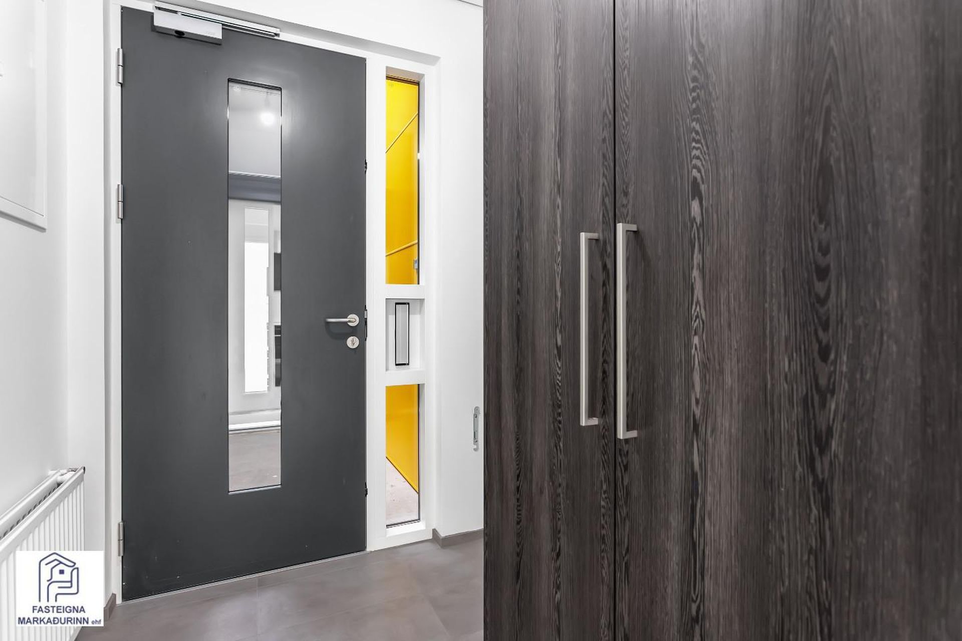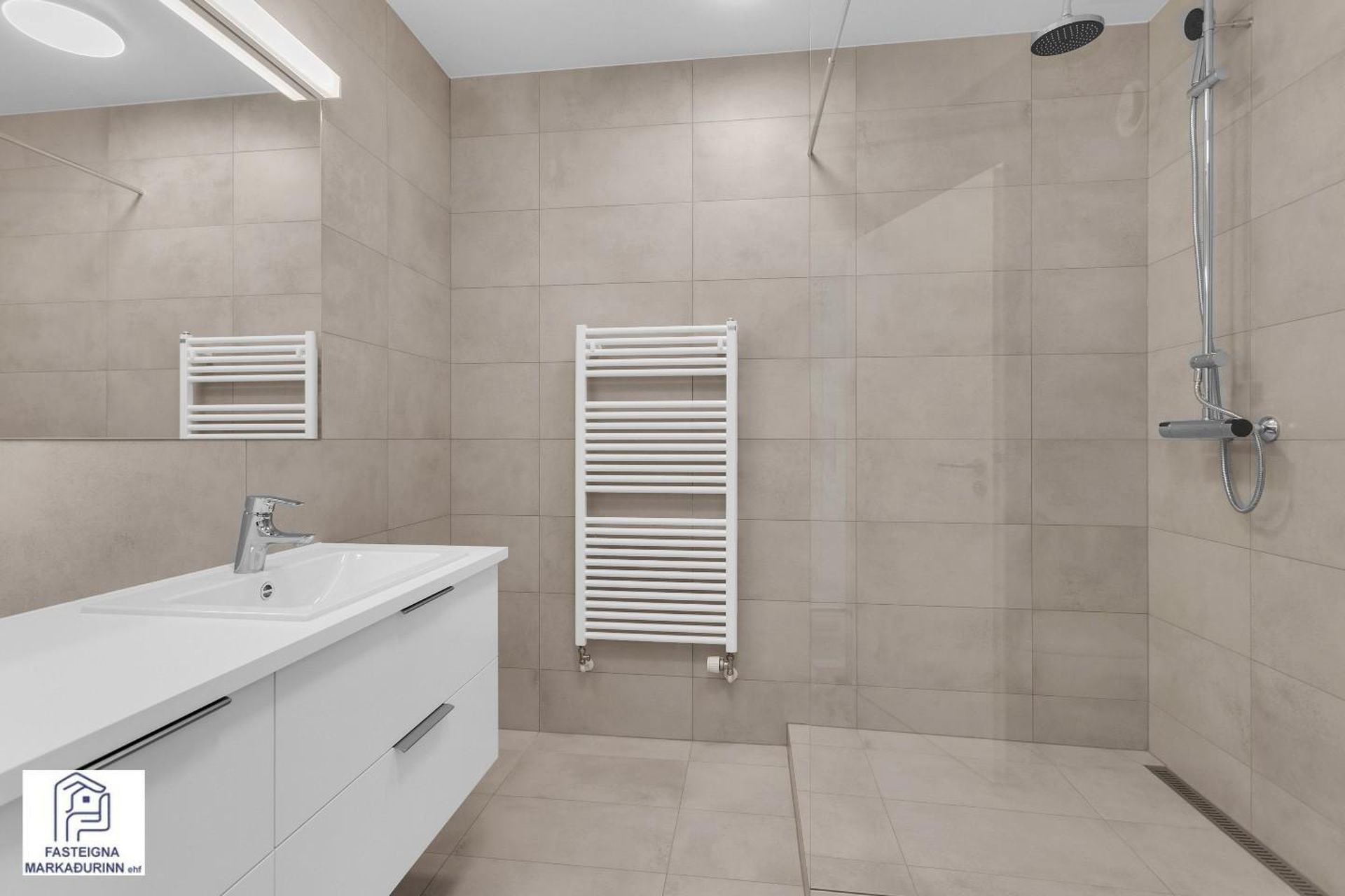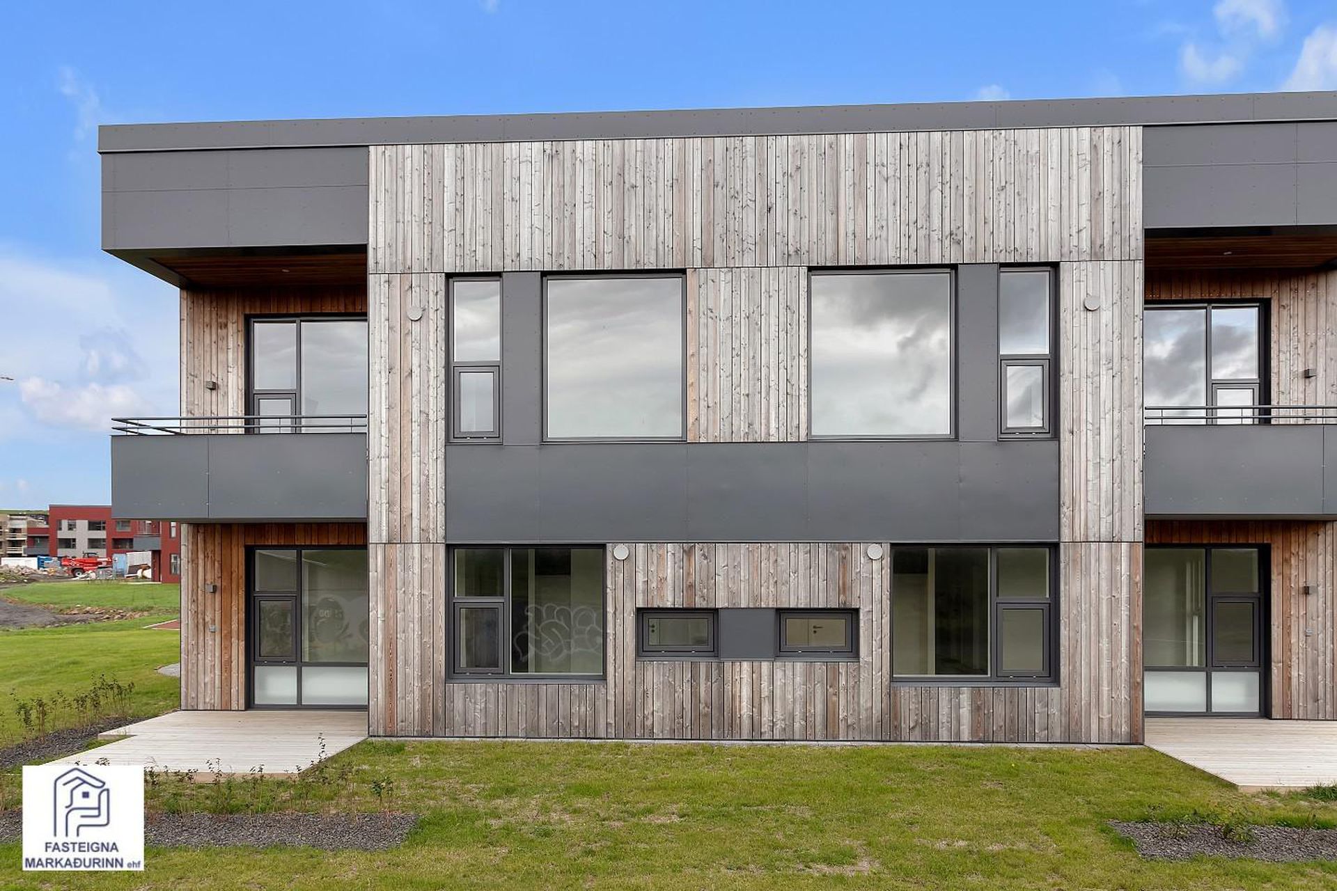 ATH. Sýnum þessar eignir samdægurs. Hafið samband í síma 570-4500 eða á netfanginu Fasteignamarkaðurinn ehf. sími 570-4500 kynnir til sölu glæsilega 94,4 fermetra 4ra herbergja íbúð á 2. hæð í nýrri og glæsilegri 4ra íbúða nýbyggingu við Stuðlaskarð 1 í Hafnarfirði. Eigninni fylgja 6,3 fm svalir til suðurs.Eignin skiptist í: forstofu, hol, hjónaherbergi með fataskápum, tvö barnaherbergi, baðherbergi með tengi fyrir þvottavél og þurrkara, eldhús með eyju, stofu og borðstofu.Allar innréttingar eru frá Brúnás, eldhústæki eru frá AEG og blöndunartæki frá Tengi. Íbúðin skilast með flísum á gólfi á baði og þvottaherbergi. Sjá nánar í skilalýsingu. STUÐLASKARÐ 1, 3, 5 OG 7 - SKILALÝSING1 Frágangur innanhúss1.1 GólfefniÍbúðin sjálf verður afhent að mestu án gólfefna. Gólf á baðherbergi, þvottahúsi og anddyri eru flísalögð með 300*600 mm flísum. Flísar eru frá Álfaborg1.2 VeggirÚtveggir íbúða eru ýmist einangraðir og pússaðir eða slípaðir og síðan sandsparslaðir. Léttir innveggir eru hlaðnir úr vikur- eða gjallplötum, grófpússaðir og sandsparslaðir. Eftir það eru allir veggir grunnaðir og málaðir með tveimur yfirferðum af plastmálningu, gljástig 7% eða sambærilegt.Veggir á snyrtingu eru flísalagðir með 300*600 mm flísum. Flísar eru frá Álfaborg1.3 LoftSteypt loft eru slípuð, sandspörsluð, grunnuð og máluð með tveimur yfirferðum af plastmálningu, gljástig 2 eða sambærilegt. Loft og veggir á baðherbergjum og þvottahúsum eru máluð með viðurkenndri votrýmismálningu.1.4 Gluggar og glerGluggar eru ál-trégluggar, framleiðandi Börkur hf. Gler í öllum gluggum er tvöfalt hefðbundið verksmiðjuframleitt K-gler. Framleiðandi glers er Samverk og er ábyrgð glers samkvæmt þeirra skilmálum sem glerframleiðanda.Við kaup íbúðar yfirtekur kaupandi/kaupendur ábyrgð framleiðanda.1.5 SólbekkirSólbekkir, þar sem þeir koma eru úr plastlögðum spónaplötum.1.6 HurðarÚtihurðar eru ýmist með brunaþol E30C eða ekki, framleiðandi Börkur hf. Hurðarpumpur á E30C útihurðum eru af tegundinni GEZE TS3000V með sleða.Svalahurðar eru ál/tré með gleri í álfalsramma, framleiðandi Börkur.Innihurðar eru yfirfelldar, sléttar og sprautulakkaðar hvítar. Innihurðar eru frá Parka.1.7 Fataskápar og geymsluskáparFataskápar eru í forstofu og svefnherbergjum. Innréttingar eru frá Brúnás. Innmatur er úr ljósgráum plasthúðuðum spónaplötum en sýnilegar hliðar og hurðar eru úr dökku melamin. Geymsluskápar á göngum eru ýmist hefðbundnir skápar eða með lausum hillum í hillukerfi. Hurðar geymsluskápa eru sprautulakkaðar hvítar.1.8 EldhúsEldhúsinnrétting er að innan úr ljósgráum plasthúðuðum spónaplötum. Neðri skápar og háir skápar eru úr dökku melamin þ.e. hurðar og sýnilegar úthliðar. Yfirskápar eru sprautulakkaðir hvítir þ.e. hurðar og úthliðar. Yfir borðplötu að efri skápum er litað hvítt gler. Borðplötur eru 30 mm þykkar með 0,8 mm gegnheilu plasti. Ekki er ráðlagt að leggja heita hluti beint á plöturnar, nota skal hitaplatta eða sambærilegt.HANDBÓK EIGENDAStuðlaskarð 1-7Byggingarfélag Gylfa og Gunnars hf. Bls. 6 af 7Vaskur er af gerðinni Intra Frame FR520 og blöndunartæki af gerðinni Mora Cera K7, hvoru tveggja frá Tengi.Í innréttingu er AEG spanhelluborð að gerðinni IKB64431XB, AEG veggofn með blæstri af gerðinni BCK456220M, AEG veggháfur af gerðinni F80 BK 60CM S og innbyggð AEG uppþvottavél af gerðinni FSE63607P. Öll tæki eru frá Bræðrunum Ormsson.1.9 BaðherbergiÁ baðherbergi er gólf flísalagt ásamt sturtu og veggir flísalagðir að lofti. Innrétting frá Brúnás er að innan úr ljósgráum plasthúðuðum spónaplötum en sýnilegar hliðar og hurðar eru sprautulakkaðar hvítar. Borðplötur eru úr hvítu plasti. Spegill er yfir vaski. Handlaug er af gerðinni Alape EB.R585H, blöndunartæki af gerðinni Mora Cera B5, handklæðaofn, innbyggður vatnskassi og upphengt Geberit Selnova salerni með hæglokandi setu og Mora MMIX blöndunartæki í sturtu. Öll hreinlætistæki verða frá Tengi. Gler er ýmist fyrir allri sturtunni eða með annarri hlið hennar. Tvö niðurföll eru1.10 ÞvottahúsGólf í þvottahúsi er flísalagt. Innrétting frá Brúnás er að innan úr ljósgráum plasthúðuðum spónaplötum og sýnilegar hliðar og hurðir úr ljósgráu melamin. Borðplata er harðplastlögð með plastkanti. Í borðplötu er vaskur af gerðinni Intra K400 og blöndunartæki af gerðinni FMMattsson ECO. Niðurfall er í gólfi og tengingar fyrir þvottavél og þurrkara. Gert er ráð fyrir barkalausum þurrkara.1.11 SérgeymslaAllt geymslurými er innan hverrar íbúðar.1.12 HitakerfiÍbúðirnar eru upphitaðar með hefðbundinni ofnalögn.1.13 Loftræsti-, vatns- og þrifalagnirLoftræsti-, vatns, - og þrifalagnir fylgja frágengnar skv. teikningum. Forhitari er á heitu neysluvatni.1.14 Rafmagns- og sjónvarpslagnirRafmagns- og sjónvarpslögn fylgja frágengnir og hefðbundin dyrabjalla er í hverri íbúð. Loftnets- og tölvutengill verður í alrými. Tölvutenglar verða í herbergjum. Ljósleiðari verður í húsinu. Innfelld lýsing með dimmum er í hluta af alrými þ.e. stofu og eldhúsi þar sem það á við. Fer eftir gerð lofta í íbúðum.2. Frágangur sameignar2.1 Hjóla- og vagnageymslurSteyptir innveggir í hjóla- og vagnageymslu eru hreinsaðir slípaðir og málaðir. Gólf eru slípuð og lögð epoxy.2.2 SorpSameiginleg hellulögð sorpsvæði eru fyrir hver tvö hús. Á hverju sorpsvæði eru 6 stk steypt sorptunnuskýli frá BM Vallá með timburklæddum lokunum þ.e. hurðum að framan og hlera að ofan. Pumpa er á hlerum og seglar í keðju sem festast á gámalokin og auðvelda opnun sorpgáma. Í hvert skýli er gert ráð fyrir að komi sorpgámur á hjólum,