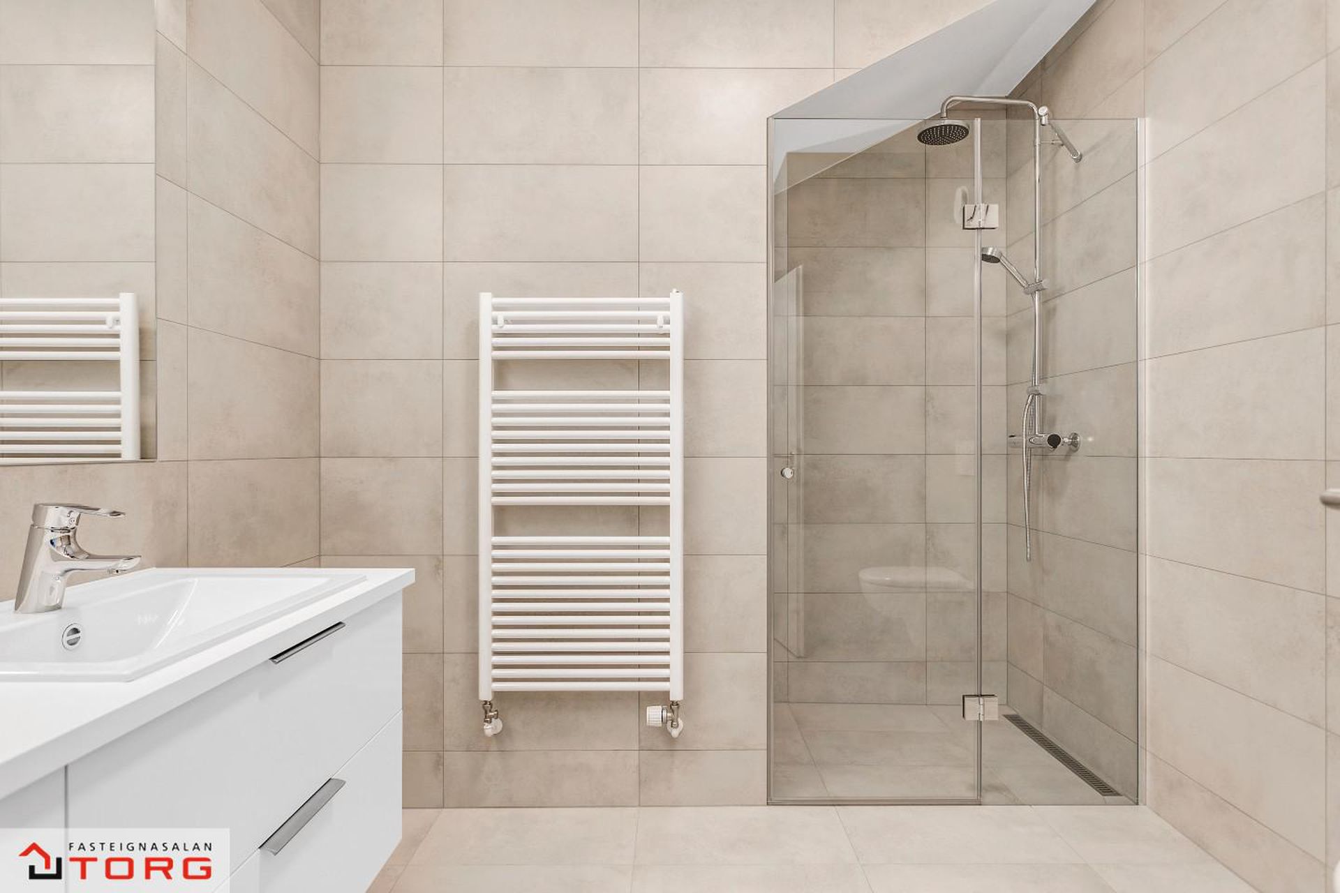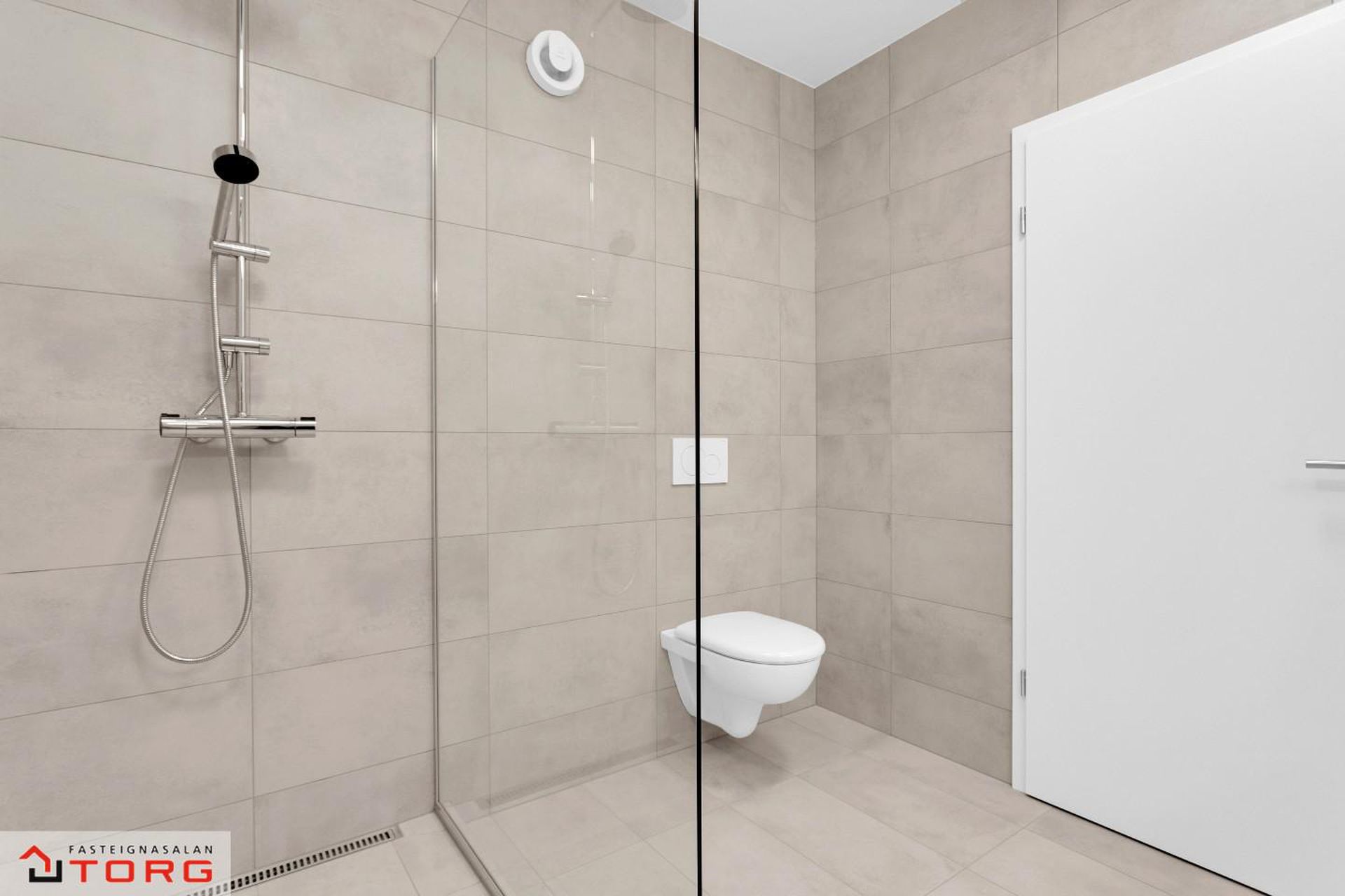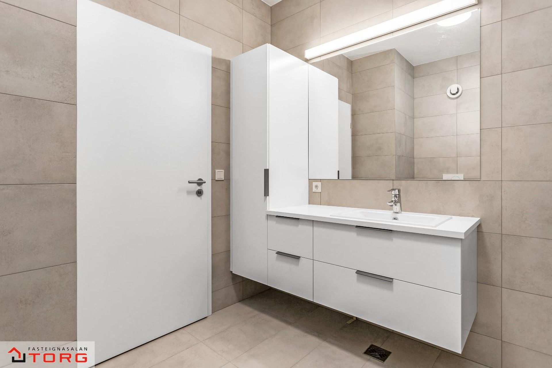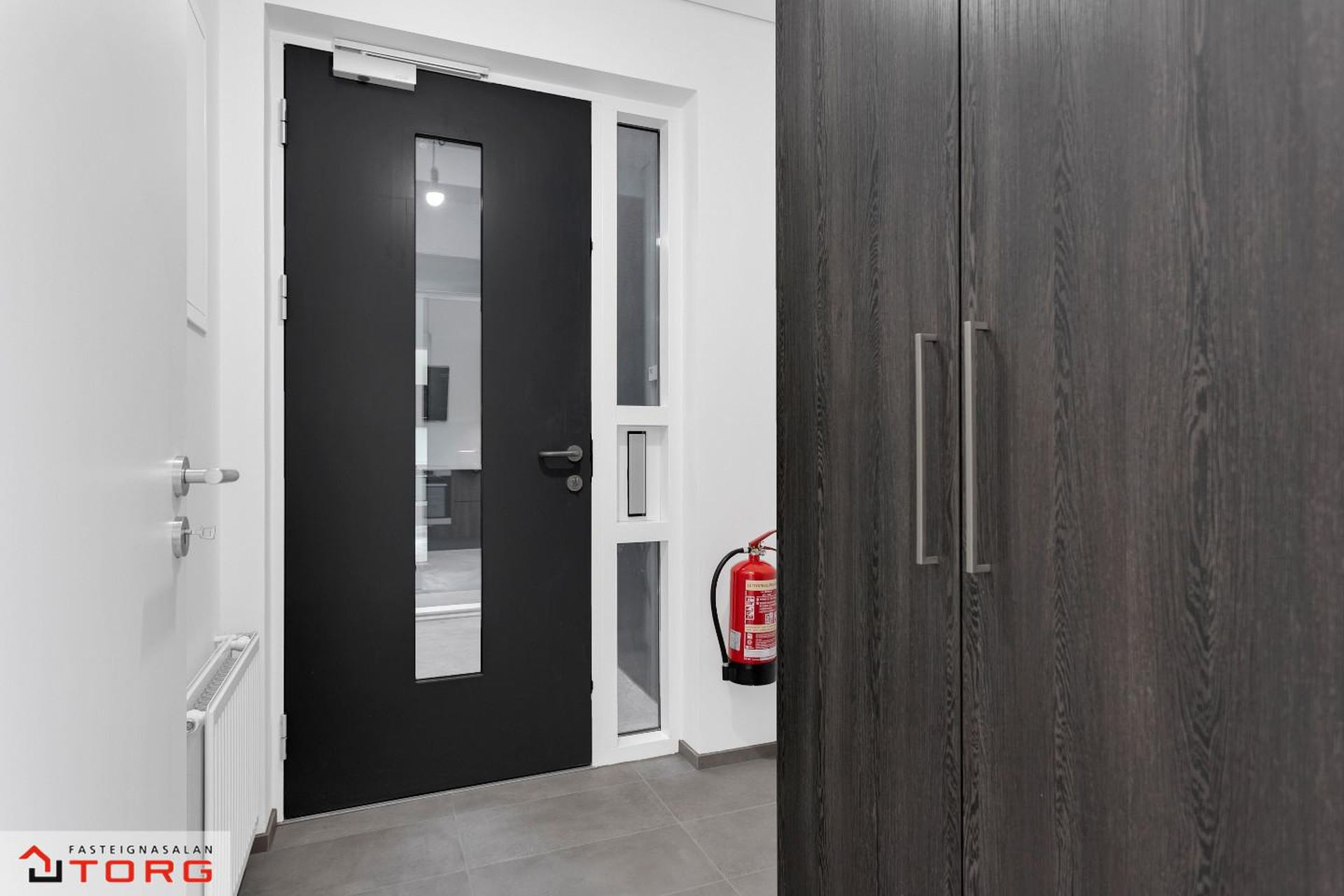 Fasteignasalan TORG kynna: Bókið tíma fyrir skoðun í gsm. 699-4610*Glæsilega 4ra herbergja íbúð á 2. hæð í nýbyggingu við Stuðlaskarð 1-7 Hafnarfirði . Um er ræða 4 hús á tveimur hæðum með 4 íbúðum með sérinngangi. Íbúðirnar eru 3-4ra herbergja. Myndirnar sýna húsin 4 og dæmi um innréttingar á 1 og 2 hæð.Stuðlaskarð 1, Íbúð 201 er 4ra herbergja er skráð samkvæmt F.M.R 94,4 fermetra og sameignleg hjóla og vagnageymsla er í húsinu.Allar innréttingar er frá Brúnás, AEG eldhústæki og blöndunartæki frá Tengi. Íbúðin skilast með flísum á gólfi á baði, anddyri og þvottaherbergi frá Álfaborg. Íbúðin skiptist í eldhús, stofu, 3 svefnherbergi, baðherbergi, þvottahús og anddyri. Aukin lofthæð er í aðalrýminu. Íbúðirnar eru tilbúnar til afhendingar. Frábær staðsetning þar sem stutt er í Skarðshlíðarskóla.Allar nánari upplýsingar og sýningar veitir Dórotheu Jóhannsdóttir, fasteignasala í gsm. 898-3326 eða netfang. STUÐLASKARÐ 1, 3, 5 OG 7 - SKILALÝSING1 Frágangur innanhúss 1.1 Gólfefni Íbúðin sjálf verður afhent að mestu án gólfefna. Gólf á baðherbergi, þvottahúsi og anddyri eru flísalögð með 300*600 mm flísum. Flísar eru frá Álfaborg1.2 Veggir Útveggir íbúða eru ýmist einangraðir og pússaðir eða slípaðir og síðan sandsparslaðir. Léttir innveggir eru hlaðnir úr vikur- eða gjallplötum, grófpússaðir og sandsparslaðir. Eftir það eru allir veggir grunnaðir og málaðir með tveimur yfirferðum af plastmálningu, gljástig 7% eða sambærilegt. Veggir á snyrtingu eru flísalagðir með 300*600 mm flísum. Flísar eru frá Álfaborg1.3 Loft Steypt loft eru slípuð, sandspörsluð, grunnuð og máluð með tveimur yfirferðum af plastmálningu, gljástig 2 eða sambærilegt. Loft og veggir á baðherbergjum og þvottahúsum eru máluð með viðurkenndri votrýmismálningu.1.4 Gluggar og gler Gluggar eru ál-trégluggar, framleiðandi Börkur hf. Gler í öllum gluggum er tvöfalt hefðbundið verksmiðjuframleitt K-gler. Framleiðandi glers er Samverk og er ábyrgð glers samkvæmt þeirra skilmálum sem glerframleiðanda. Við kaup íbúðar yfirtekur kaupandi/kaupendur ábyrgð framleiðanda.1.5 Sólbekkir Sólbekkir, þar sem þeir koma eru úr plastlögðum spónaplötum.1.6 Hurðar Útihurðar eru ýmist með brunaþol E30C eða ekki, framleiðandi Börkur hf. Hurðarpumpur á E30C útihurðum eru af tegundinni GEZE TS3000V með sleða. Svalahurðar eru ál/tré með gleri í álfalsramma, framleiðandi Börkur. Innihurðar eru yfirfelldar, sléttar og sprautulakkaðar hvítar. Innihurðar eru frá Parka. 1.7 Fataskápar og geymsluskápar Fataskápar eru í forstofu og svefnherbergjum. Innréttingar eru frá Brúnás. Innmatur er úr ljósgráum plasthúðuðum spónaplötum en sýnilegar hliðar og hurðar eru úr dökku melamin. Geymsluskápar á göngum eru ýmist hefðbundnir skápar eða með lausum hillum í hillukerfi. Hurðar geymsluskápa eru sprautulakkaðar hvítar.1.8 Eldhús Eldhúsinnrétting er að innan úr ljósgráum plasthúðuðum spónaplötum. Neðri skápar og háir skápar eru úr dökku melamin þ.e. hurðar og sýnilegar úthliðar. Yfirskápar eru sprautulakkaðir hvítir þ.e. hurðar og úthliðar. Yfir borðplötu að efri skápum er litað hvítt gler. Borðplötur eru 30 mm þykkar með 0,8 mm gegnheilu plasti. Ekki er ráðlagt að leggja heita hluti beint á plöturnar, nota skal hitaplatta eða sambærilegt.Vaskur er af gerðinni Intra Frame FR520 og blöndunartæki af gerðinni Mora Cera K7, hvoru tveggja frá Tengi. Í innréttingu er AEG spanhelluborð að gerðinni IKB64431XB, AEG veggofn með blæstri af gerðinni BCK456220M, AEG veggháfur af gerðinni F80 BK 60CM S og innbyggð AEG uppþvottavél af gerðinni FSE63607P. Öll tæki eru frá Bræðrunum Ormsson.1.9 Baðherbergi Á baðherbergi er gólf flísalagt ásamt sturtu og veggir flísalagðir að lofti. Innrétting frá Brúnás er að innan úr ljósgráum plasthúðuðum spónaplötum en sýnilegar hliðar og hurðar eru sprautulakkaðar hvítar. Borðplötur eru úr hvítu plasti. Spegill er yfir vaski. Handlaug er af gerðinni Alape EB.R585H, blöndunartæki af gerðinni Mora Cera B5, handklæðaofn, innbyggður vatnskassi og upphengt Geberit Selnova salerni með hæglokandi setu og Mora MMIX blöndunartæki í sturtu. Öll hreinlætistæki verða frá Tengi. Gler er ýmist fyrir allri sturtunni eða með annarri hlið hennar. Tvö niðurföll eru1.10 Þvottahús Gólf í þvottahúsi er flísalagt. Innrétting frá Brúnás er að innan úr ljósgráum plasthúðuðum spónaplötum og sýnilegar hliðar og hurðir úr ljósgráu melamin. Borðplata er harðplastlögð með plastkanti. Í borðplötu er vaskur af gerðinni Intra K400 og blöndunartæki af gerðinni FMMattsson ECO. Niðurfall er í gólfi og tengingar fyrir þvottavél og þurrkara. Gert er ráð fyrir barkalausum þurrkara.1.11 Sérgeymsla Allt geymslurými er innan hverrar íbúðar.1.12 Hitakerfi Íbúðirnar eru upphitaðar með hefðbundinni ofnalögn.1.13 Loftræsti-, vatns- og þrifalagnir Loftræsti-, vatns, - og þrifalagnir fylgja frágengnar skv. teikningum. Forhitari er á heitu neysluvatni.1.14 Rafmagns- og sjónvarpslagnir Rafmagns- og sjónvarpslögn fylgja frágengnir og hefðbundin dyrabjalla er í hverri íbúð. Loftnets- og tölvutengill verður í alrými. Tölvutenglar verða í herbergjum. Ljósleiðari verður í húsinu. Innfelld lýsing með dimmum er í hluta af alrými þ.e. stofu og eldhúsi þar sem það á við. Fer eftir gerð lofta í íbúðum.2. Frágangur sameignar 2.1 Hjóla- og vagnageymslur Steyptir innveggir í hjóla- og vagnageymslu eru hreinsaðir slípaðir og málaðir. Gólf eru slípuð og lögð epoxy.2.2 Sorp Sameiginleg hellulögð sorpsvæði eru fyrir hver tvö hús. Á hverju sorpsvæði eru 6 stk steypt sorptunnuskýli fr