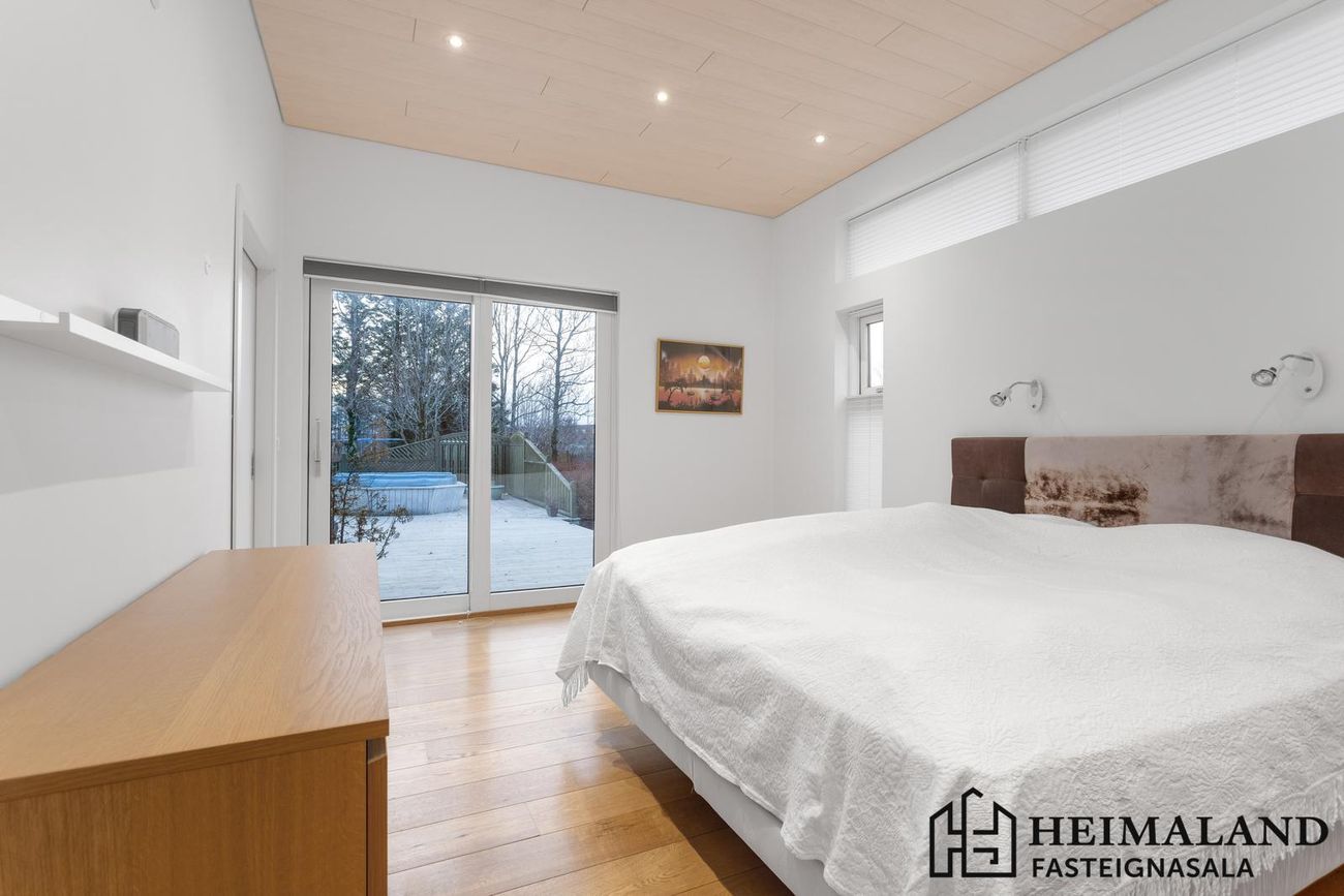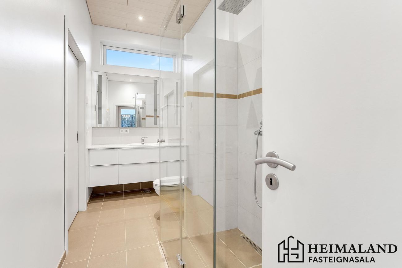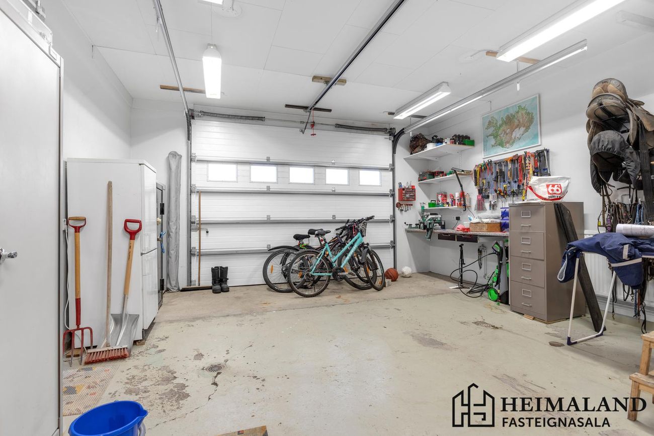 Bílskúr með geymslulofti (13,8m²). Aðskilin geymsla í þvottahúsi.