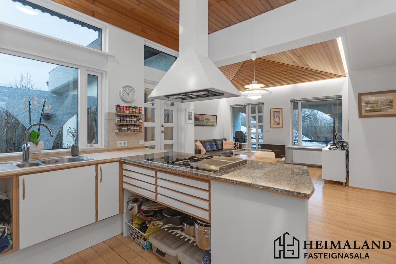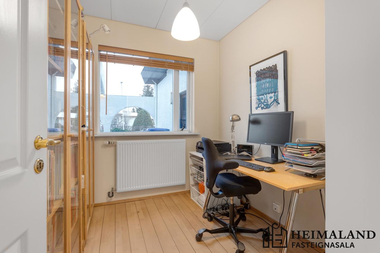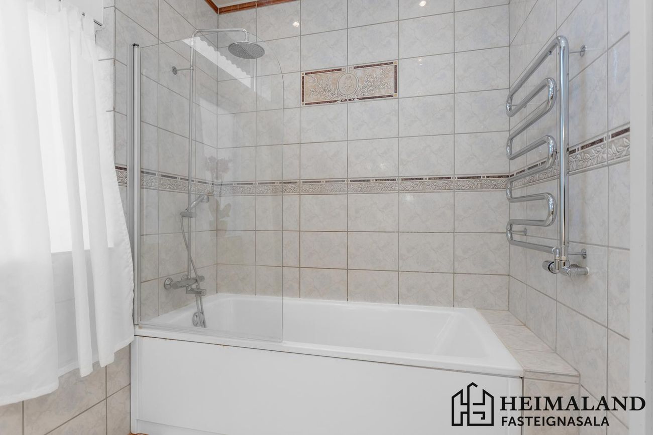 Bílskúr með geymslulofti (13,8m²). Aðskilin geymsla í þvottahúsi.