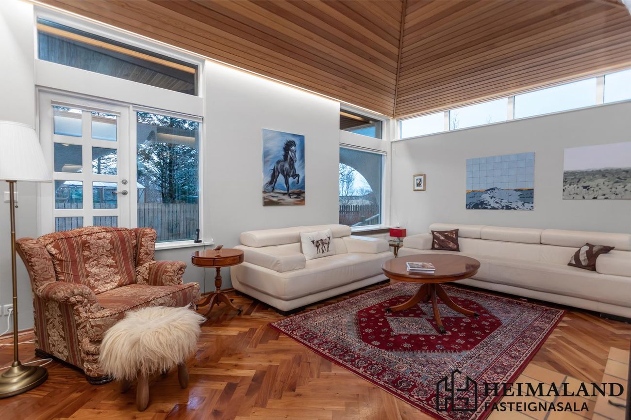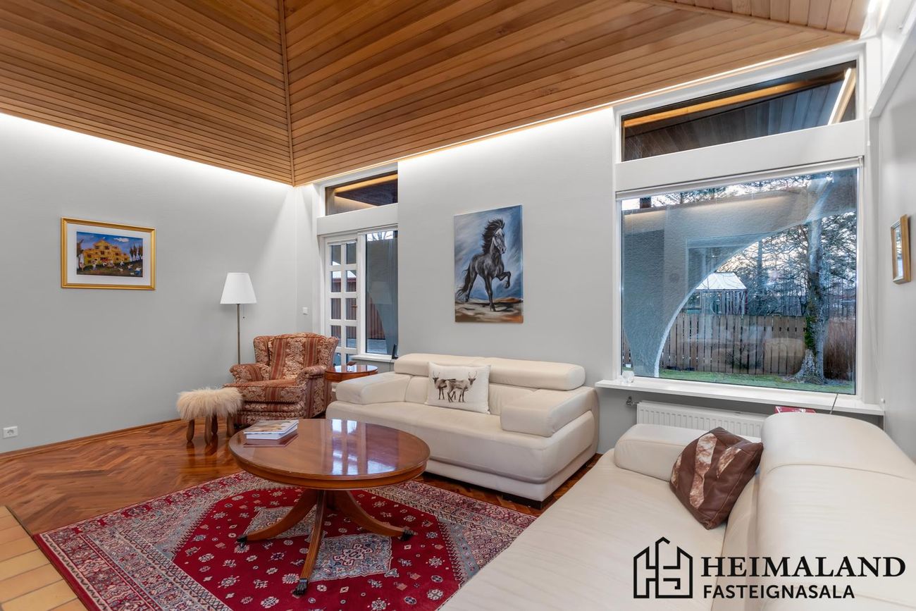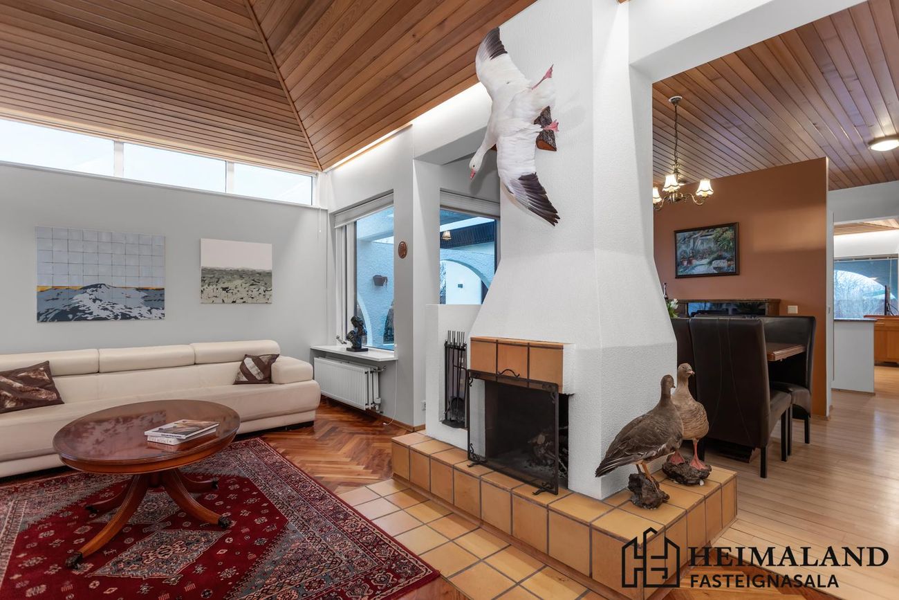 Stór arinstofa með flottu eikarpartketi. Sjónvarpshol með LED-lýsingu í lofti.