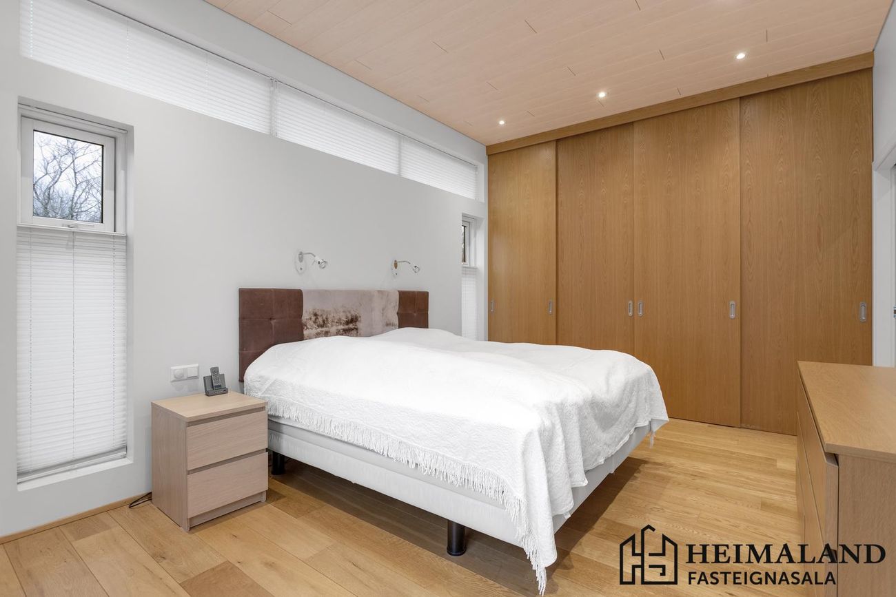 Hjónasvía með stóru svefnherbergi og baði. Fjögur önnur svefnherbergi með skápa.