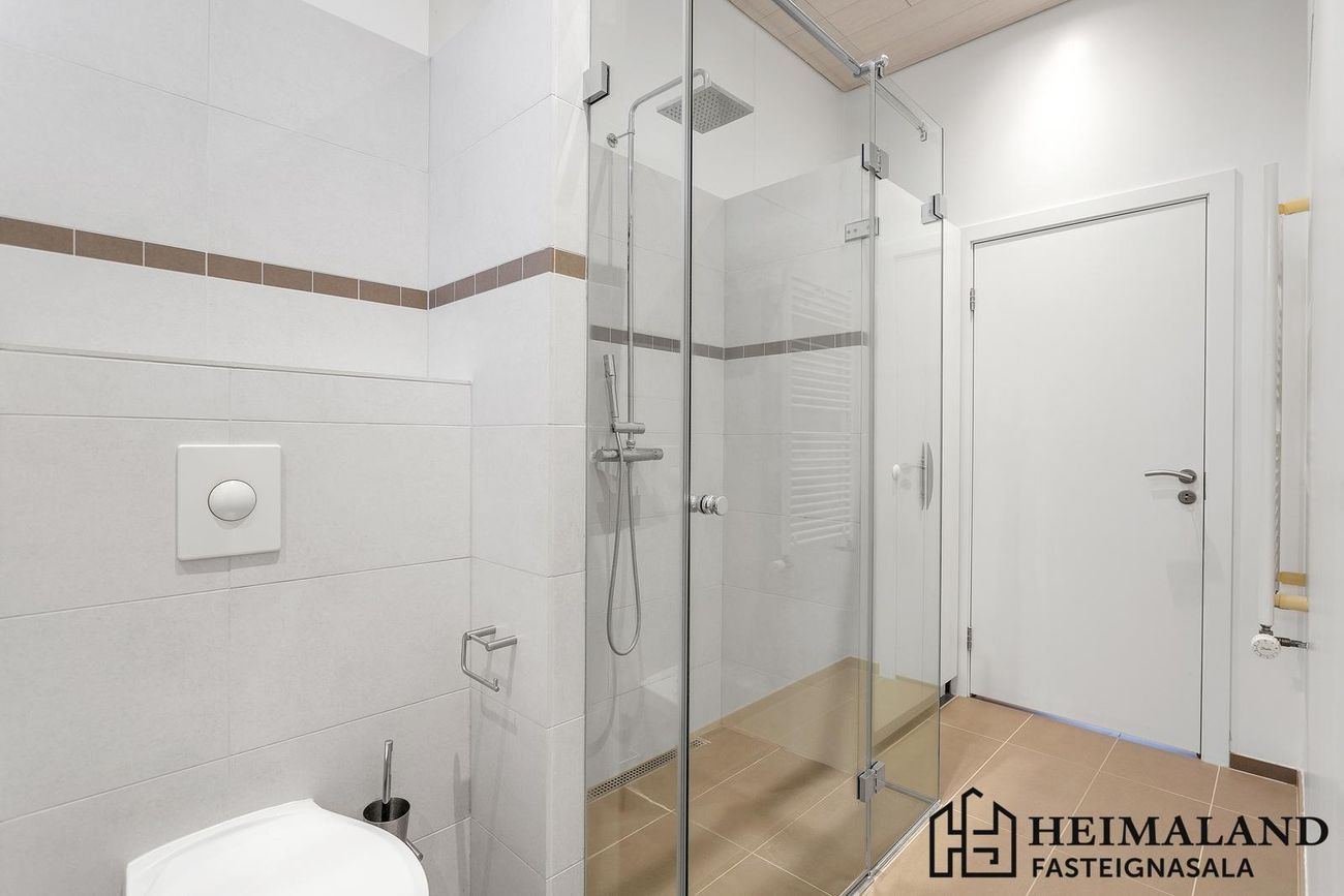 Nýlega endurnýjað baðkar í upprunalega hluta hússins. Baðherbergi með gólfsturtu og flísum.