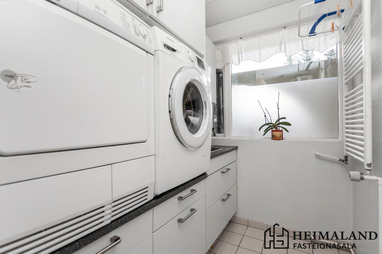 Þvottahús með flísum og plássi fyrir þvottavél og þurrkara. Gengið úr þvottahúsi í bílskúr.