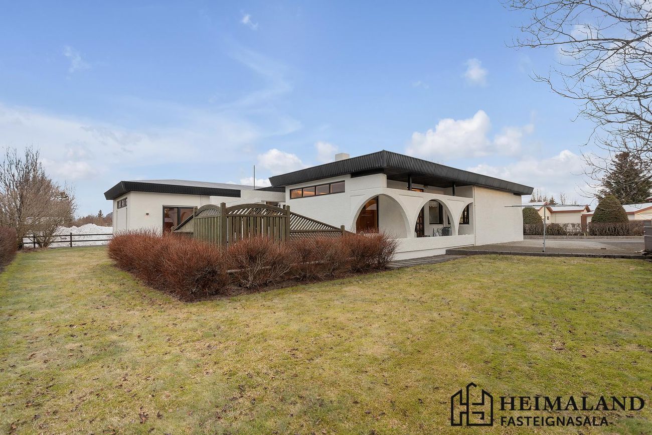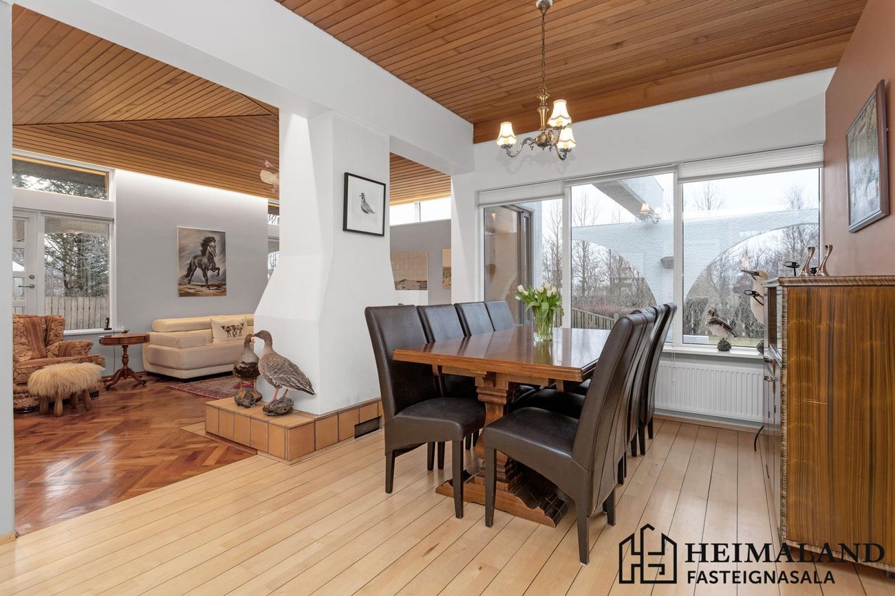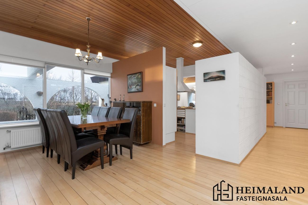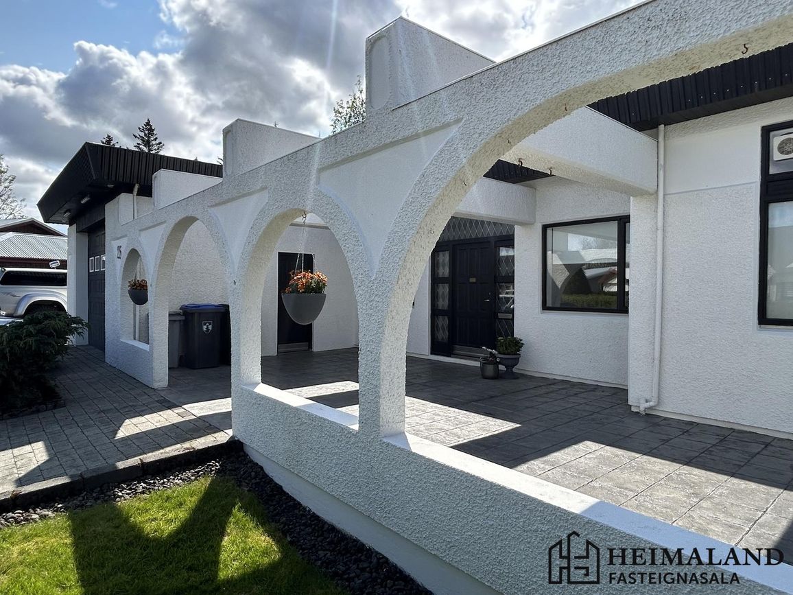 Hús með forstofu, borðstofu, sjónvarpshol, þvottahús og bílskúr með geymslulofti. Gegnheilt parket í stofusvæðum og flísar í baðherbergjum.