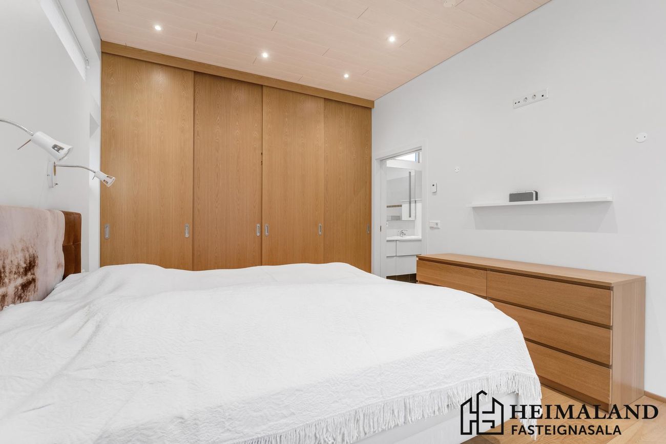 Gegnheilt eikar- og jatobaparket í stofusvæðum, flísar í baðherbergjum og þvottahúsi.