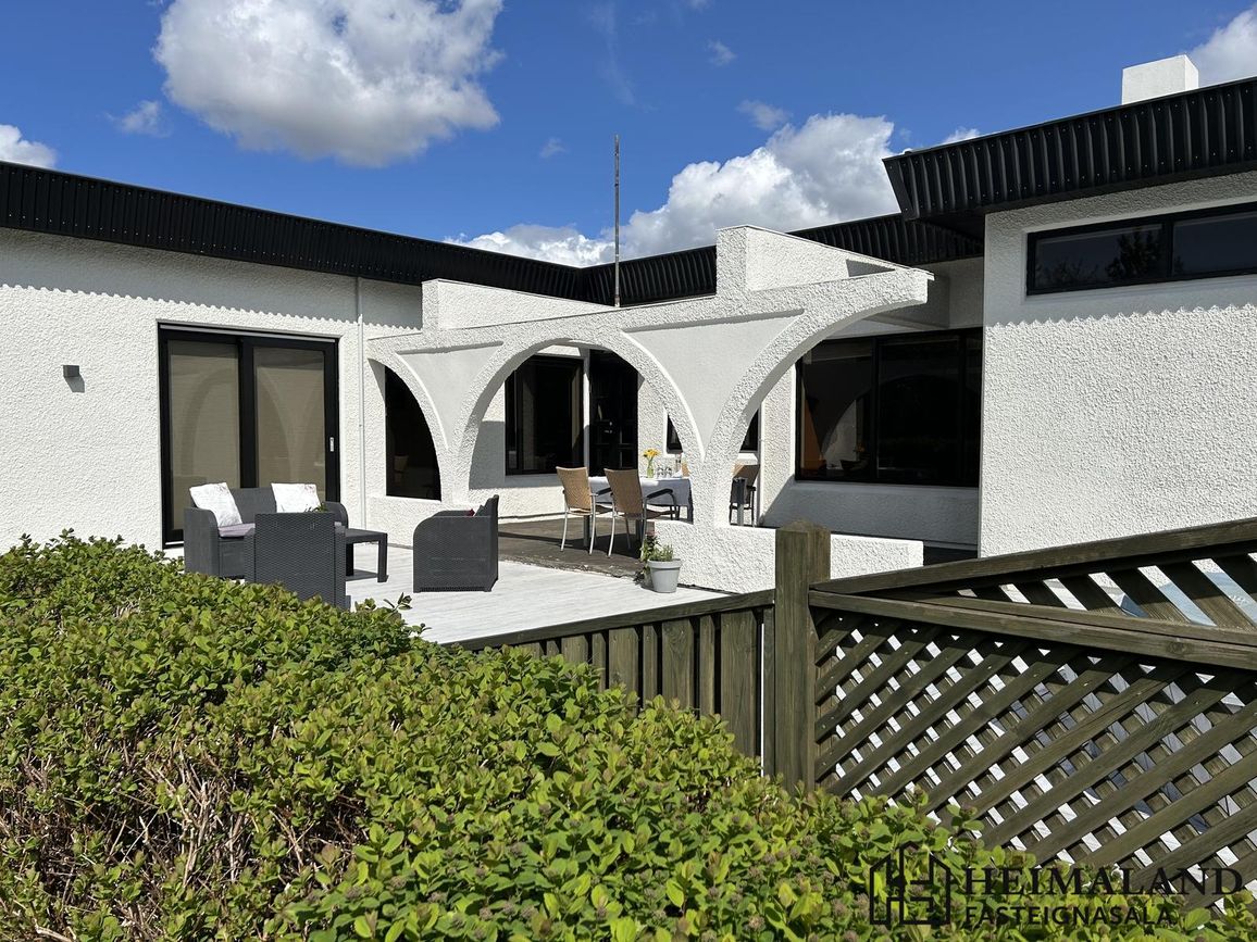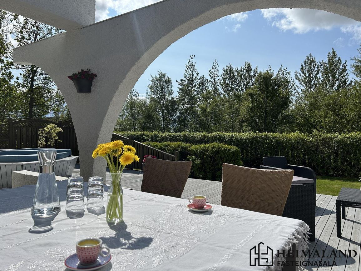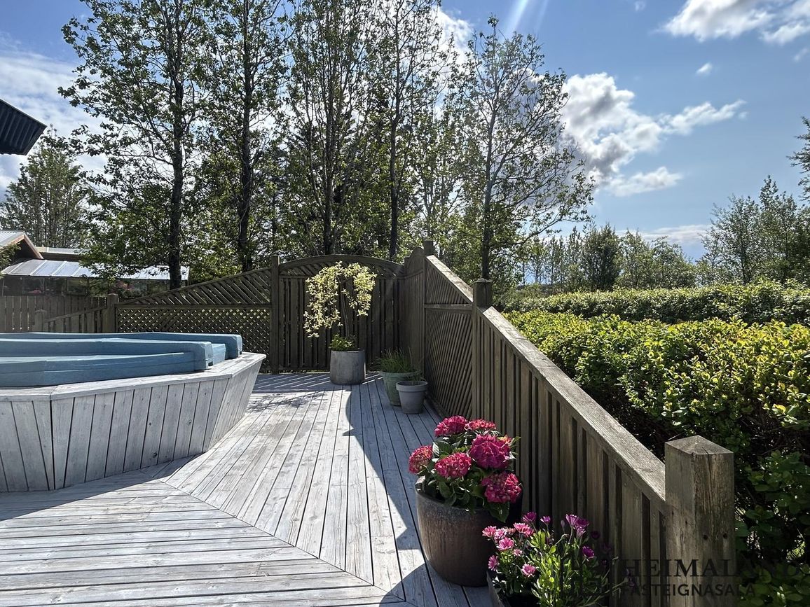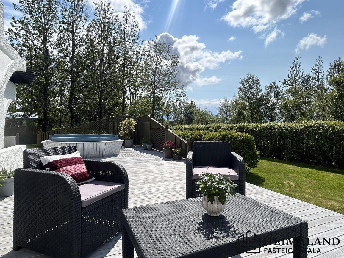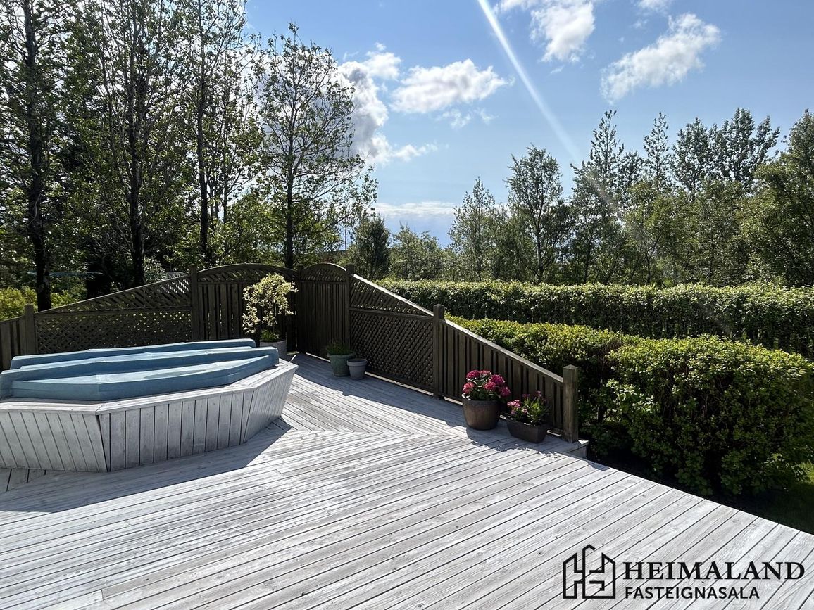 Gróinn garður með heitum potti, sólpalli til suðurs og steyptri verönd.