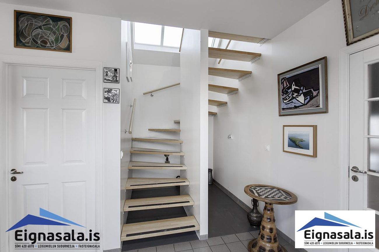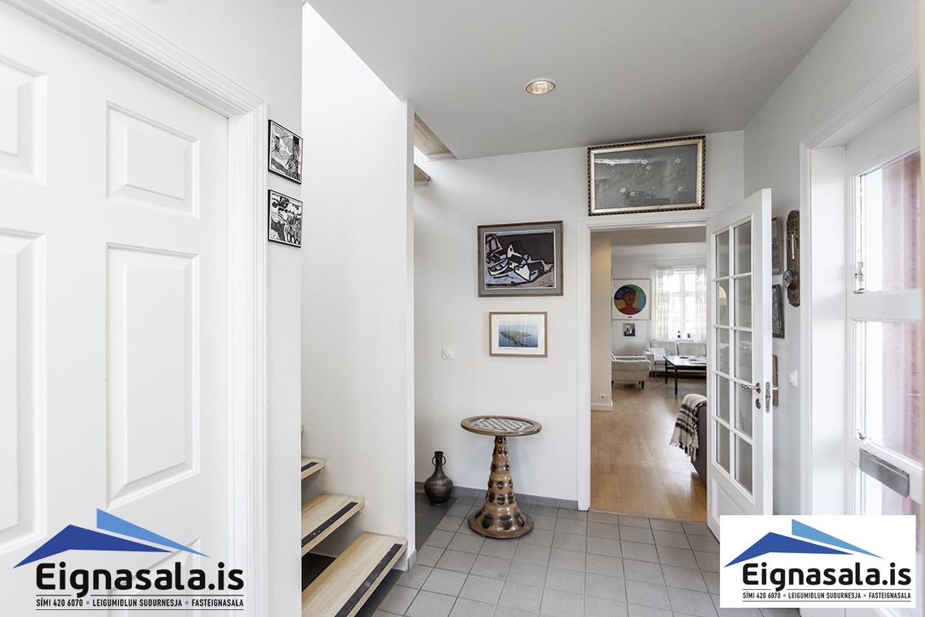 Íbúð á hæð og risi: Anddyri með flísum. Salerni innaf anddyri. Stórt eldhús og alrými. Vönduð og stór eldhúsinnrétting, með garnít borðplötum. Eldhús eyja, með gufugleypi, borðplata úr grantí sem getur líka nýst sem eldhúsborð. Borðstofa og tvískipt stofa með parketi á gólfum. Stigi í anddyri uppá rishæð. Þar er baðherbergi með sturtuklefa. Hol og sjónvarpsherbergi og hjónaherbergi innaf.