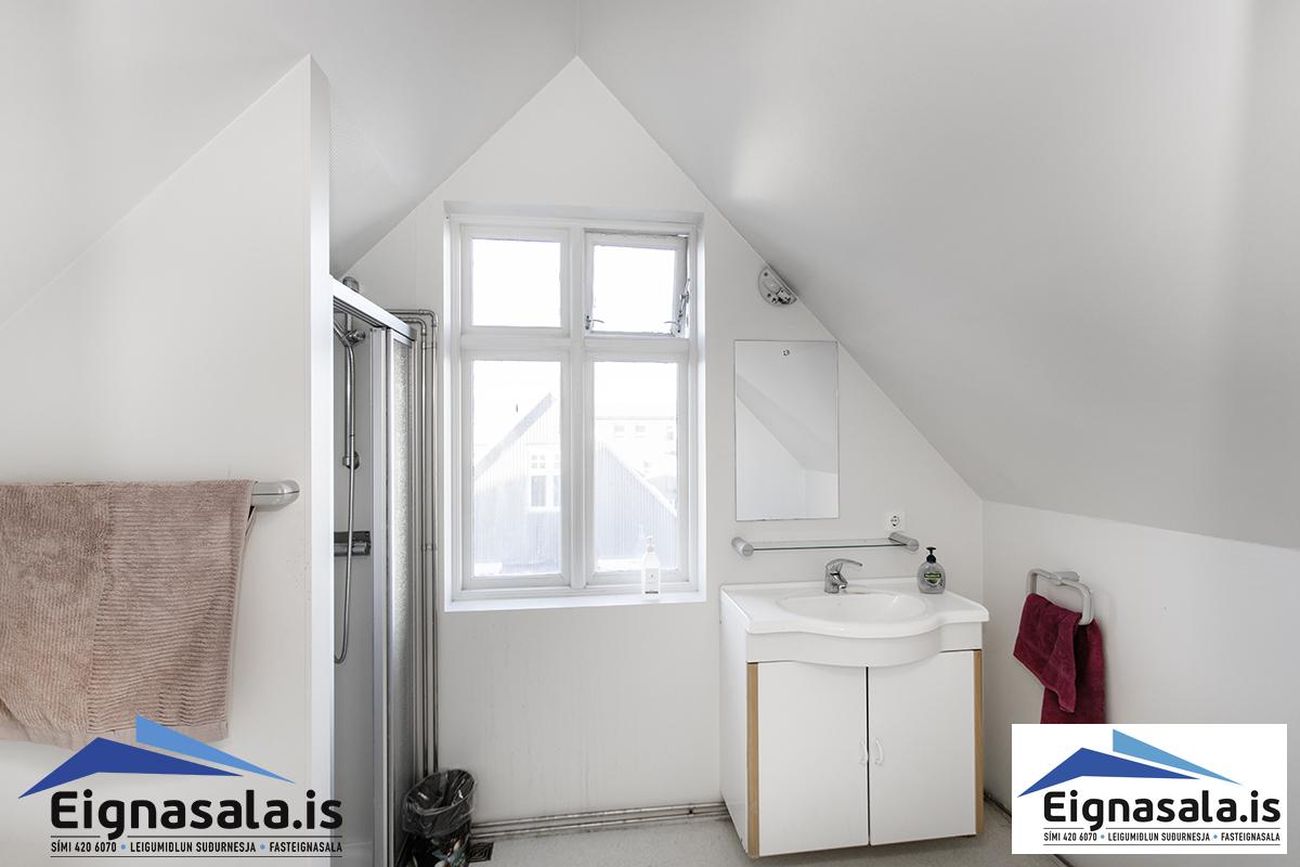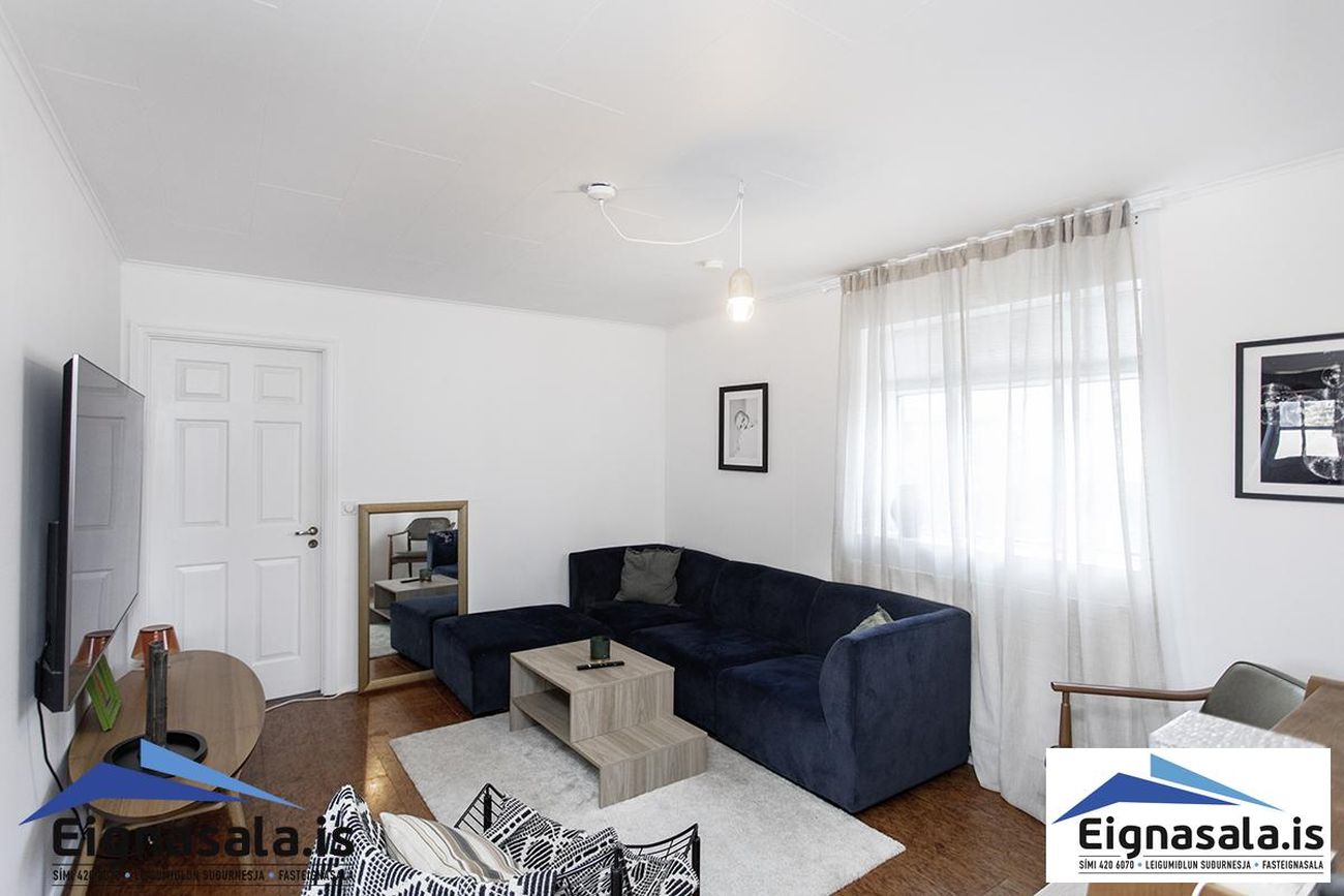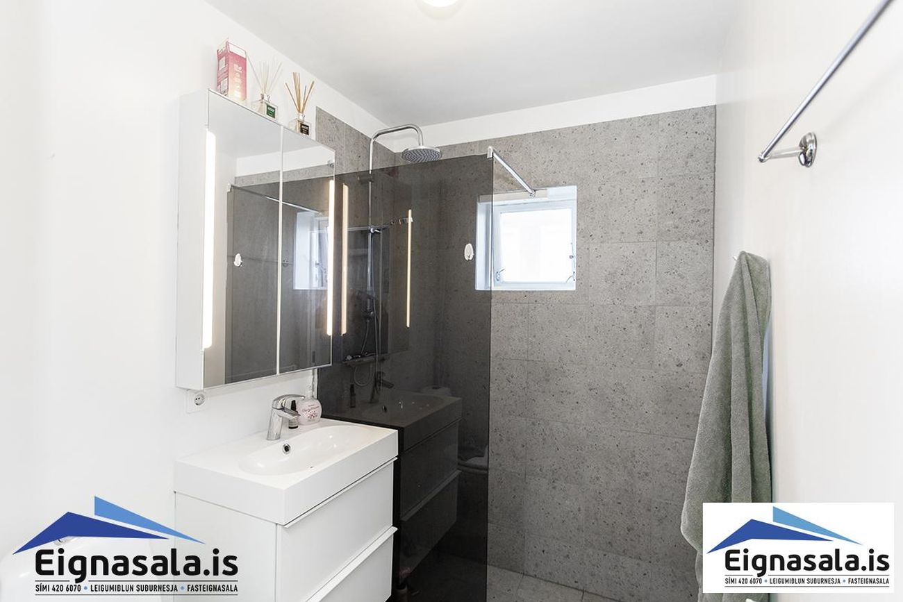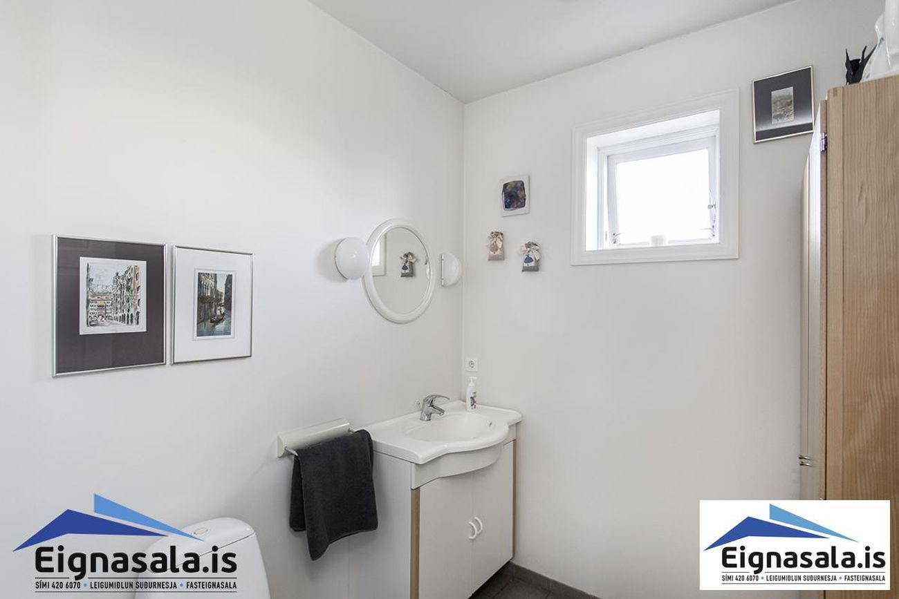 Íbúð í kjallar: Rúmgott anddyri flísalagt. Engurnýjað baðherbergi með sturtuklefa. Þvottahús og geymsla innaf anddyri. Stofa með spónarparketi.