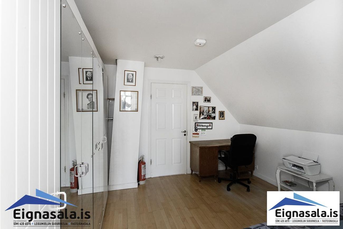 Tvö svefnherbergi með máluðum gólfum. Búið er að loka milli hæða og er íbúðin í útleigu.