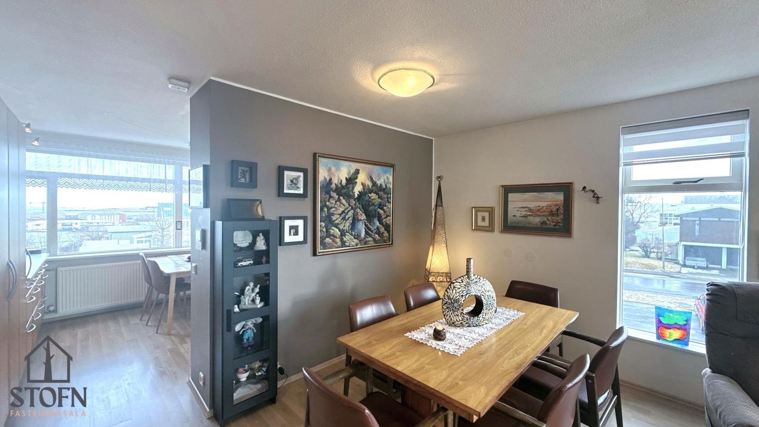 Stofa / borðstofa: Björt og rúmgóð stofa og borðstofa með parketi á gólfi og stórum gluggum sem hleypa inn mikilli birtu. Úr stofu er útgengt á suðursvalir með fallegu útsýni. Núverandi skipulag býður upp á rúmgott alrými, en auðvelt er að útbúa þriðja svefnherbergið á ný þar sem borðstofan er í dag.