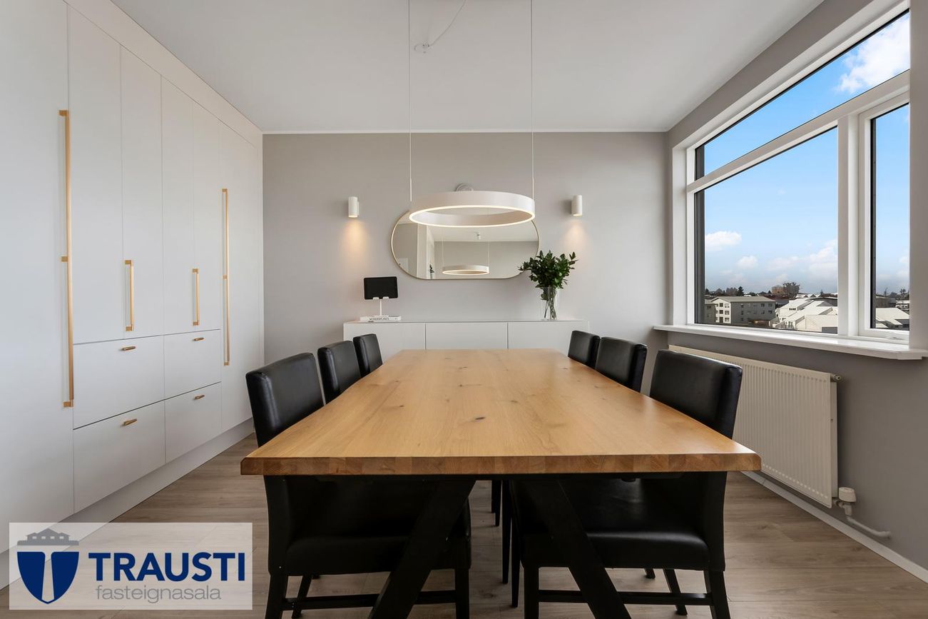 Eldhús: Bjart og rúmgott eldhús með góðri vinnuaðstöðu, miklu skápaplássi og rúmgóðum borðkrók við stóran glugga. Þaðan er vítt útsýni yfir höfuðborgarsvæðið, Esjuna og Snæfellsjökul, og á fallegum kvöldum er einstakt að horfa á kvöldsólina setjast í vestri.