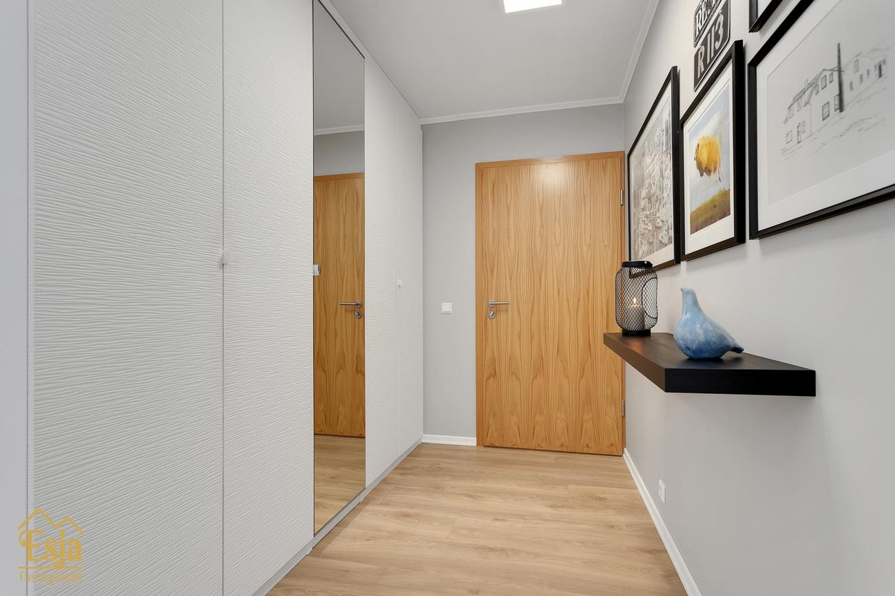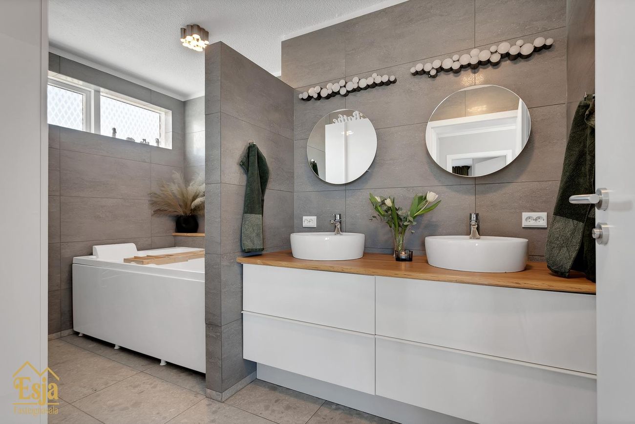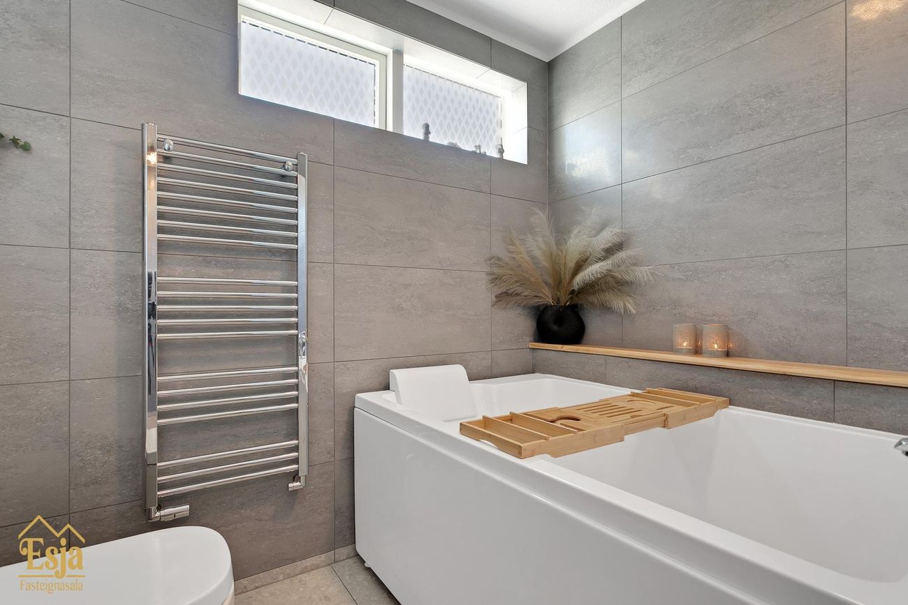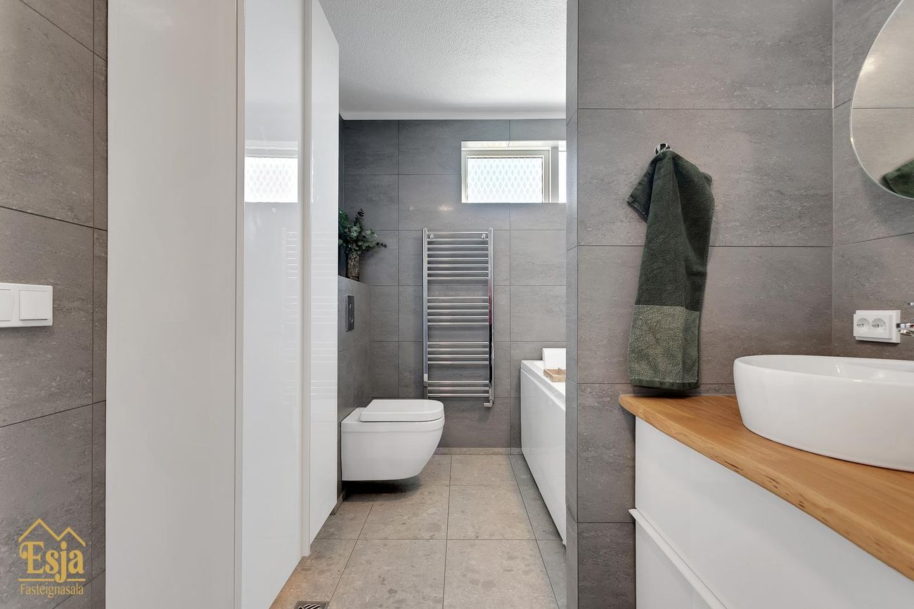 Baðherbergi er rúmgott, nýlega endurnýjað með stóru (tvöföldu) baðkari, upphengdu salerni, handklæðaofni, 2 vöskum og innréttingu með góðu hirsluplássi. Þar er opnanlegur gluggi. Þvottahús, pláss fyrir þvottavél og þurrkara, innrétting og vaskur