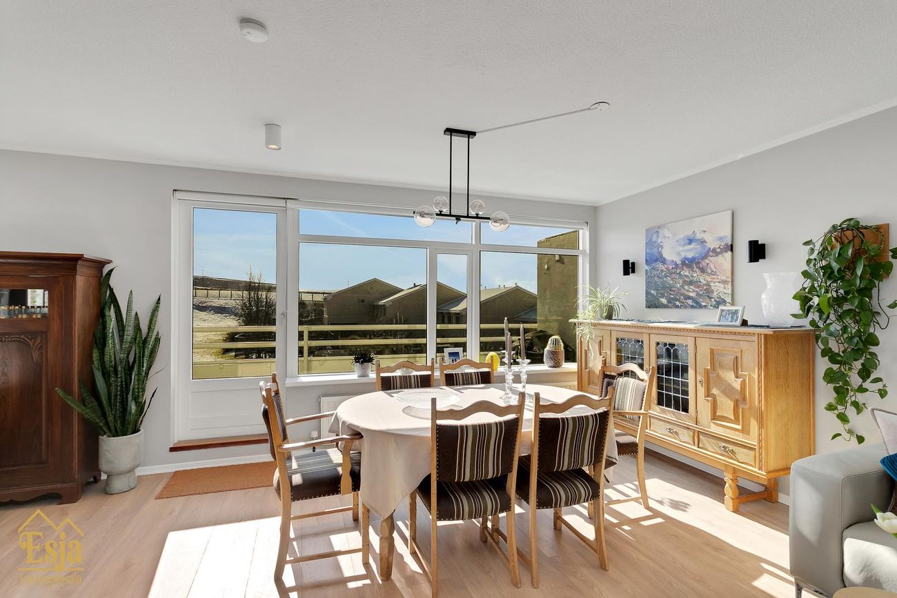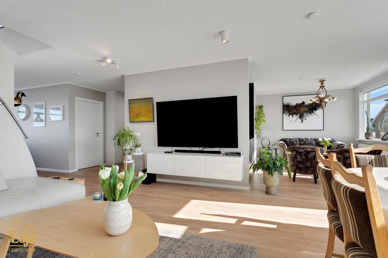 Stórar stofur með gluggum í suður og svölum. Inn af stofunni er nú innréttuð setustofa með innfelldum hilluskáp, þarna er gert ráð fyrir fimmta herberginu sem auðvelt er að útbúa með léttum vegg.
