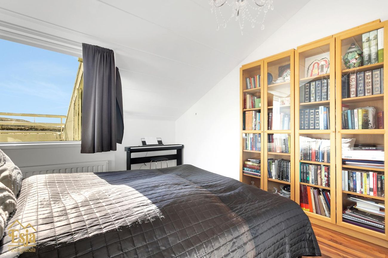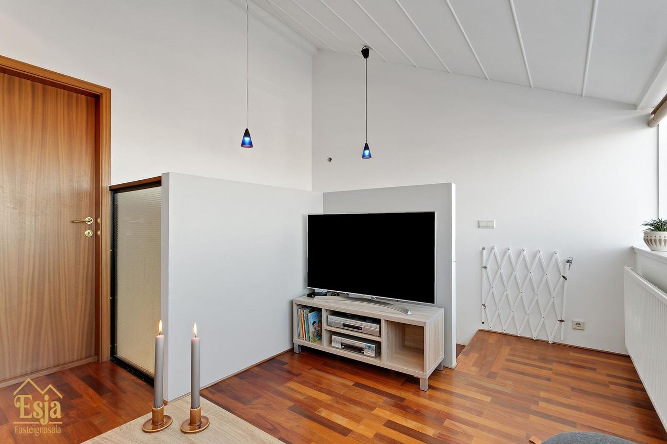 Efri hæðin er fjölskylduvæn, þar er rúmgott sjónvarpshol fyrir miðju rýminu. Herbergin eru 3, öll aðeins undir súð sem gerir þau stærri að gólffleti og bætir nýtanlegt pláss. Aukin lofthæð er yfir hluta efri hæðarinnar.