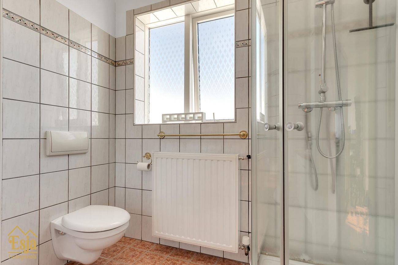 Baðherbergi er flísalagt með innréttingu, upphengdu salerni og nýlegum sturtuklefa og opnanlegum glugga.