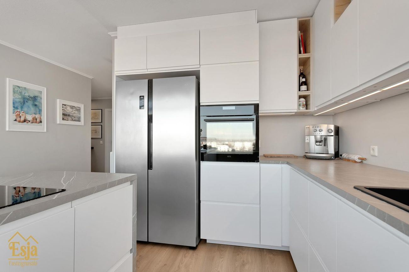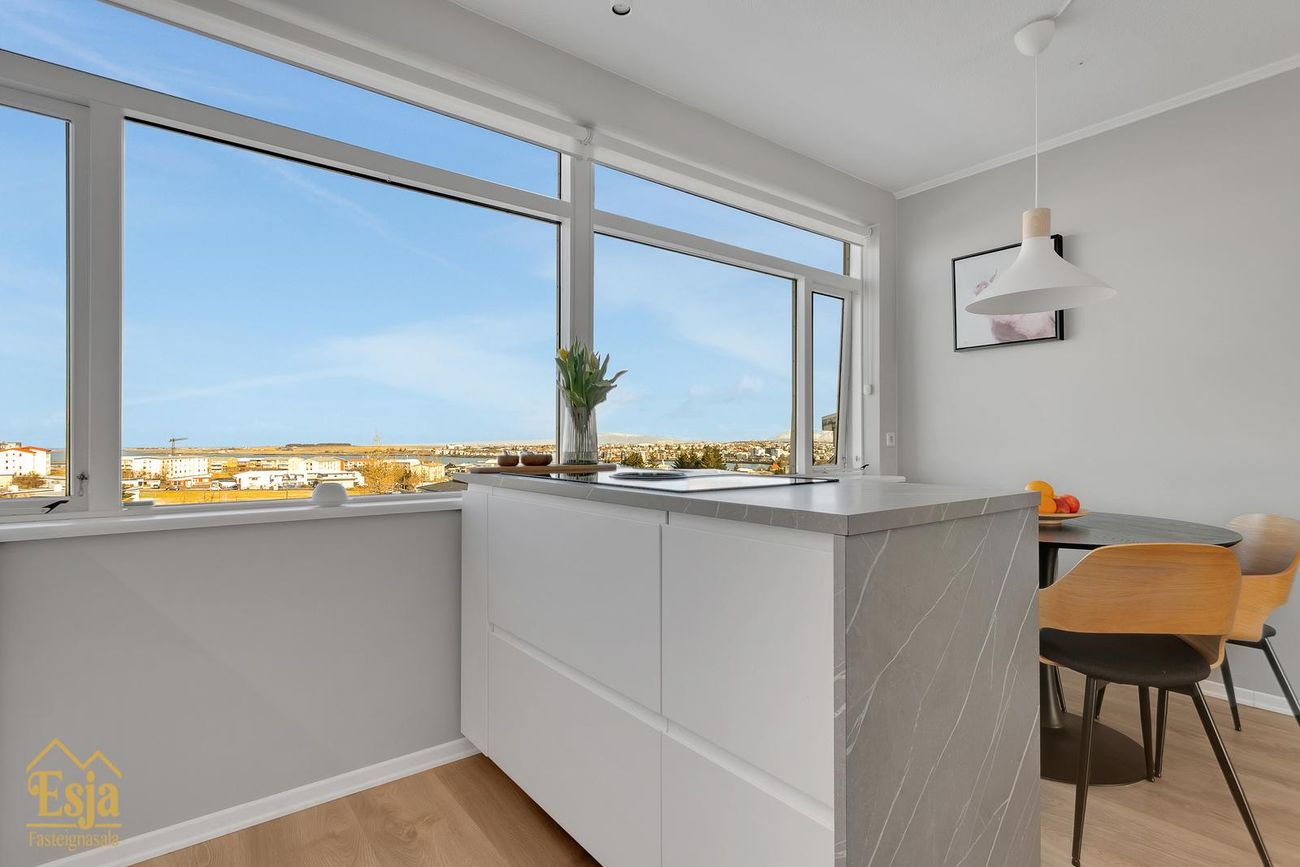 Eldhúsið er glæsilegt, nýleg innrétting þar sem gert er ráð fyrir tvöföldum ísskáp, innbyggðum ofni og góðu hirslu og bekkplássi, eyja með span helluborði með innbyggðum háf skiptir rýminu aðeins upp en góður borðkrókur rúmar vel borð fyrir 6 manns. Frá eldhúsinu er frábært útsýni yfir Hafnarfjörðinn og víðar.