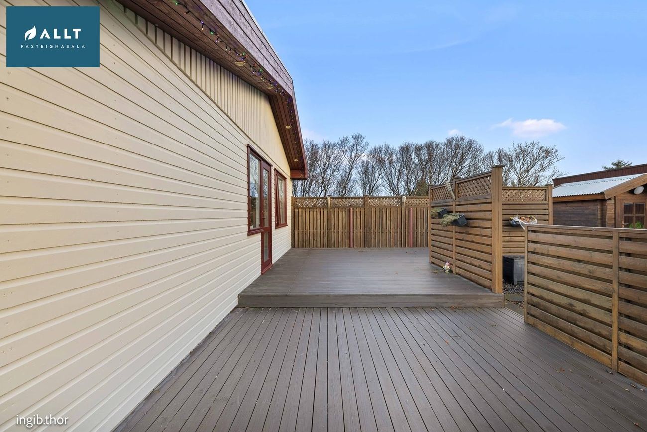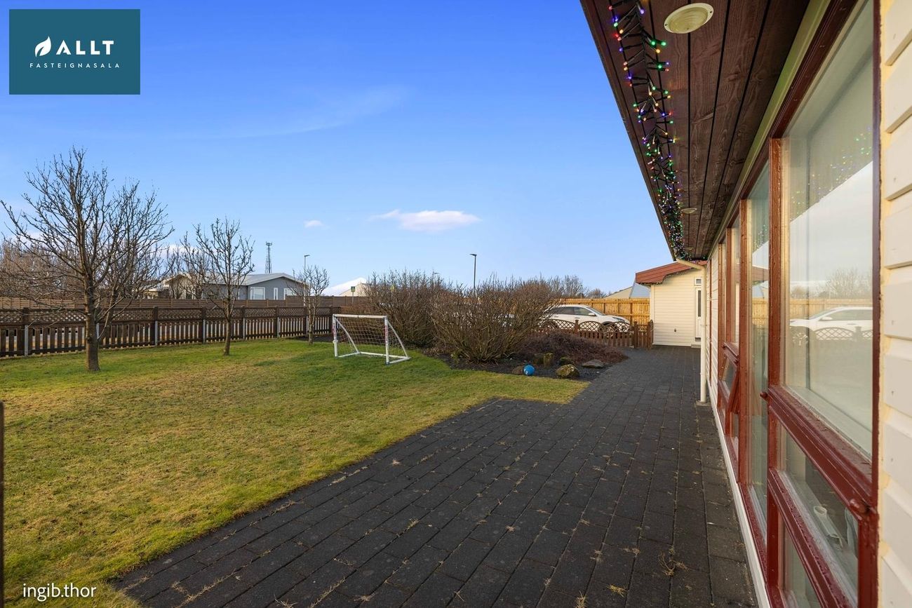 Lóð er afgirt að framanverðu og við sólpall. Grasbali framan og aftan við hús. Töluvert af trjám og gróðri er á lóð. Gönguleiðir og bílastæði hellulagt. Sólpallur með innangengi inn í borðstofu. 8 fm kofi á lóð.