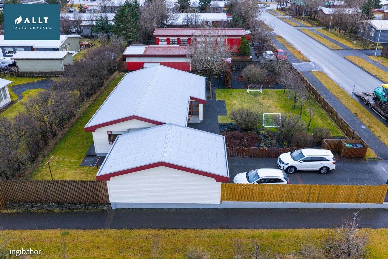 Eignin skiptist í forstofu, forstofuherbergi, gestasalerni, þvottahús, eldhús, borðstofur, stofa. Herbergjagangur er með þremur herbergjum, baðherbergi og gluggalausu útskotsrými. Innangengt er í bílskúr sem er með grifju.