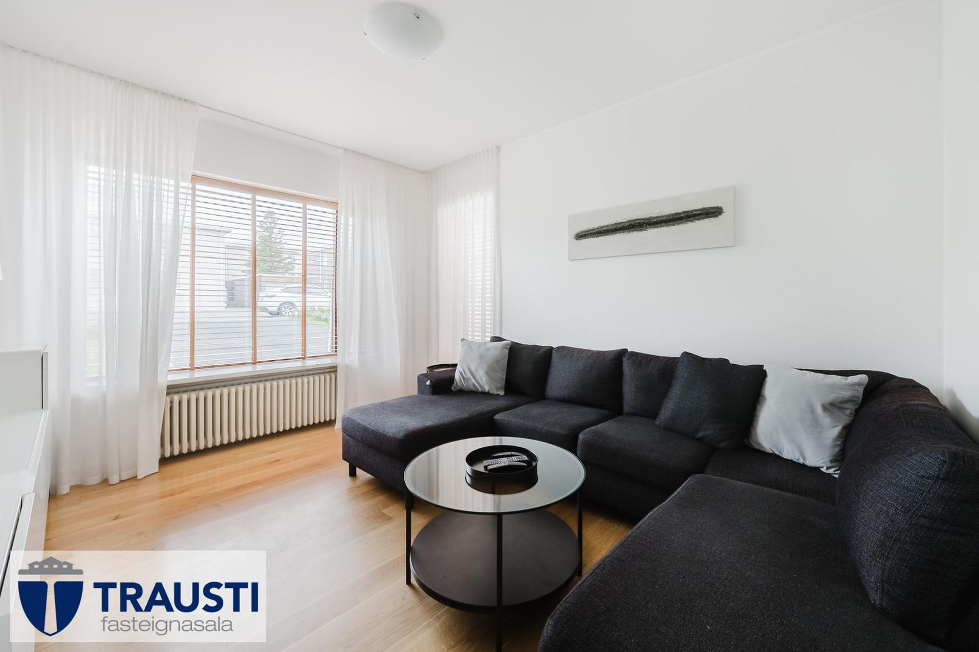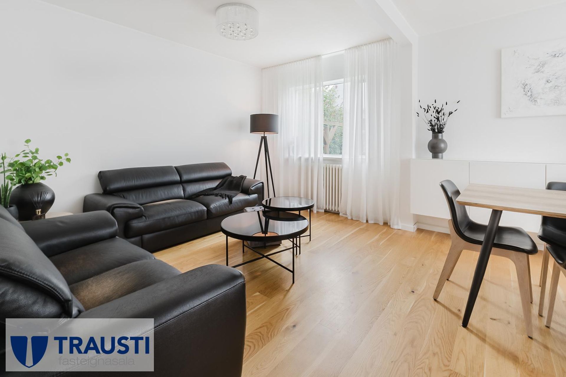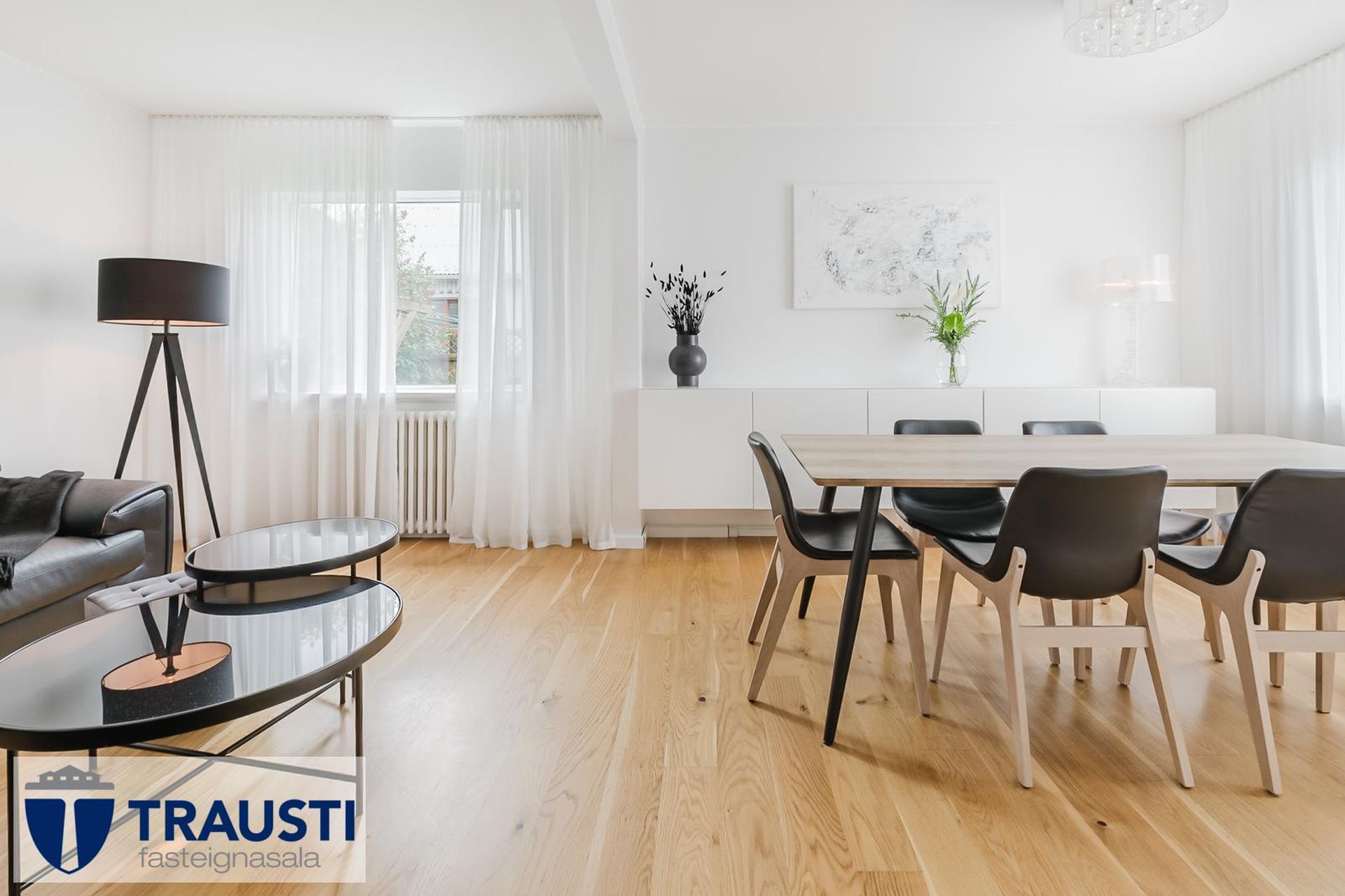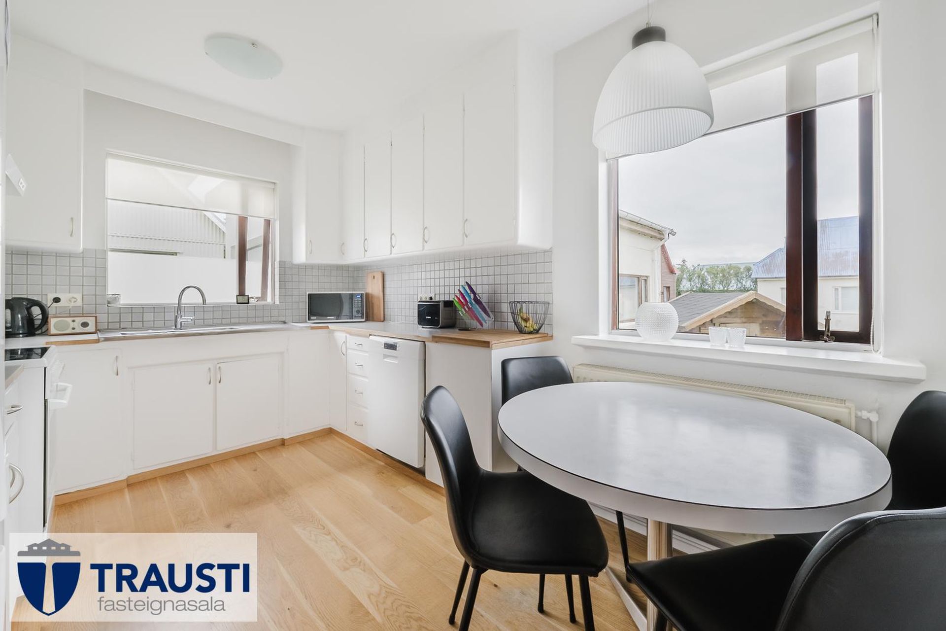 Stofa og borðstofa parketlögð og með glugga á tvo vegu.