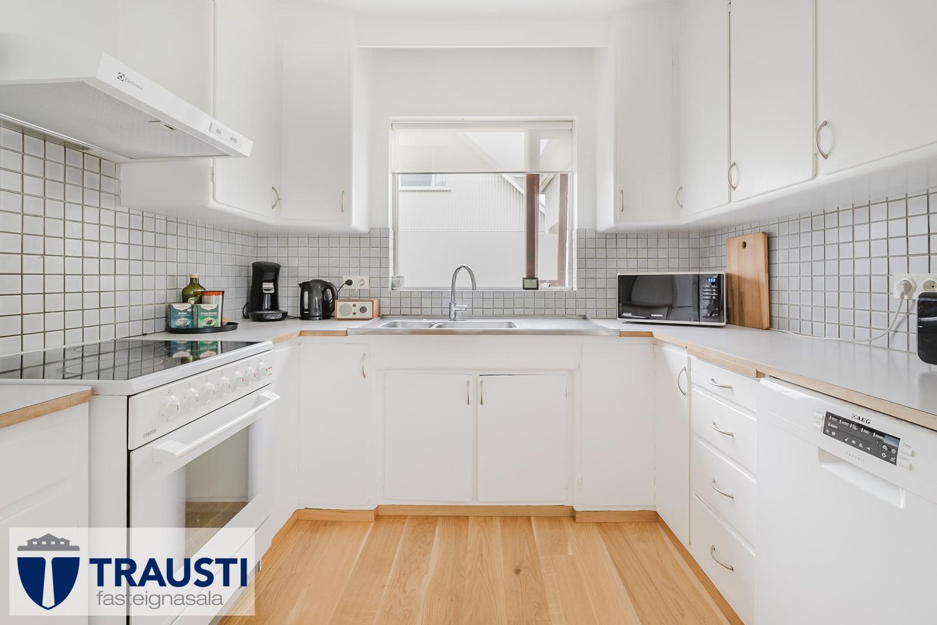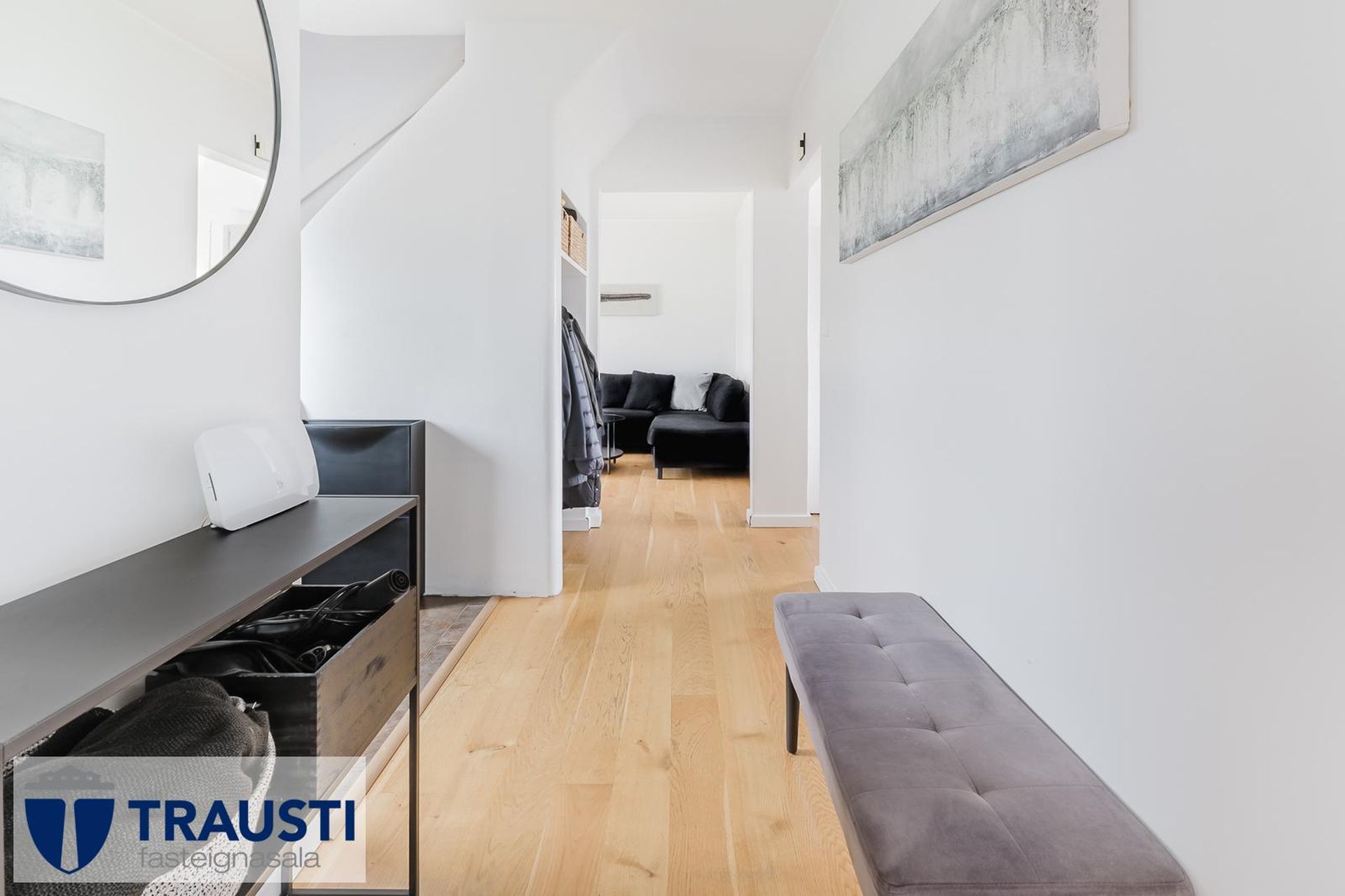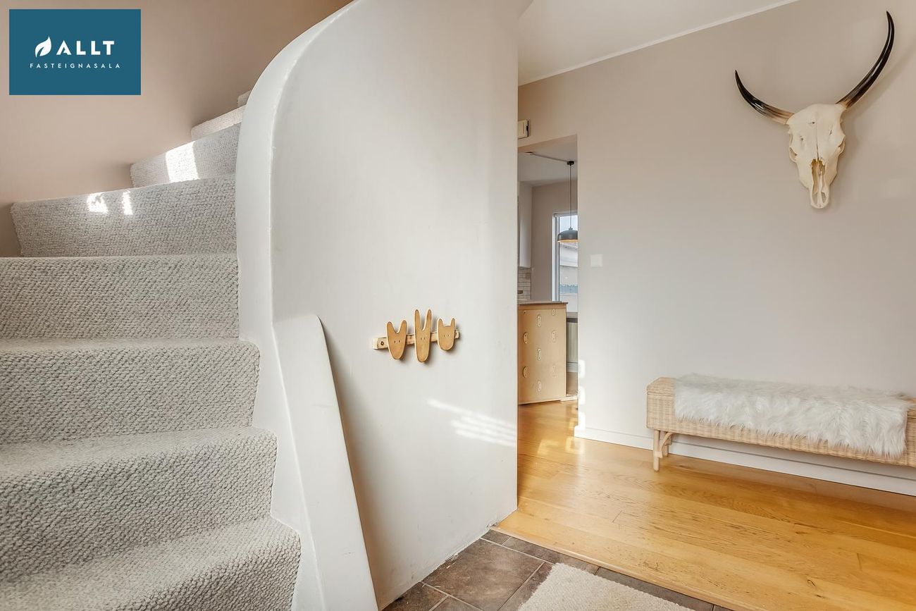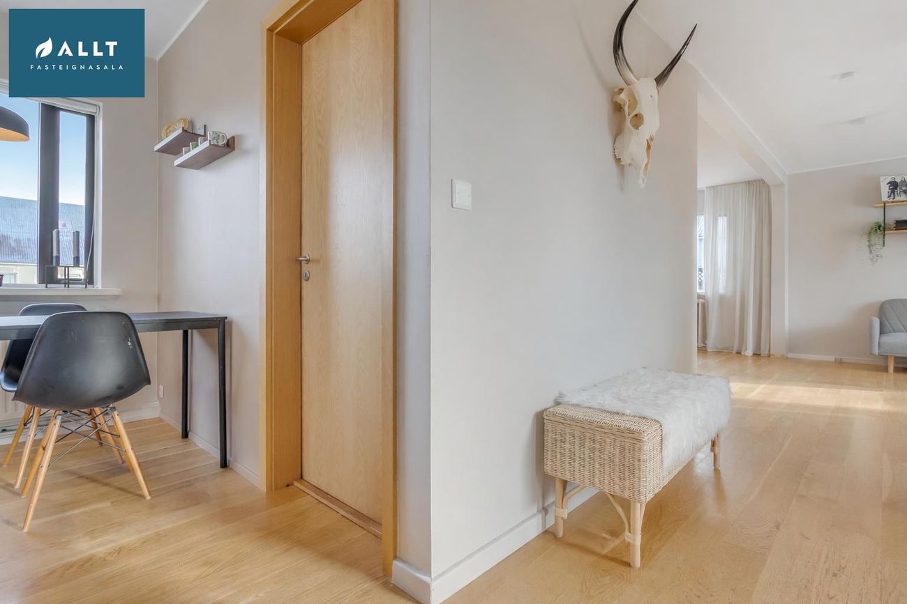 Efrihæðin var endurnýjuð árið 2025, parket og hurðar.