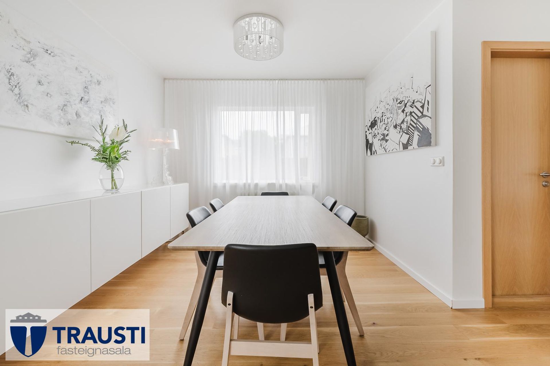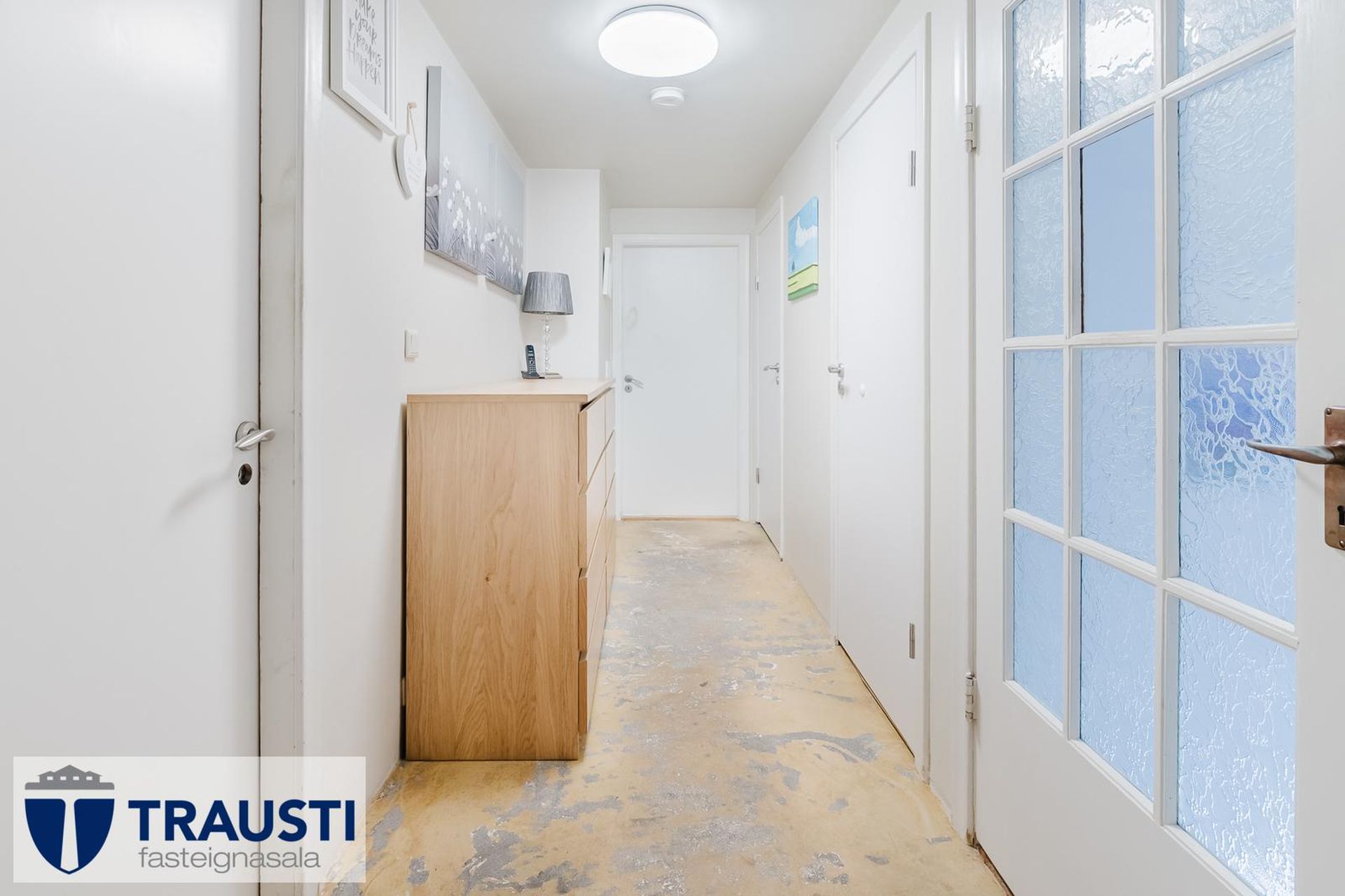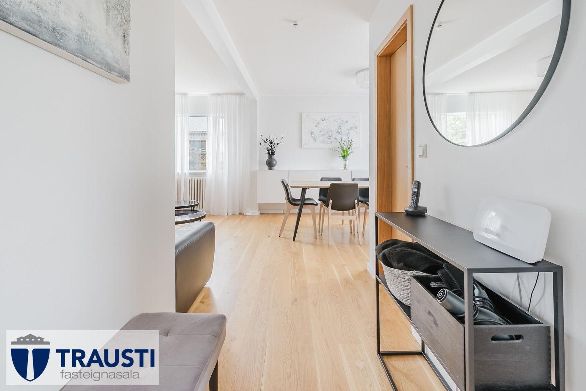 Efrihæðin var endurnýjuð árið 2025, parket og hurðar.