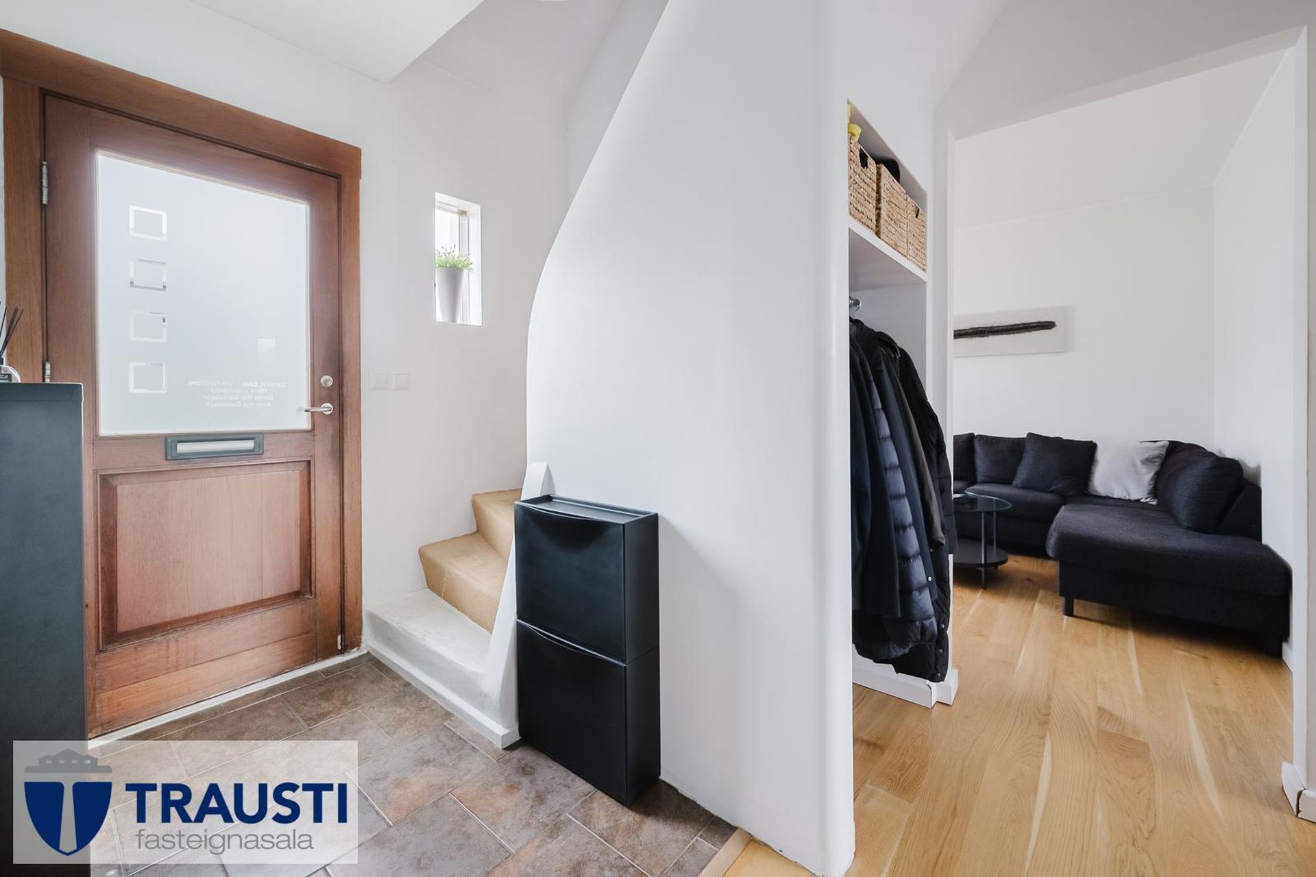 Forstofa: Físalögð, fatahengi er undir stiga.