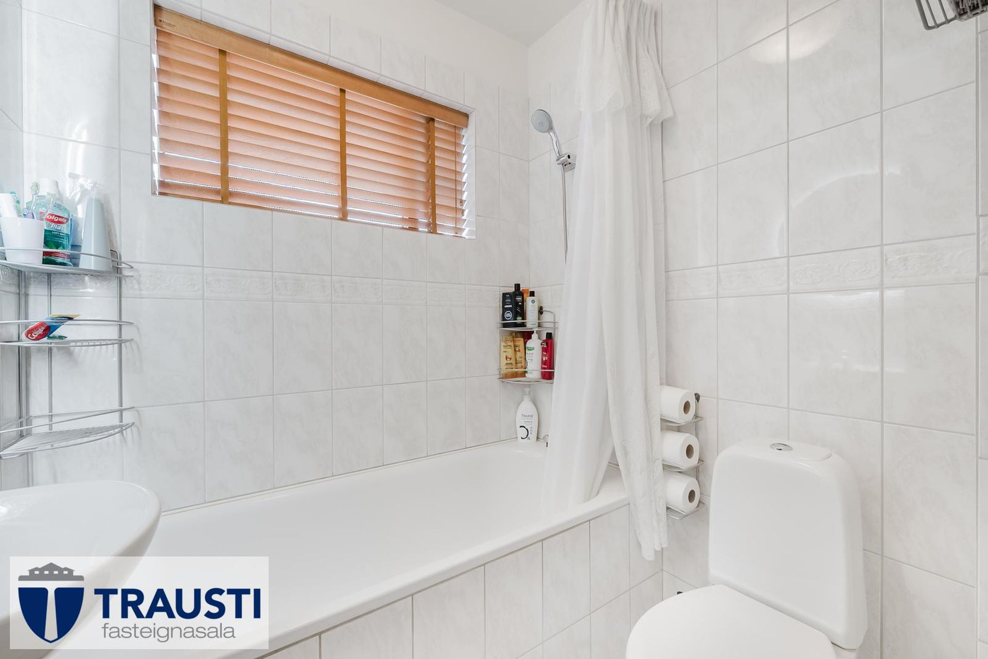 Baðherbergi: er flísalagt, baðkar með sturtuaðstöðu. Salerni og vaskur.