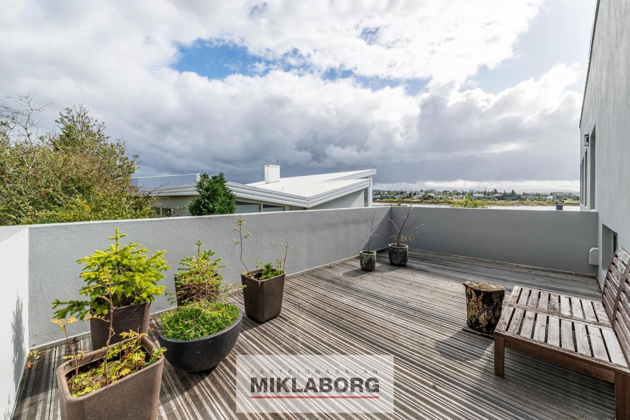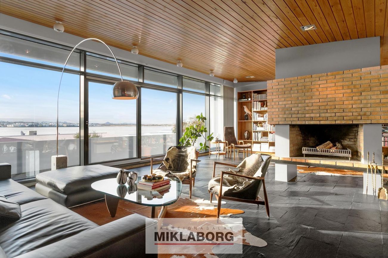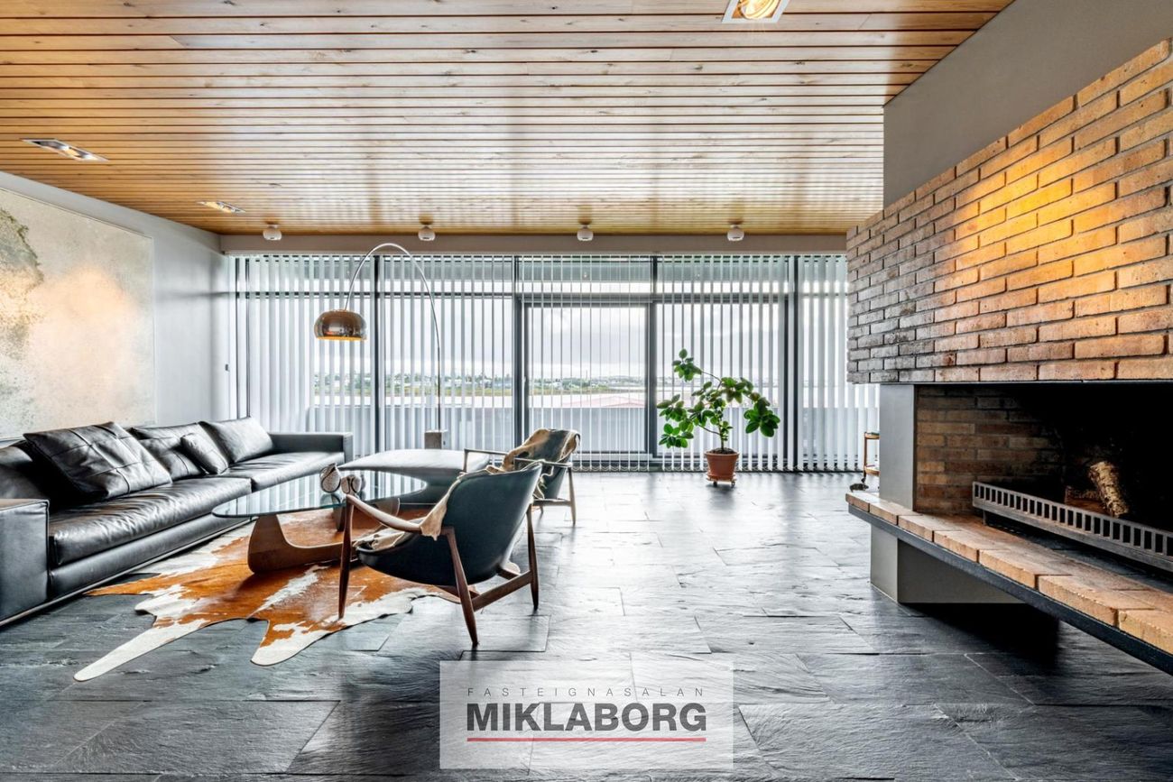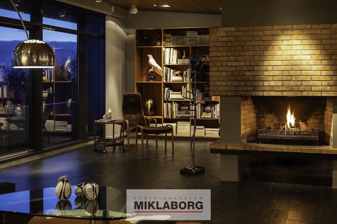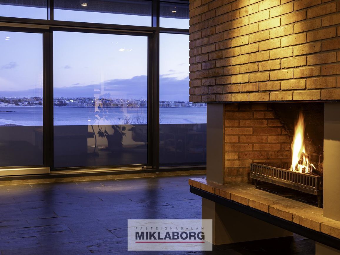 Fallegur stigi leiðir upp á efri hæðina þar sem stórar og bjartar stofur taka við. Í stofunni er höfugur arinn, sem er miðpunktur rýmisins, fullkominn til að skapa hlýleika. Útgengt er úr stofunni á stórar útsýnissvalir sem liggja meðfram húsinu að framan, þar sem einstakt útsýni yfir voginn og til Reykjaness nýtur sín til fulls. Þær bjóða upp á fullkomið rými til að njóta bæði dagsins og náttúrunnar, hvort sem það er á miðjum degi eða á kvöldin með sólarlaginu. Einnig er á austurhlið hússins notaleg verönd, þar sem morgunsólin baðar svæðið. Það er tilvalinn staður fyrir kaffibolla og að byrja daginn í ró og næði.