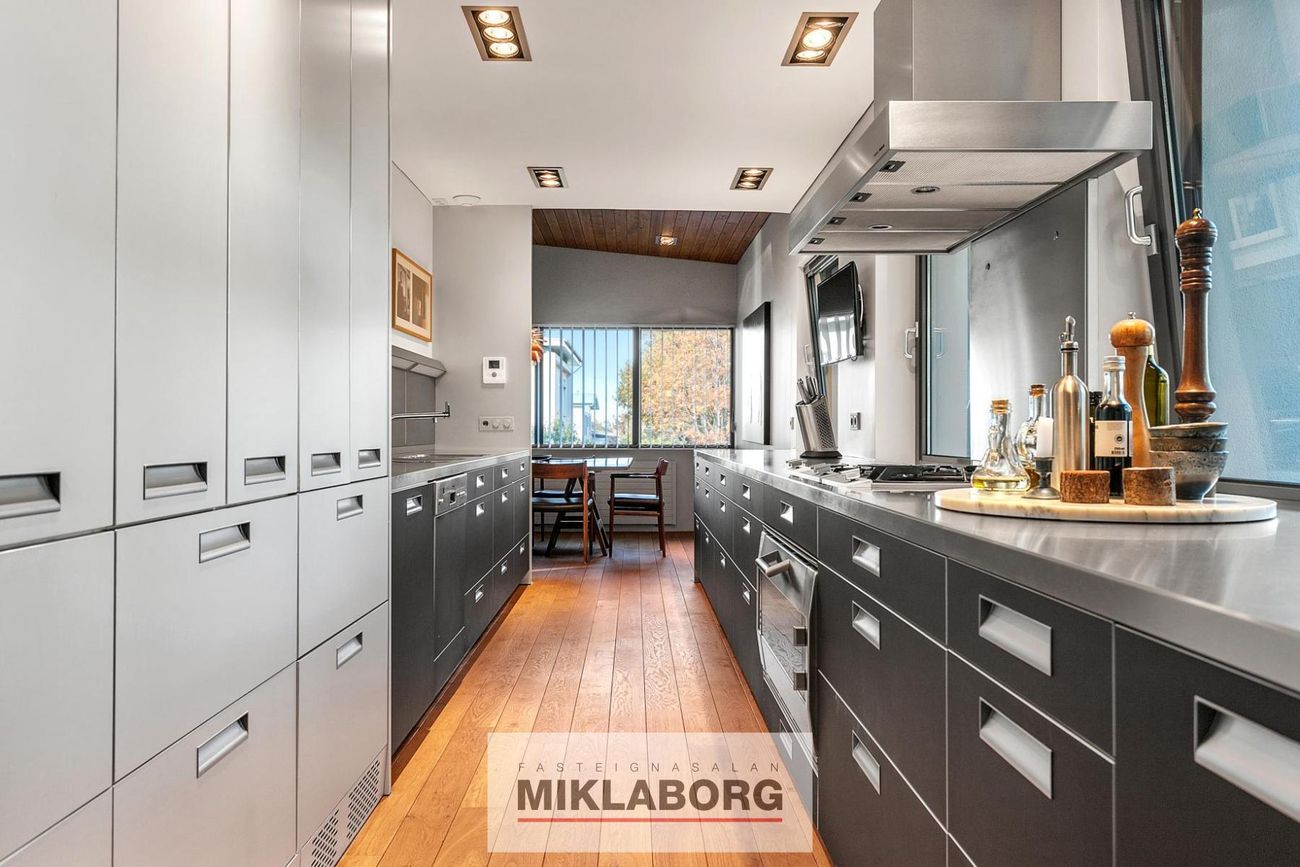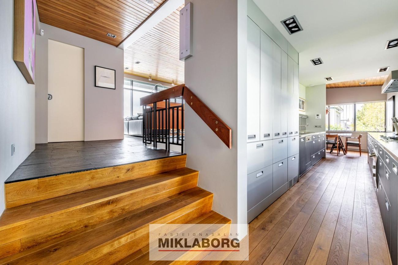 Allir gluggar hússins hafa verið endurnýjaðir með vönduðum hætti, sem undirstrikar vel viðhaldið á húsinu. Bulthaup eldhúsinnrétting með Gaggenau og Sub-Zero tækjum prýðir eldhúsið. Þar er mikið skápapláss og beint útgengi í bakgarð, þar sem gengið er upp á verönd. Allar stéttar utan húss og heimreið eru upphitaðar, sem auðveldar alla umhirðu á köldustu dögum ársins.