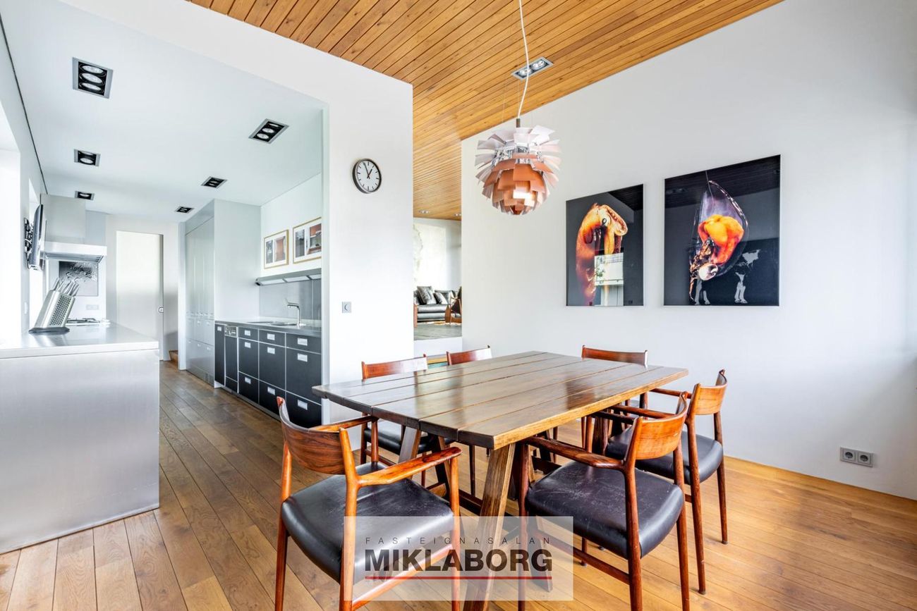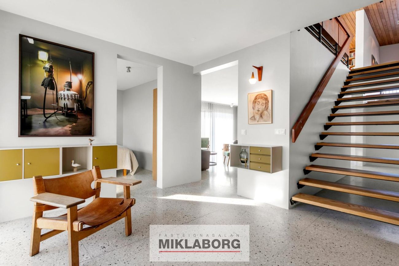 Húsið stallast fallega innbyrðis, sem gerir flæði á milli eldhúss, borðstofu og þvottahúss mjúkt og átakalaust. Í takt við tímann þegar húsið var byggt voru mörg svefnherbergi á fyrstu hæð, en núverandi eigendur hafa breytt þessu og skapað stærra alrými.