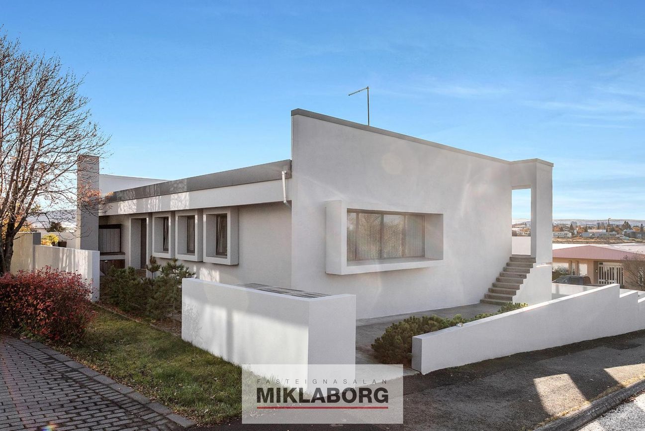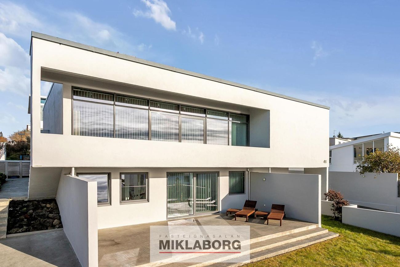 Sunnubraut 46 ber greinileg einkenni hans: skörp form, háir skjólveggir, stórir gluggar og hugvitssamlegt flæði birtu. Húsið er sterkt í nærveru, karakter og stíl – raunverulegt listaverk modernismans.