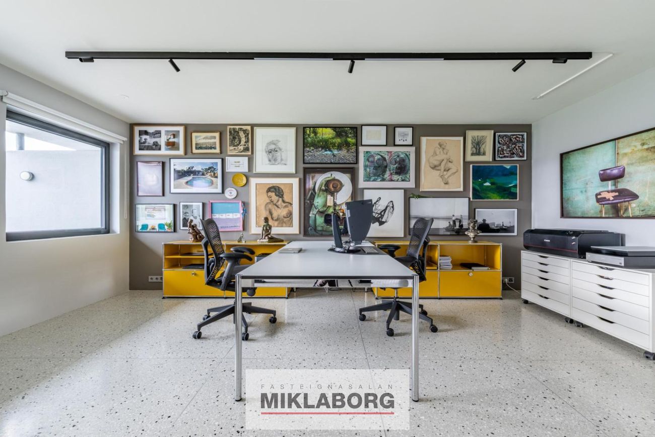 Neðri hæðin er með heilsteyptum terrazo-flísum sem slípaðar eru á staðnum og settar í álramma, en á efri hæðinni er náttúrusteinn ásamt gegnheilu parketi.