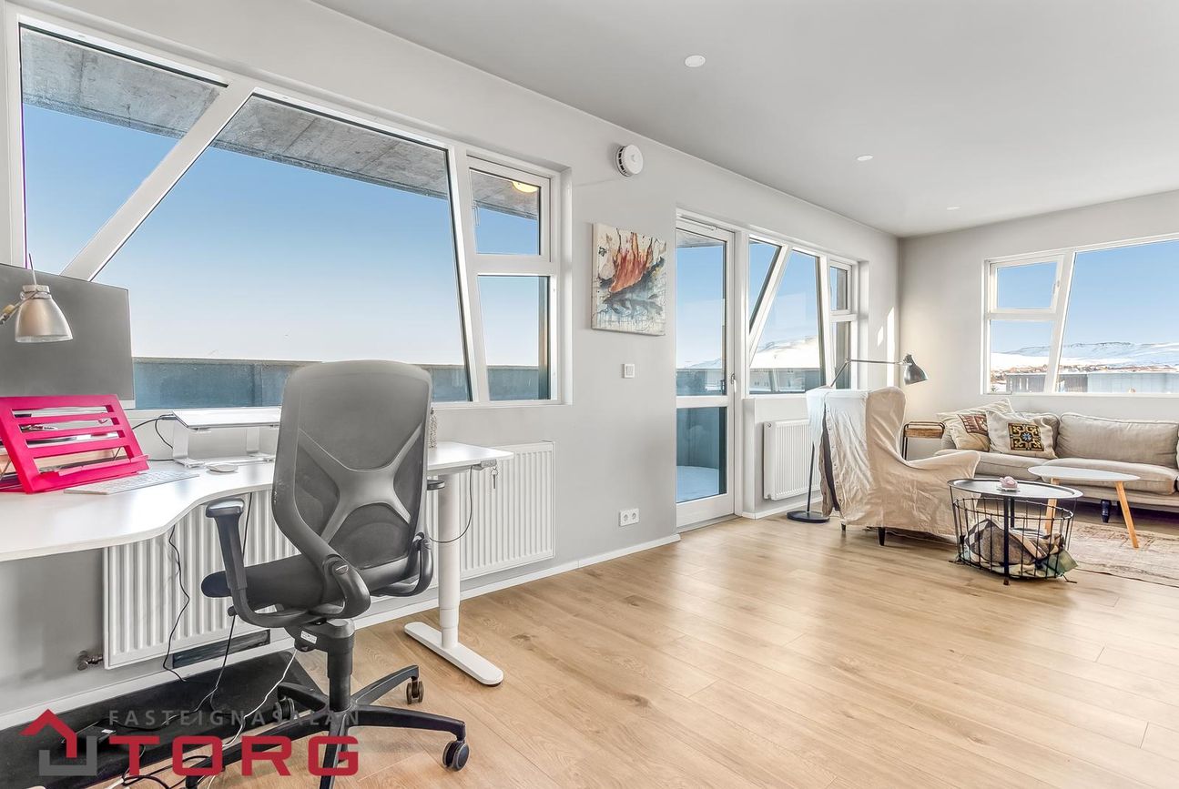 Stofa /eldhús/borðstofu eru í rúmgóðu og björtu opnu rými með harð parketi á gólfi. Úr stofu er útgengt á svalir í með fallegu útsýni.