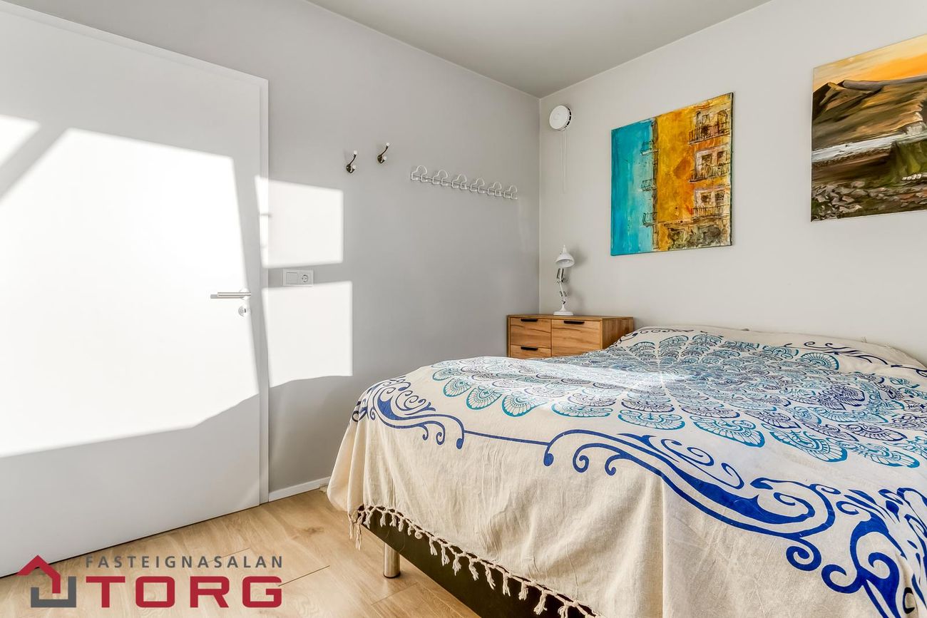 Svefnherbergi er rúmgott með harðparket iá gólfi og góðum fataskápum.