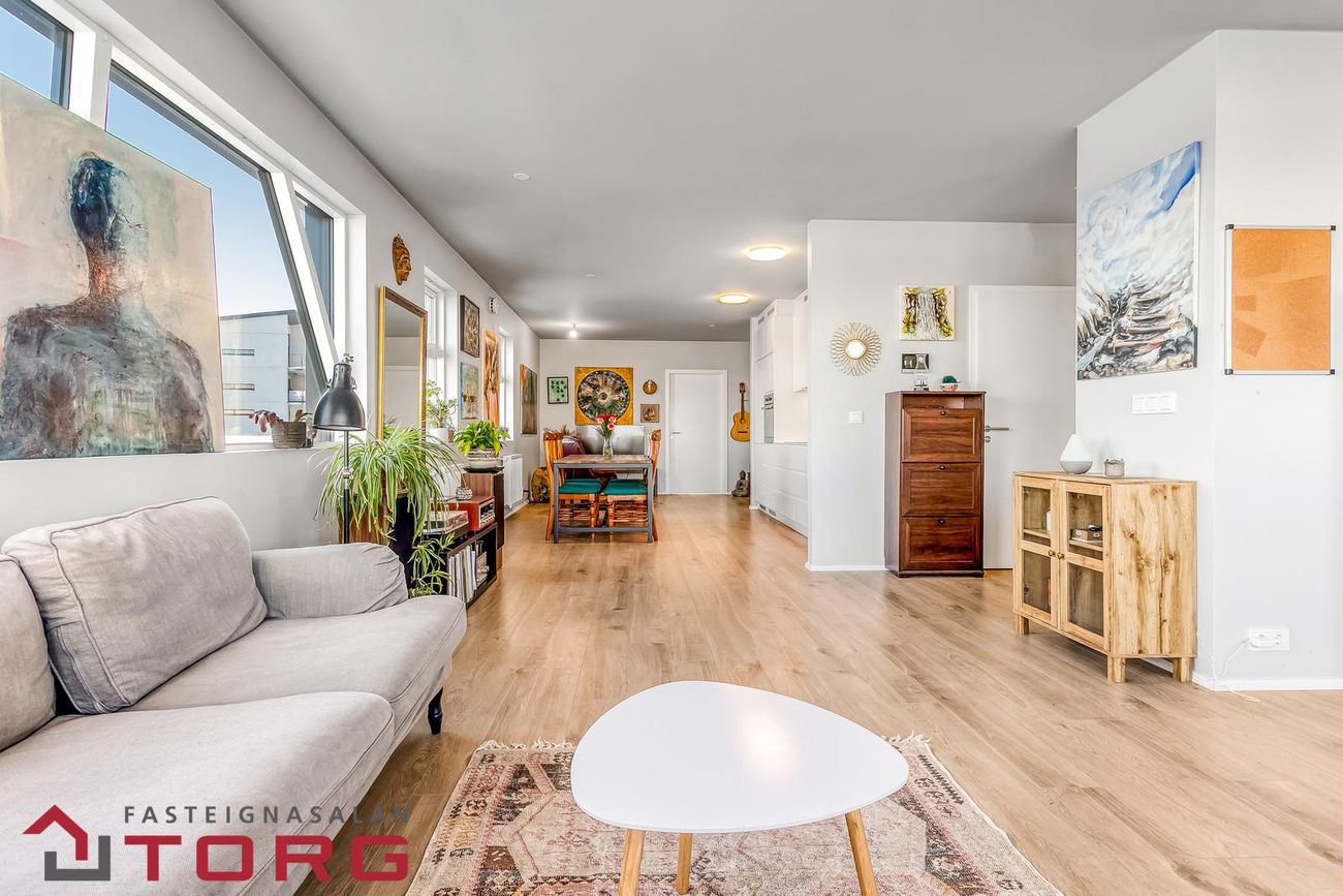 Stofa /eldhús/borðstofu eru í rúmgóðu og björtu opnu rými með harð parketi á gólfi. Úr stofu er útgengt á svalir í með fallegu útsýni.