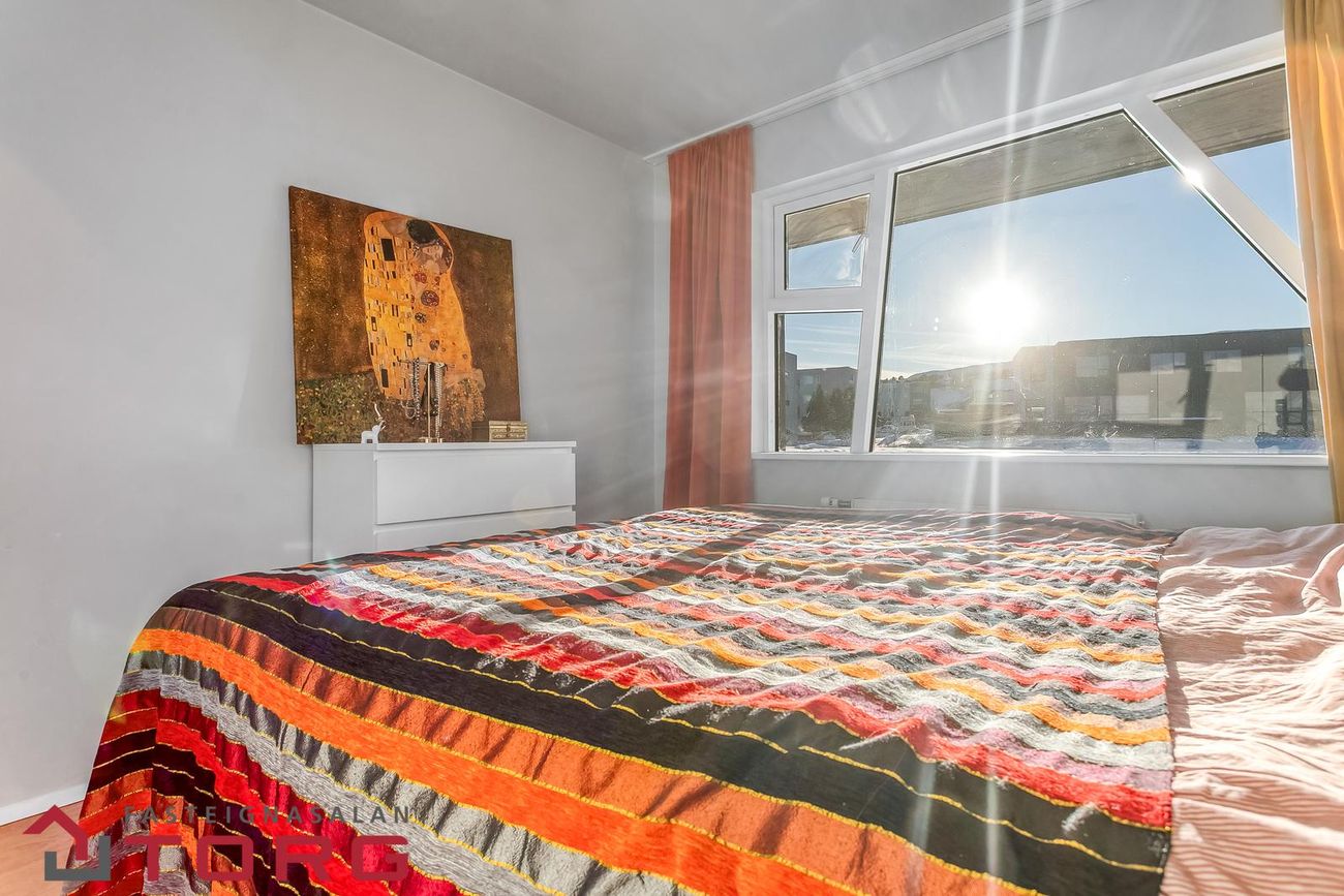 Svefnherbergi er rúmgott með harðparket iá gólfi og góðum fataskápum.