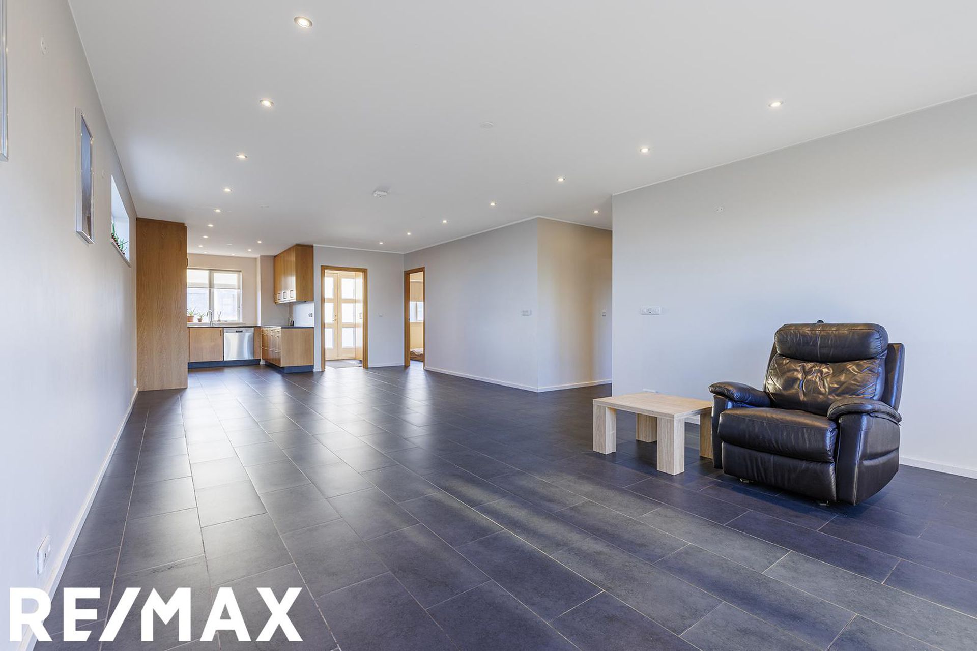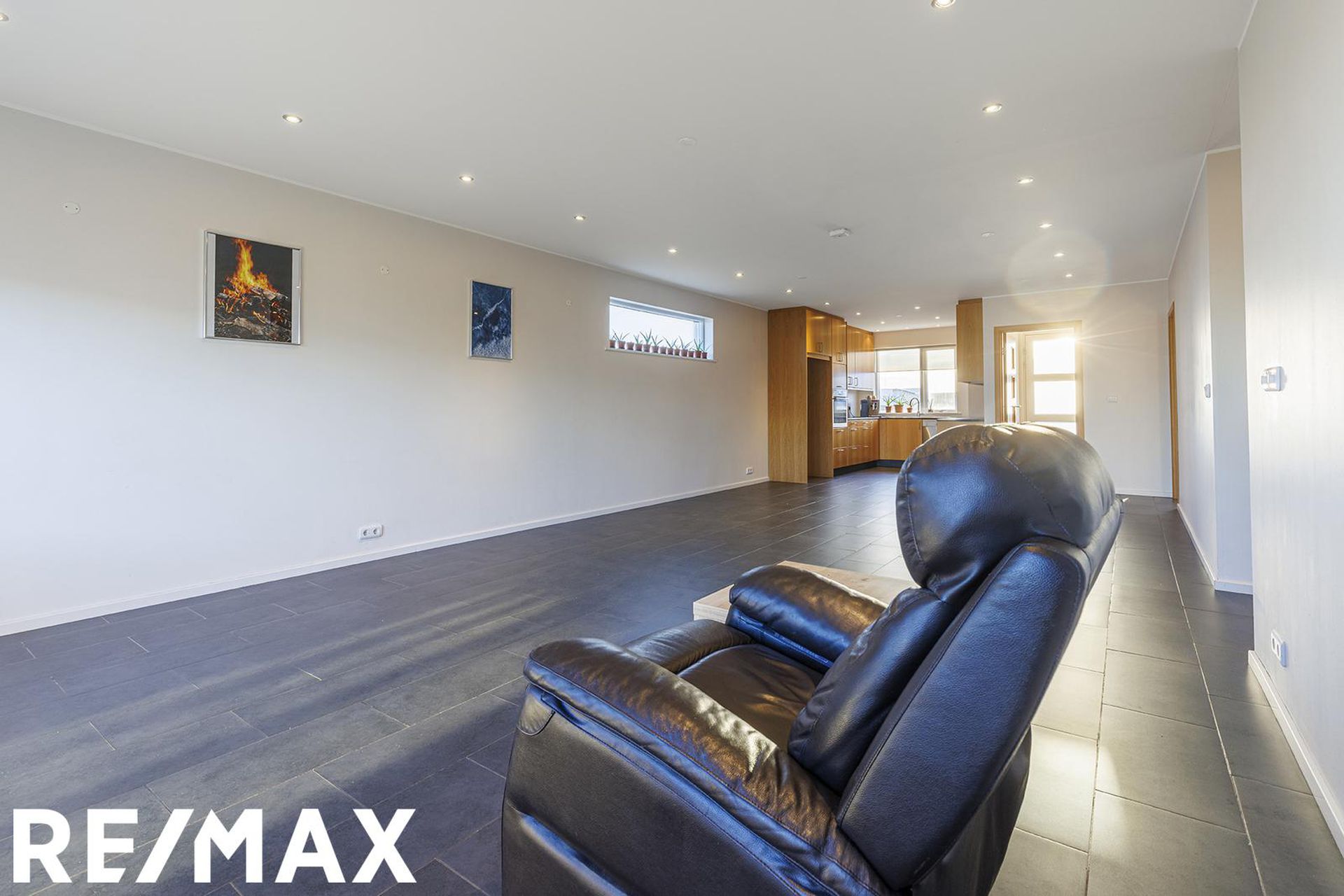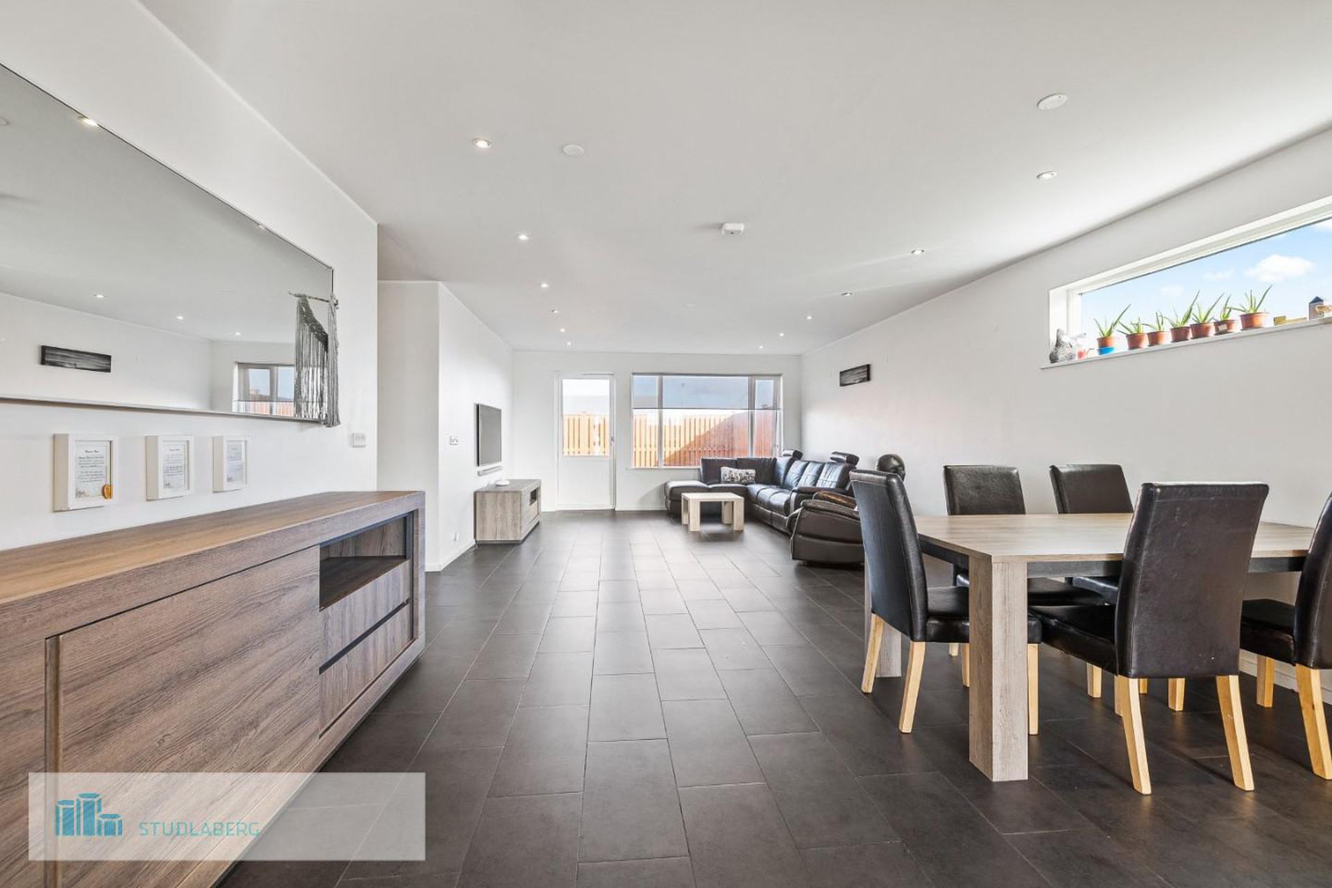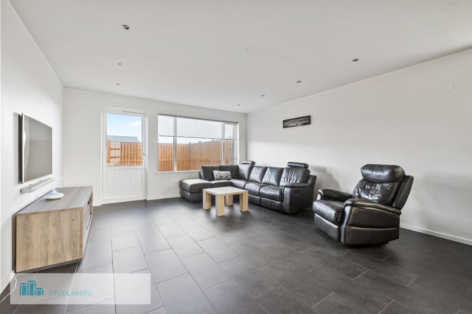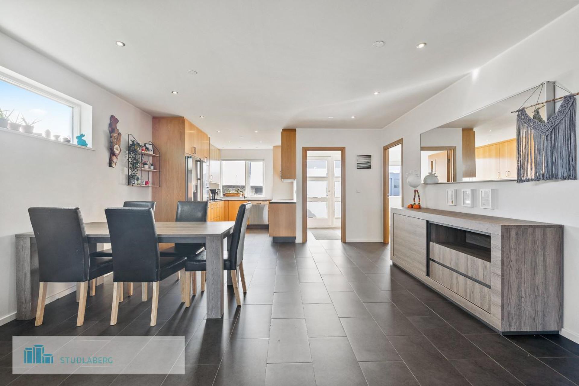 Stofa og borðstofa: Er í alrými með eldhúsi. Bjart og með útgengt út á stóra verönd ca 70 m2 með heitum potti. Útgengi út í garð frá verönd.