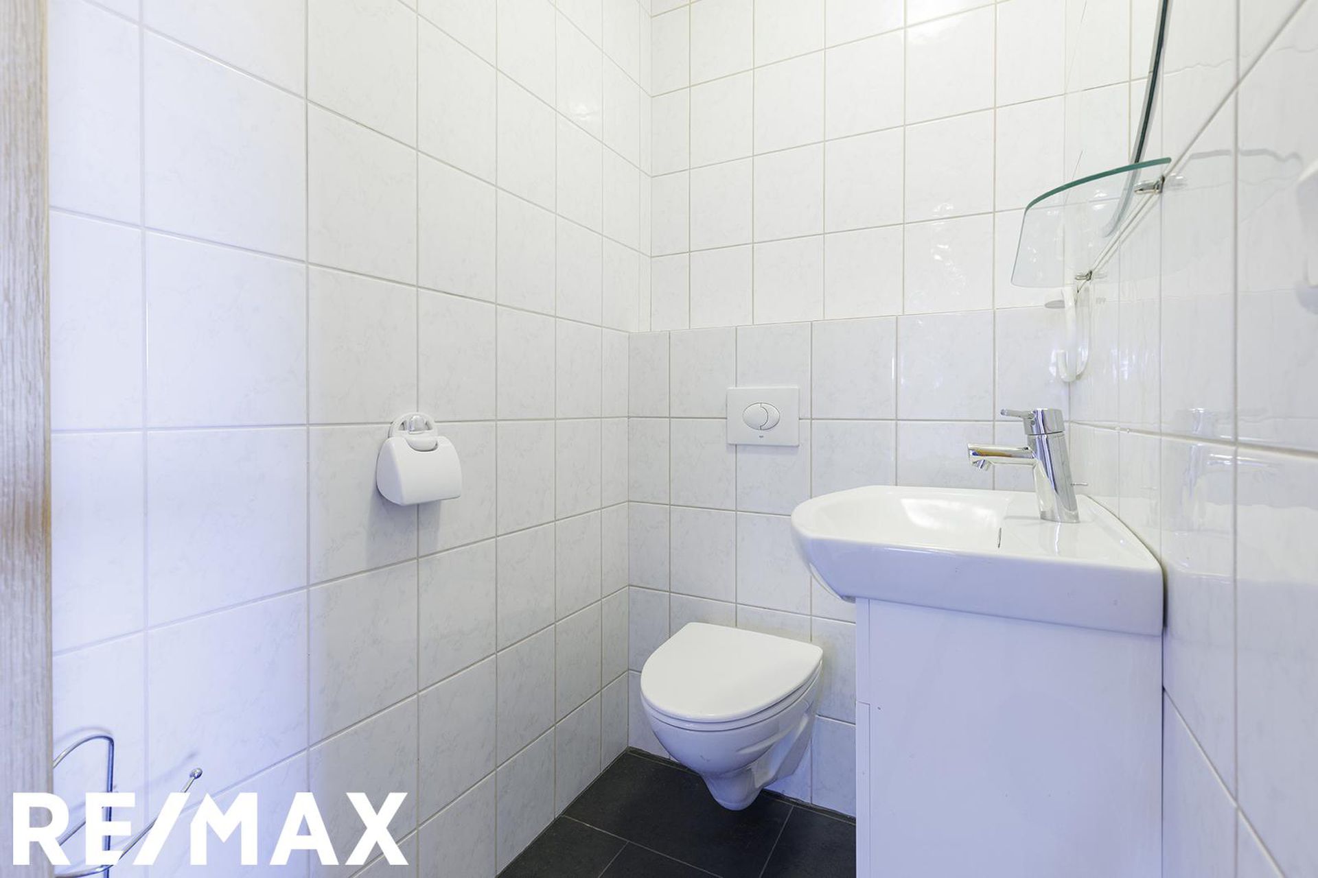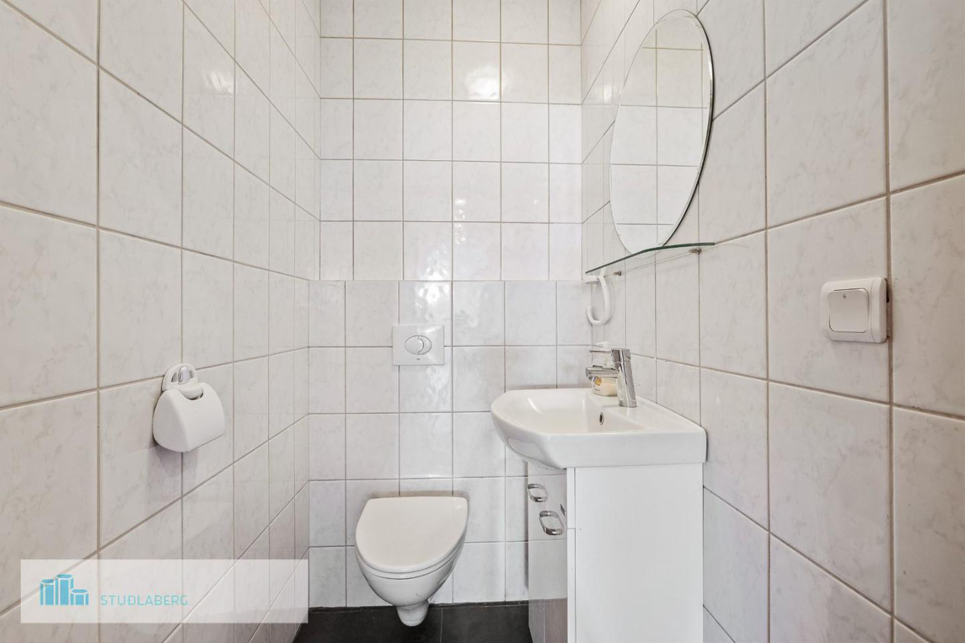 Gestasalerni: Flísalagt í hólf og gólf með ljósum flísum, handlaug og klósetti