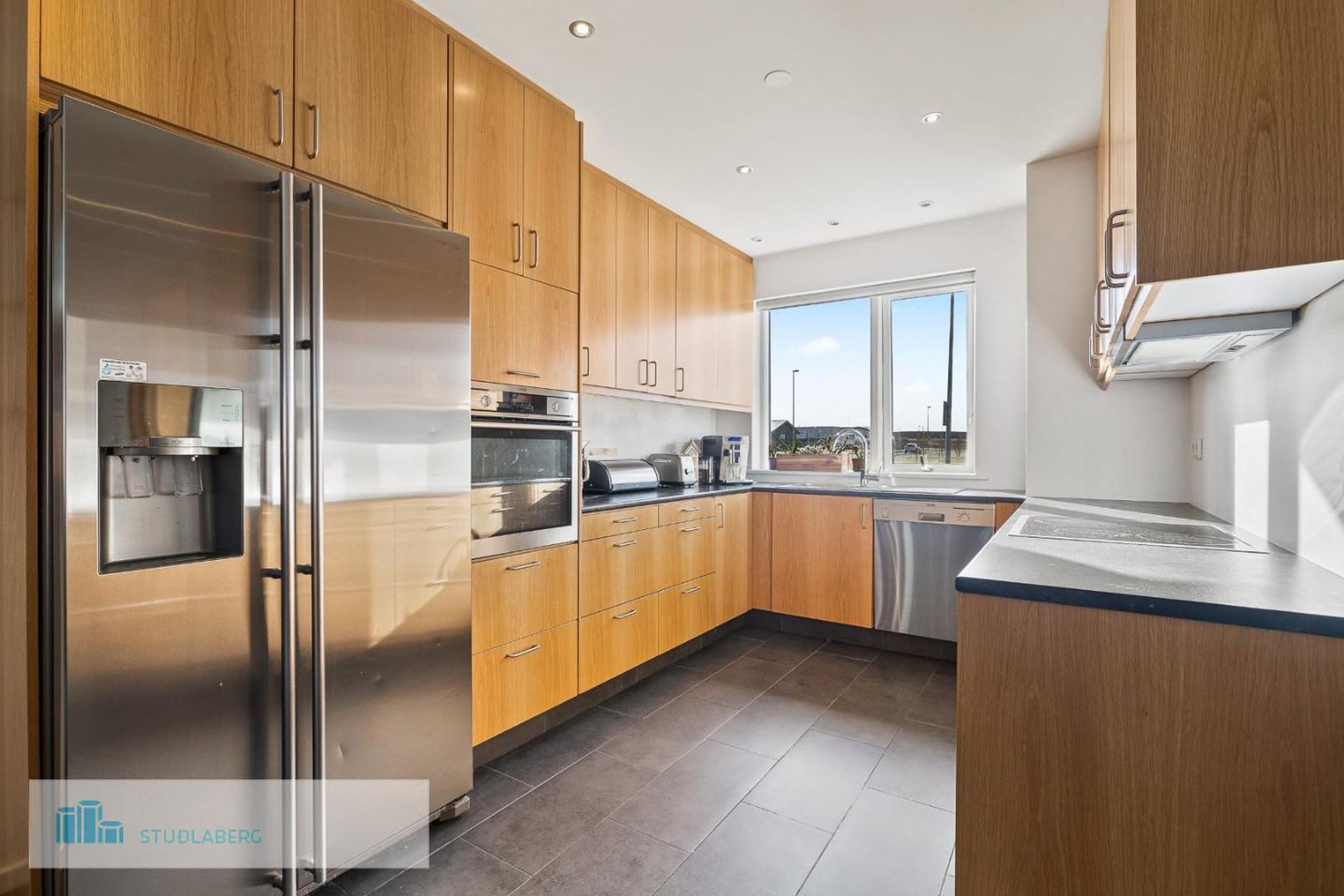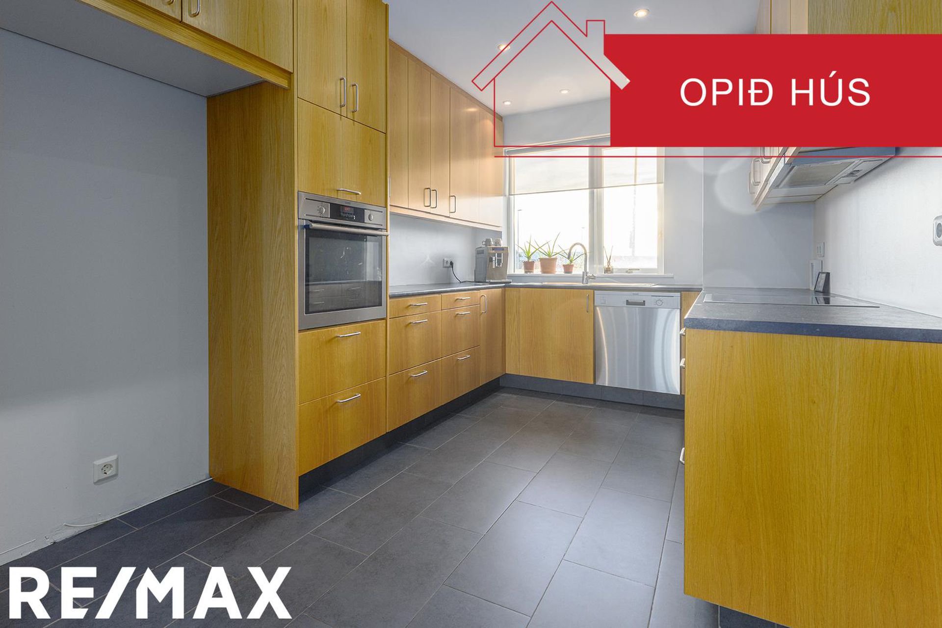 Eldhús: Er með eikarinnréttingu, bakarofni í vinnuhæð. Pláss er fyrir tvöfaldan ísskáp og uppþvottavél, mikið borð og skápapláss.