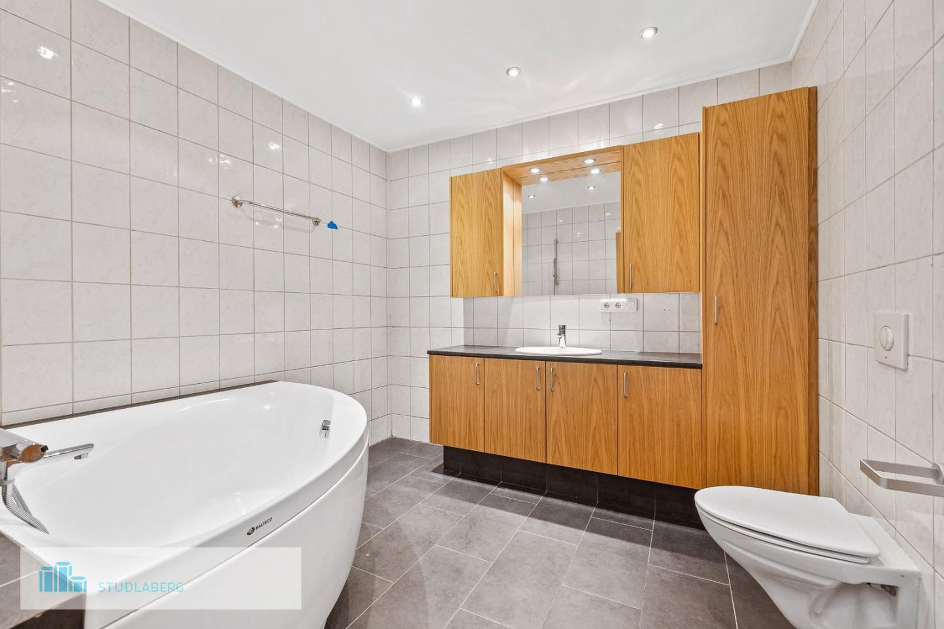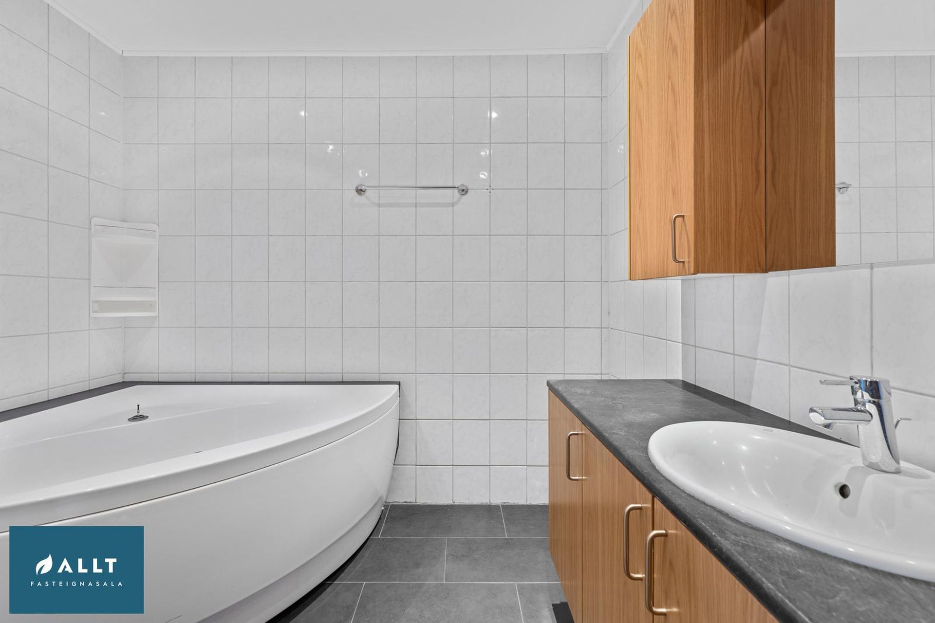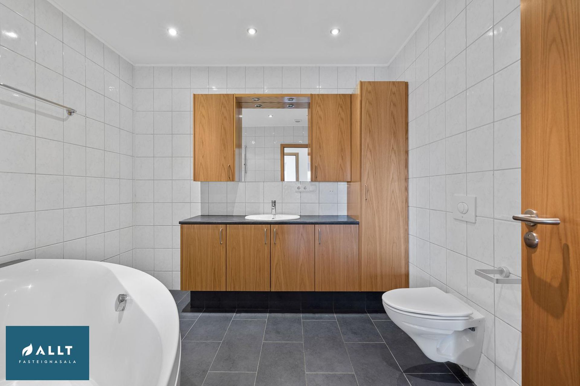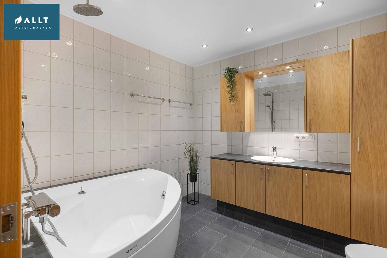 Baðherbergi: Er stórt, flísalagt í hólf og gólf. Eikarinnrétting með bæði efri og neðri skápum, hornbaðkari og upphengdu salerni.