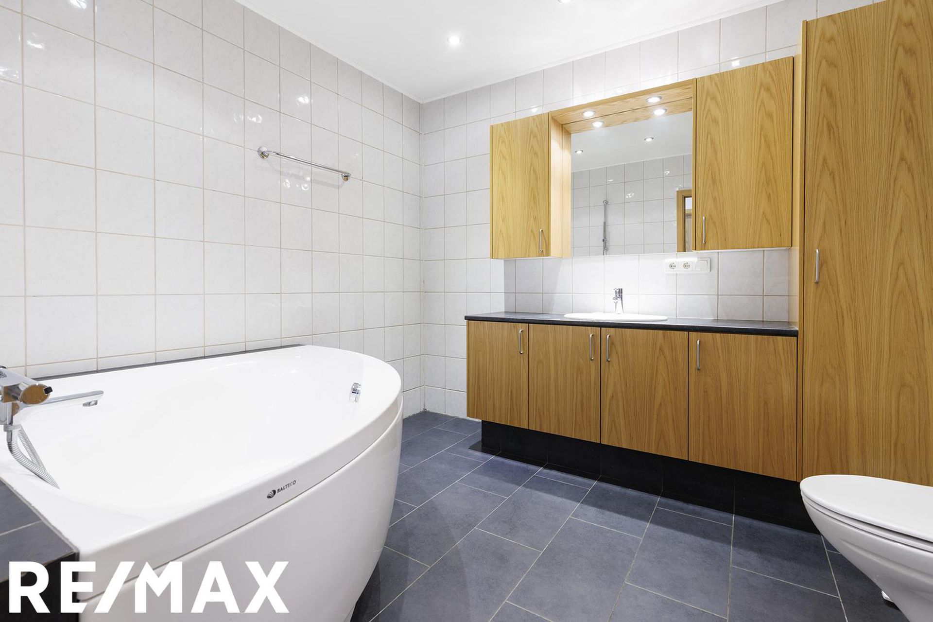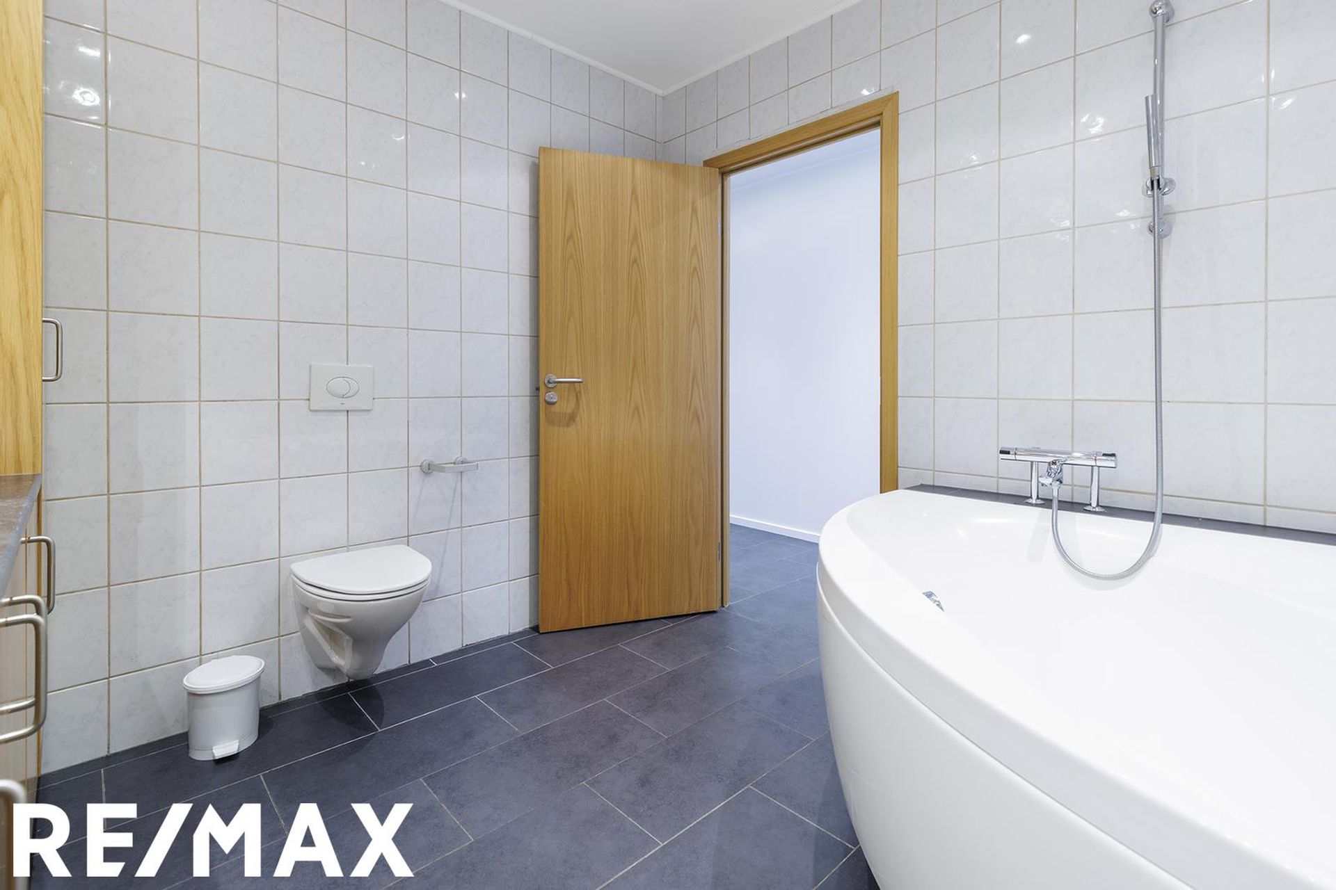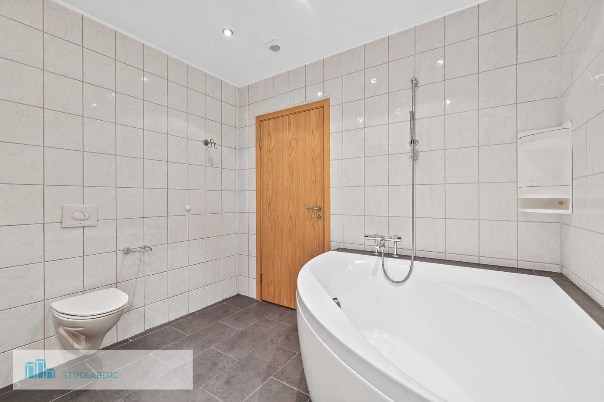 Baðherbergi: Er stórt, flísalagt í hólf og gólf. Eikarinnrétting með bæði efri og neðri skápum, hornbaðkari og upphengdu salerni.
