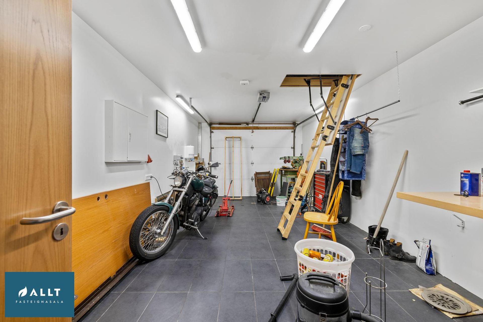 Bílskúr: Er með rafmagnshurð og er innangengur frá íbúð. Einnig er geymsluloft yfir hluta bílskúrs.