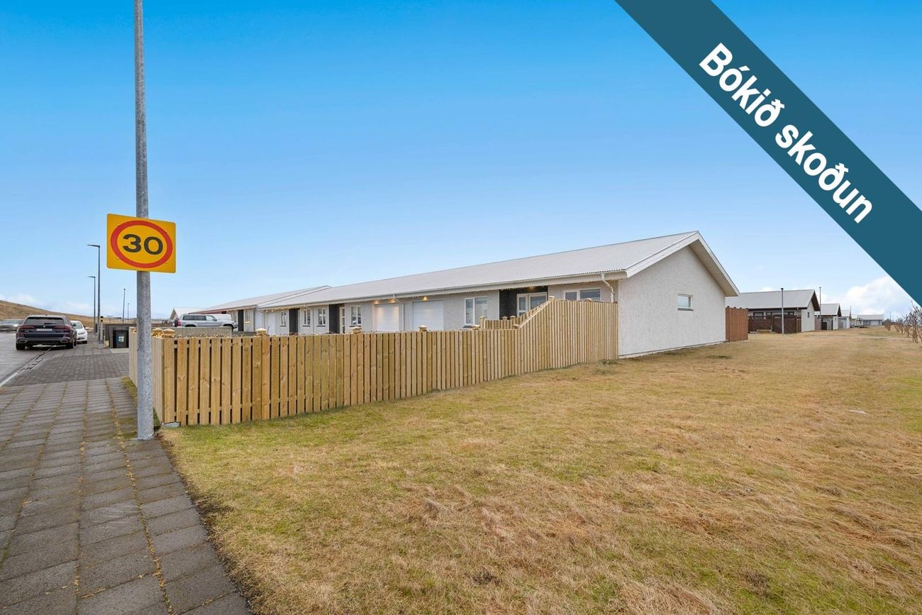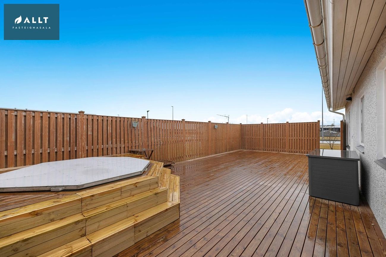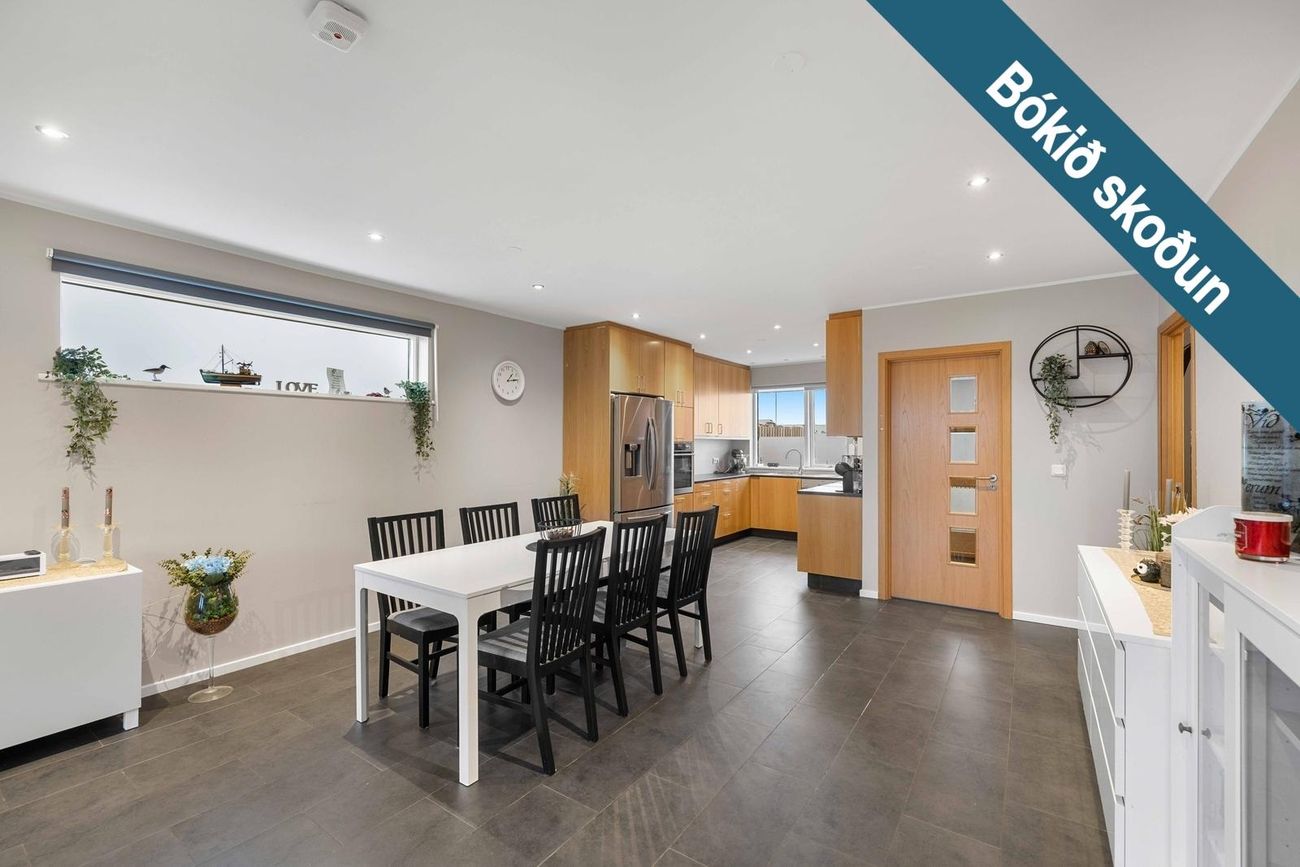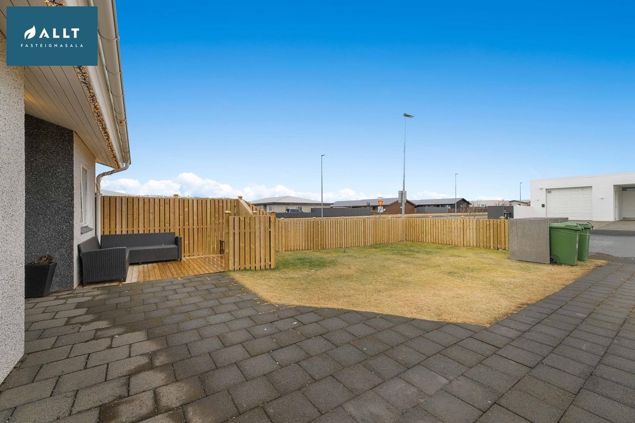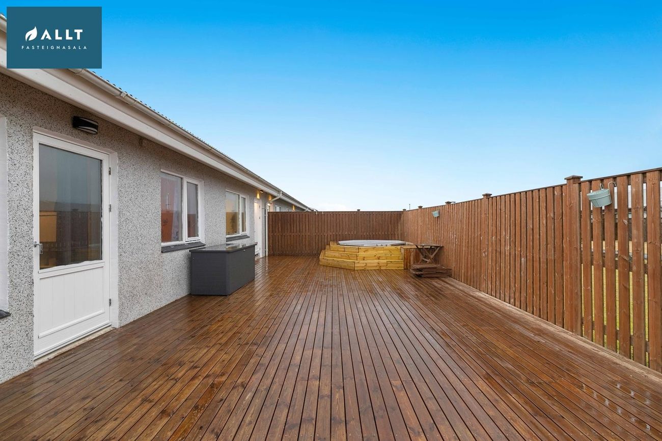 Eignin telur anddyri, opið alrými með stofu, eldhúsi og borðstofu, þaðan er útgengt út á sólpall með heitum potti. Rúmgott baðherbergi með hornbaðkari, gestasalerni og 3 svefnherbergi. Þvottahús/geymsla, þaðan er einnig útgengt út á sólpall, ásamt bílskúr.